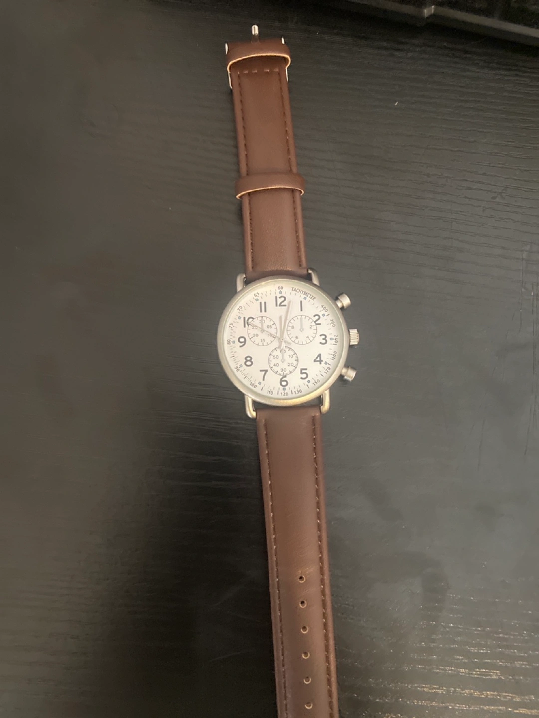 Selling a Tachymeter watch with a stylish brown leather strap. It's in great condition and ready for a new wrist! The watch features a classic design with a white face and chronograph details. Perfect for adding a touch of sophistication to any outfit