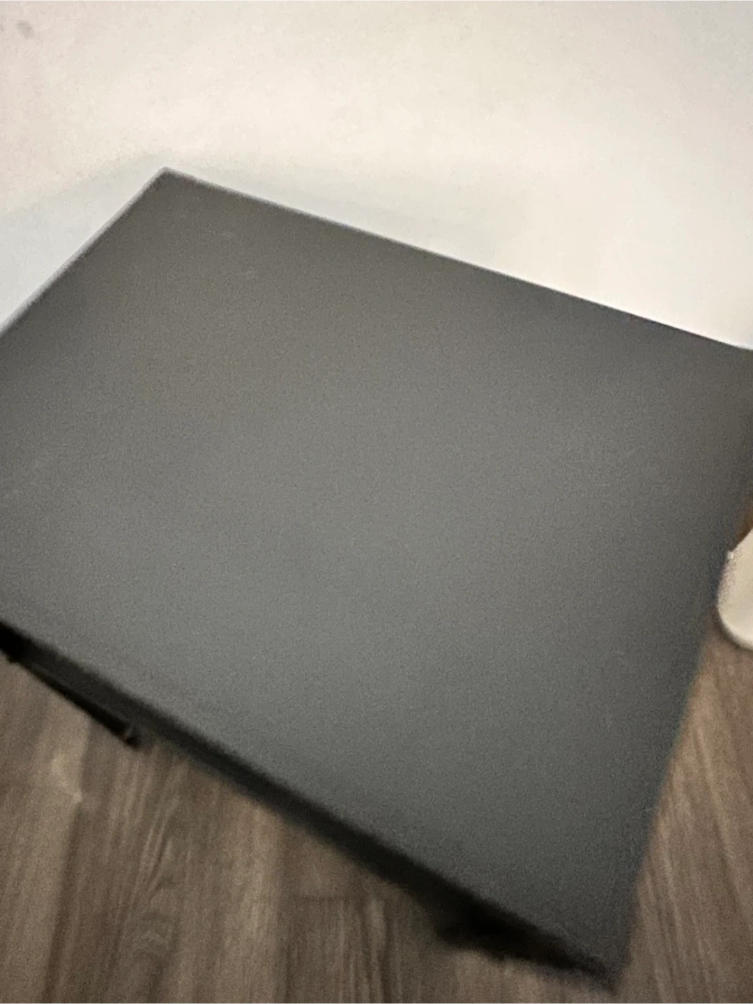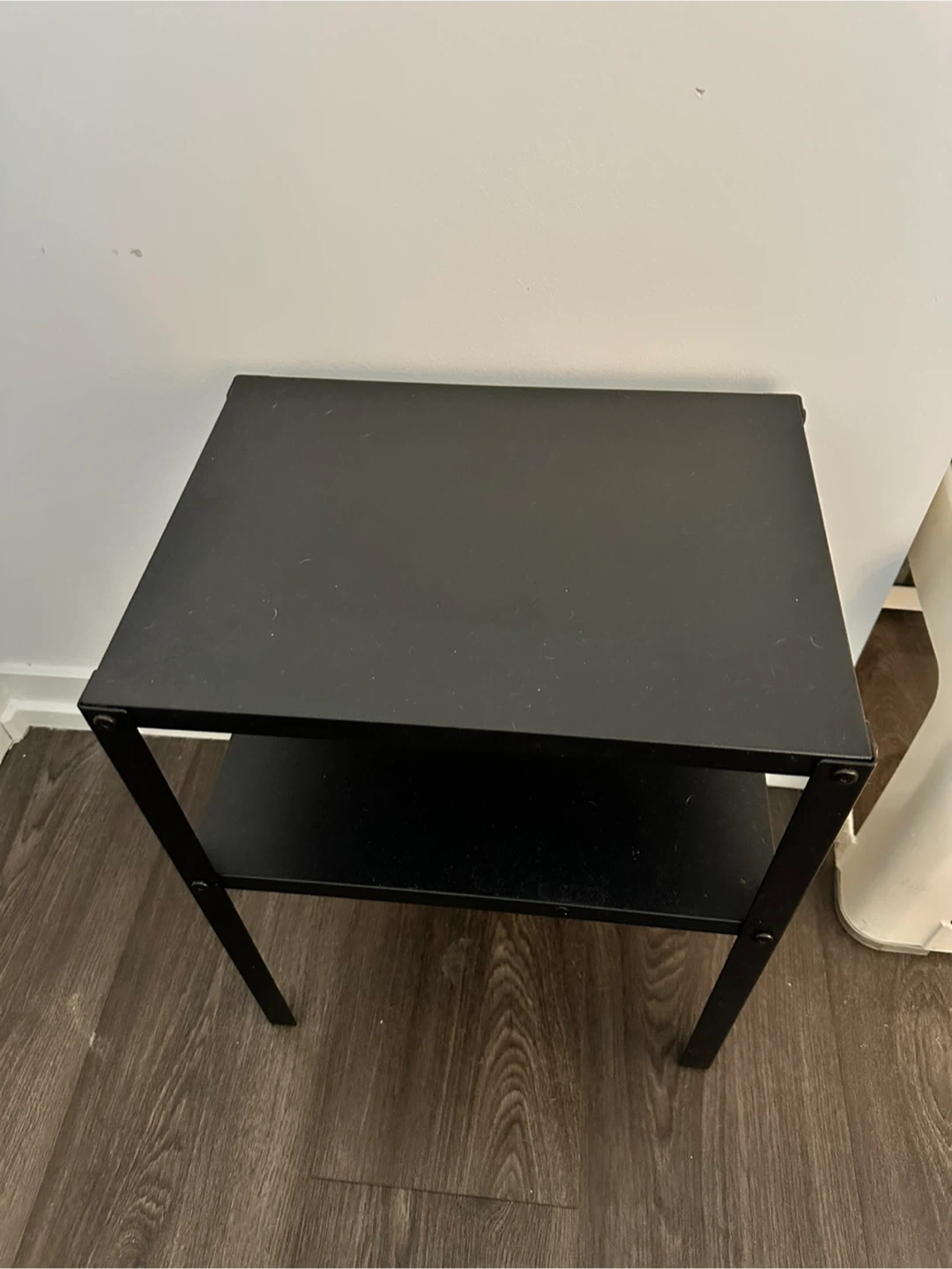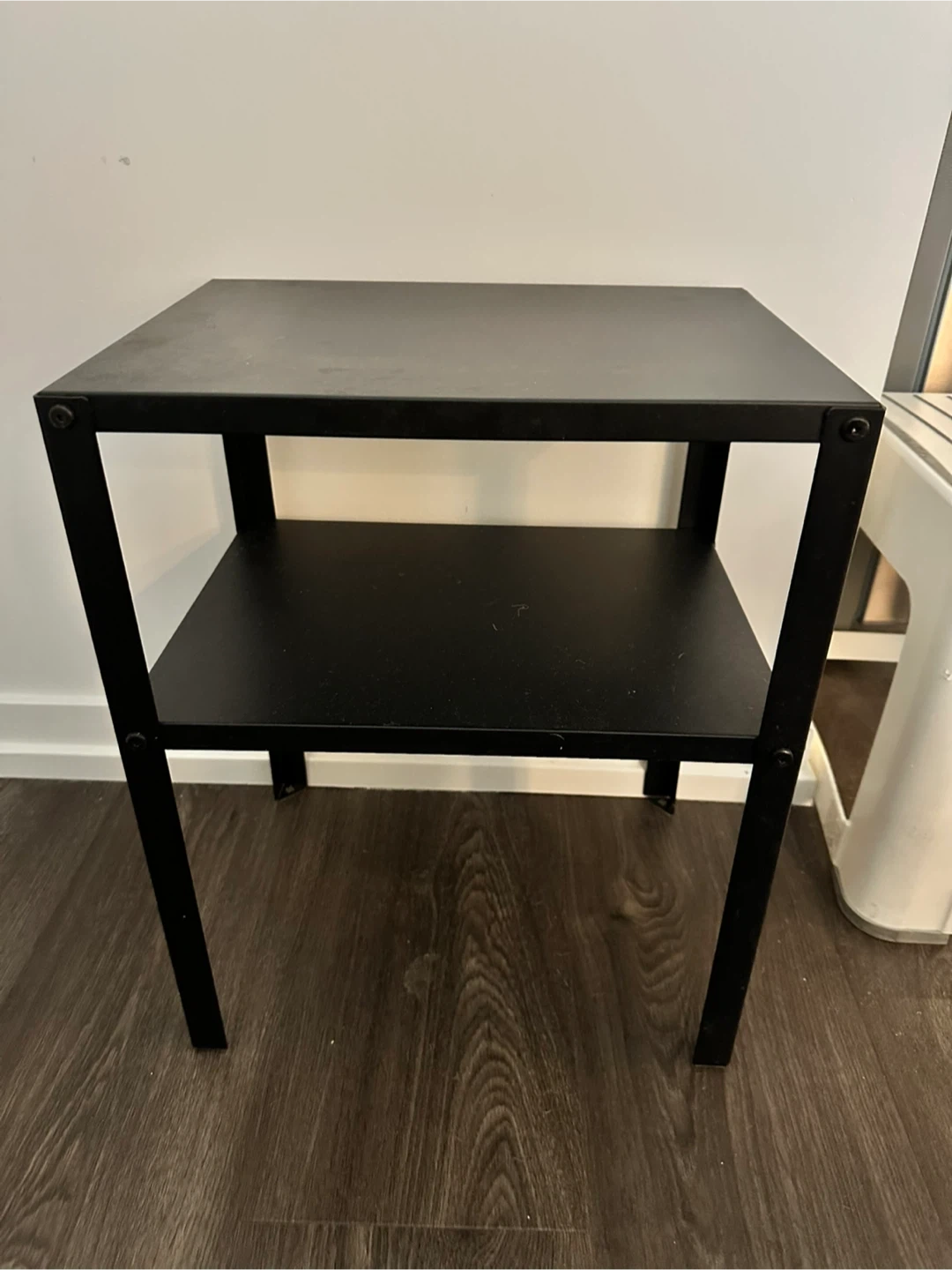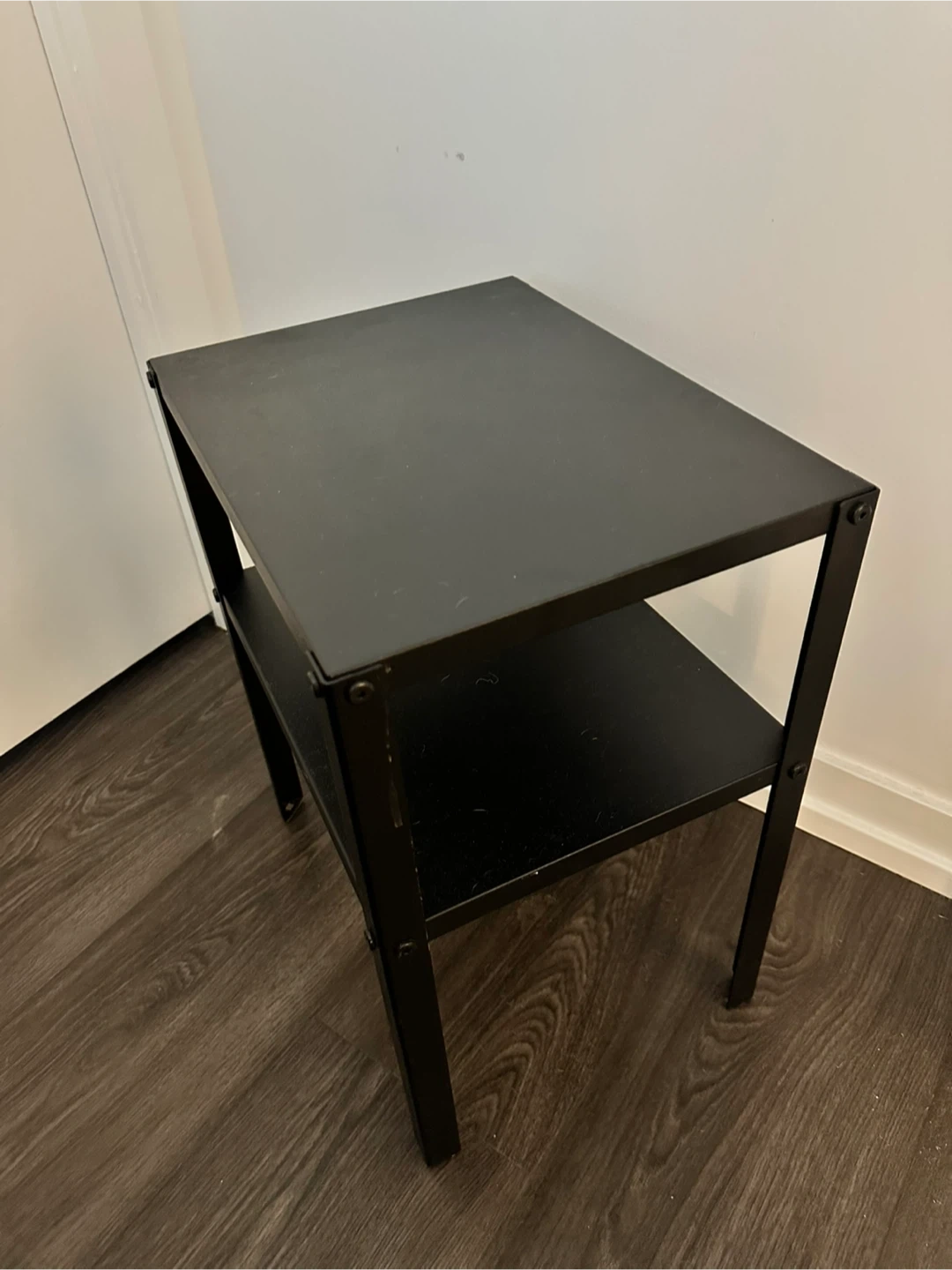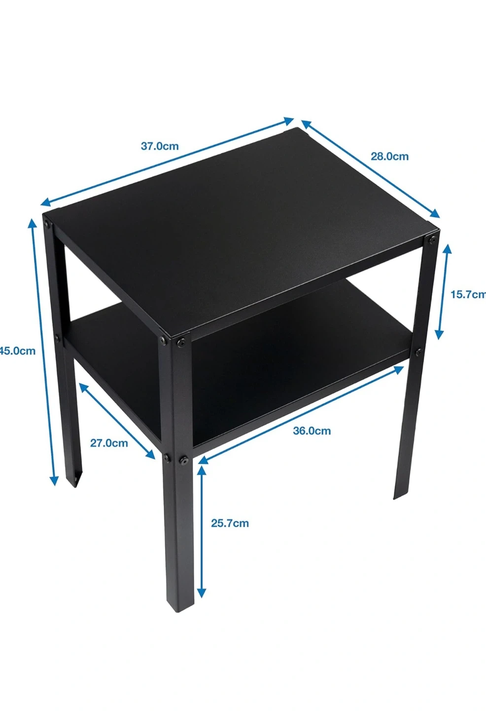 A handy two-tier side table in black. Its compact size is great for small spaces. It's made of metal and measures 45.0cm high. This table would be useful next to a couch or bed.