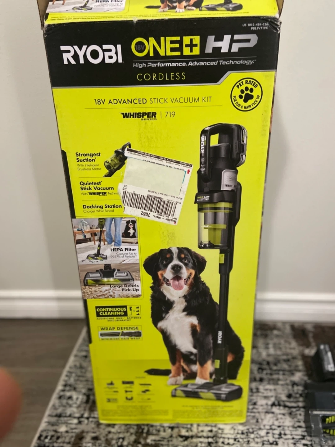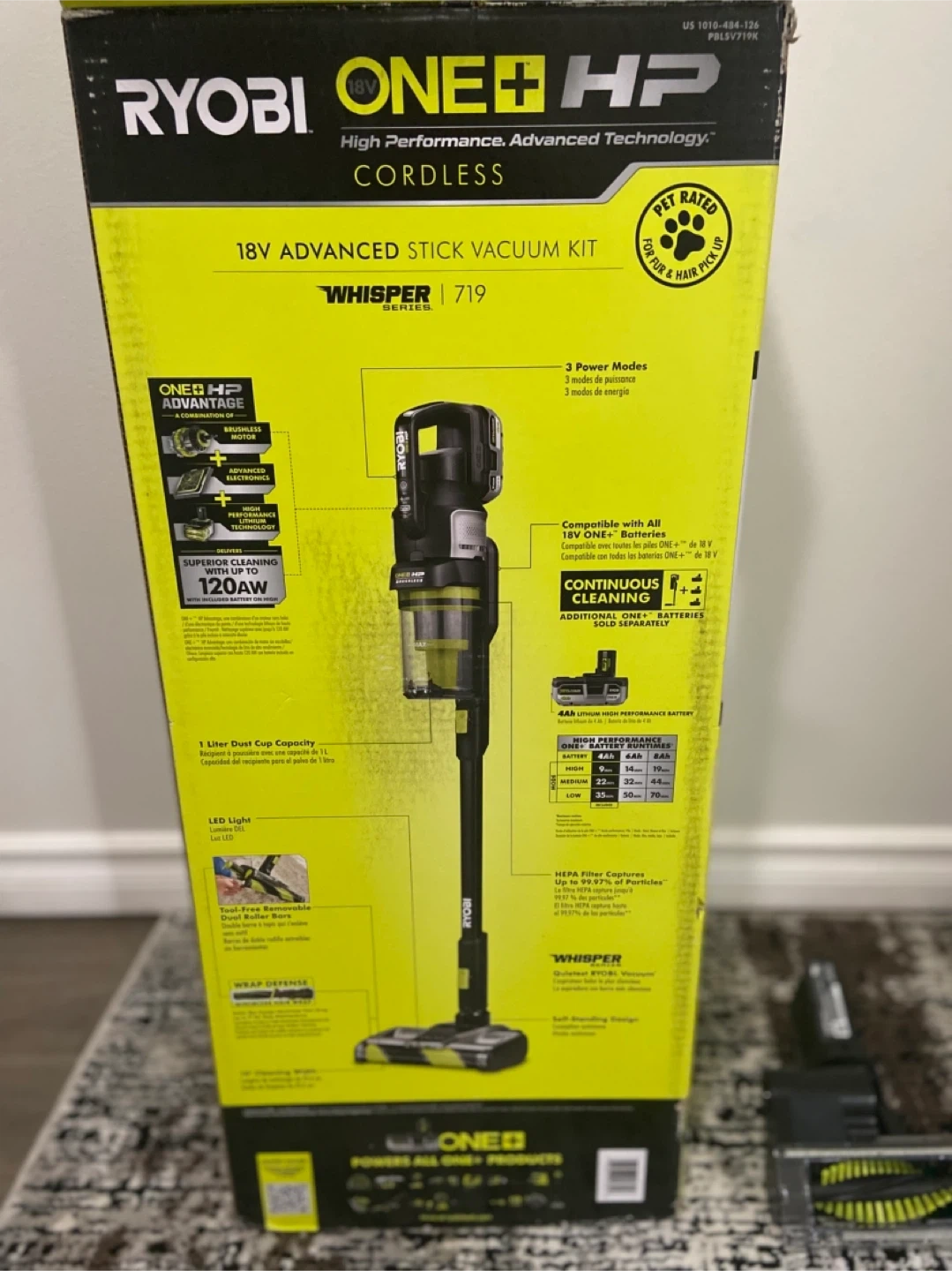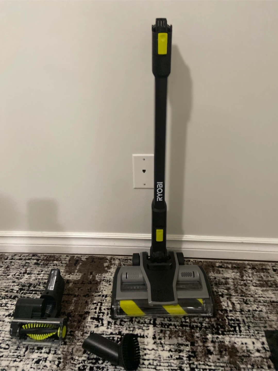 This Ryobi ONE+ HP stick vacuum kit comes with a 4.0Ah Lithium High Performance battery and a charging dock. It features strong suction and a HEPA filter. It's great for pet hair pickup and has 12 cleaning configurations with included accessories.