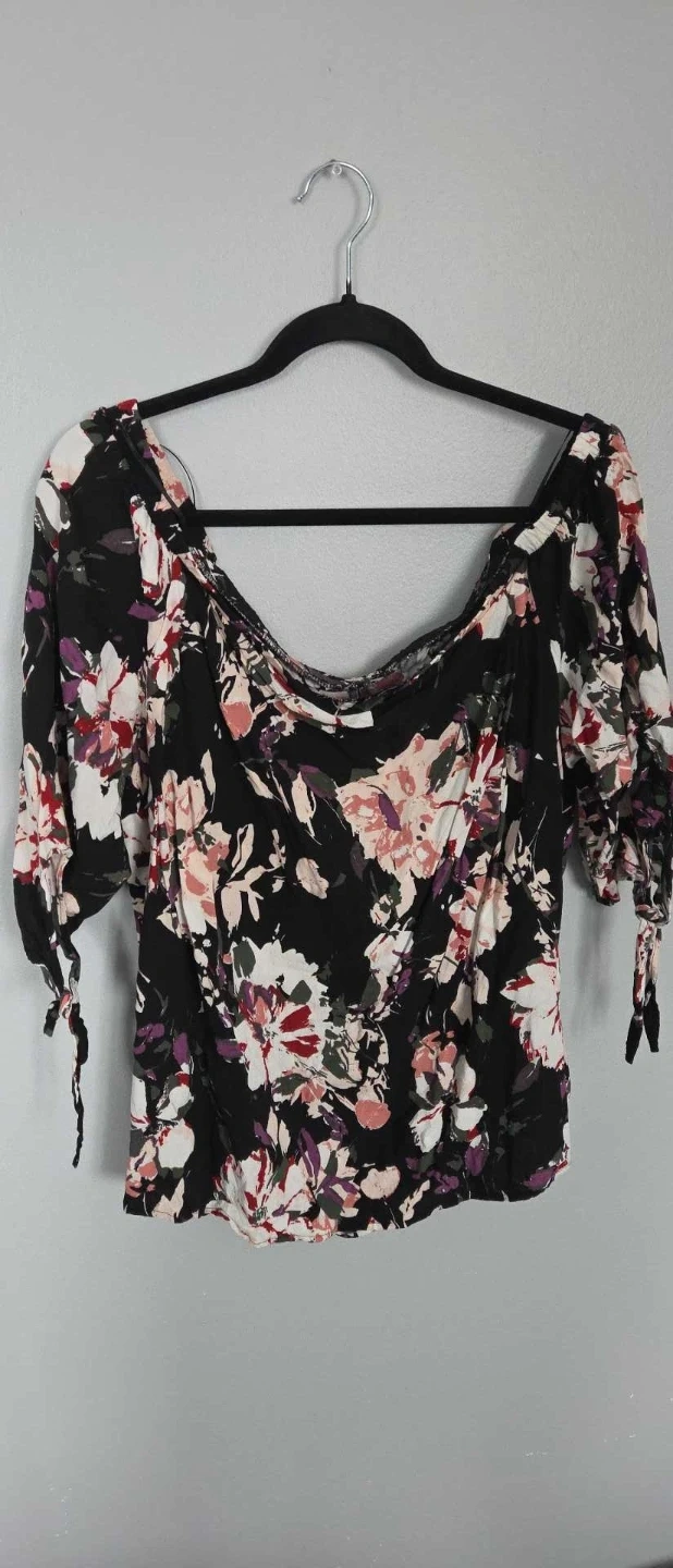 This George Plus top features a black background with a vibrant floral print. It's designed with an off-the-shoulder neckline and tie details on the sleeves. Made from a comfortable fabric, this blouse is perfect for casual wear.