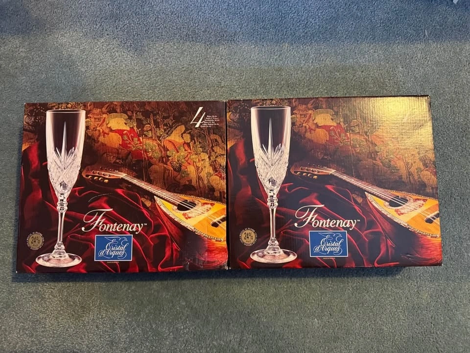 Cristal d'Arques Longchamp champagne flutes. The glasses feature a cut crystal design and are presented in their original "Fontenay Cristal d'Arques" branding boxes.