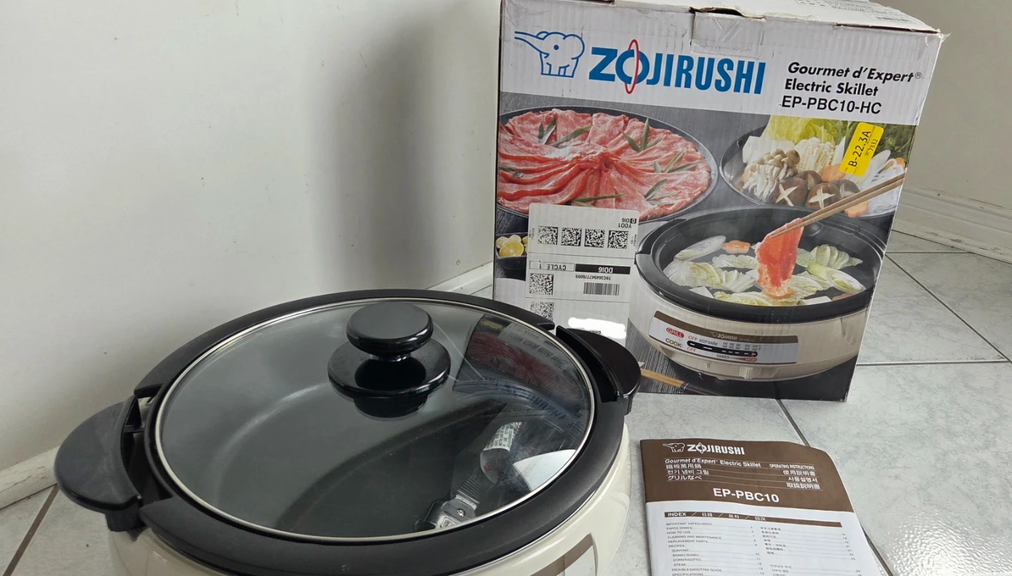 This Zojirushi electric skillet is a versatile cooking appliance. It includes the main body, a lid, and the power cord. The temperature control dial adjusts from OFF to SIMMER, COOK, KEEP WARM, and GRILL settings.