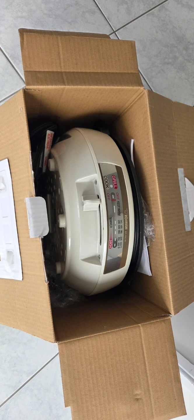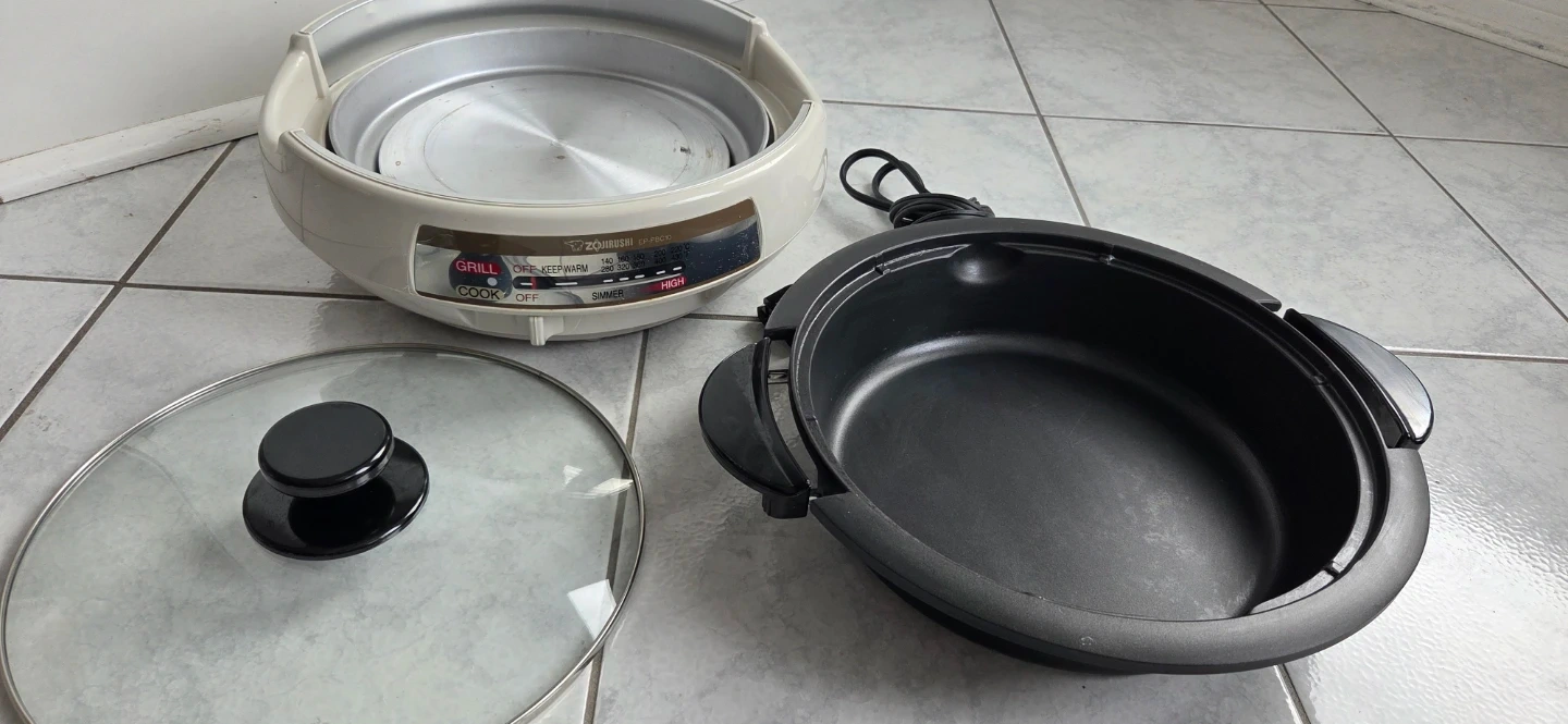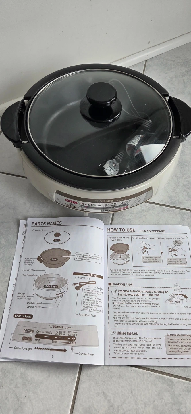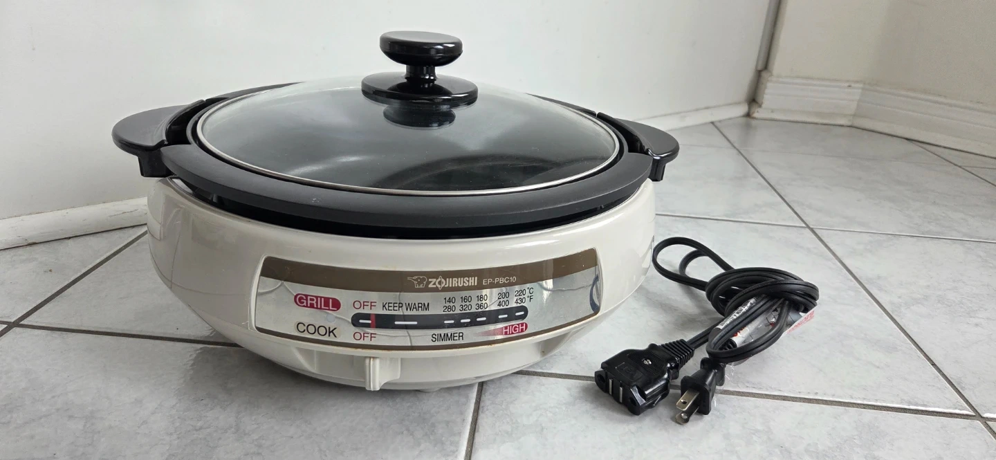 This Zojirushi electric skillet is a versatile cooking appliance. It includes the main body, a lid, and the power cord. The temperature control dial adjusts from OFF to SIMMER, COOK, KEEP WARM, and GRILL settings.