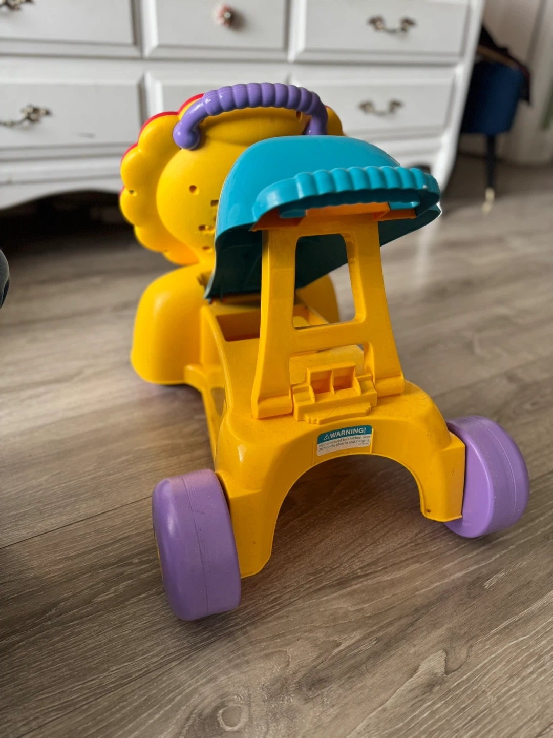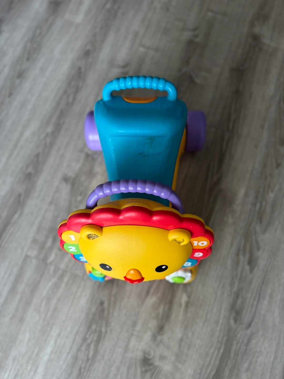 This is a Fisher-Price lion walker and activity toy. It's yellow and blue with colourful numbers and letters. It helps little ones learn to walk and play! It plays music and songs..