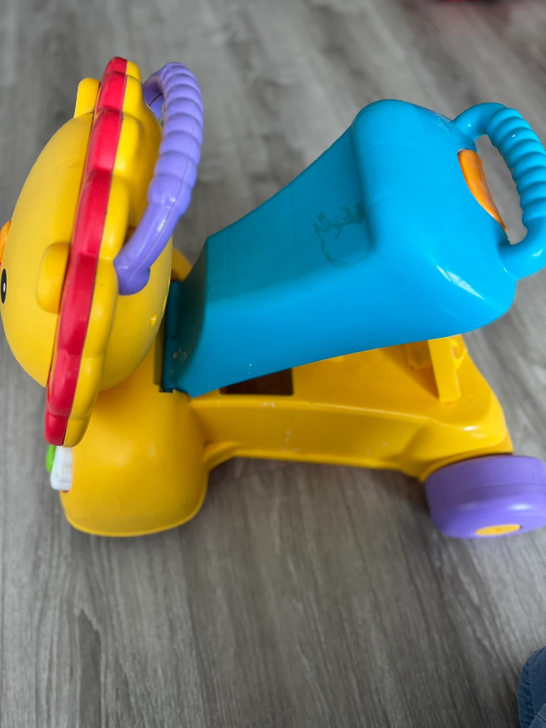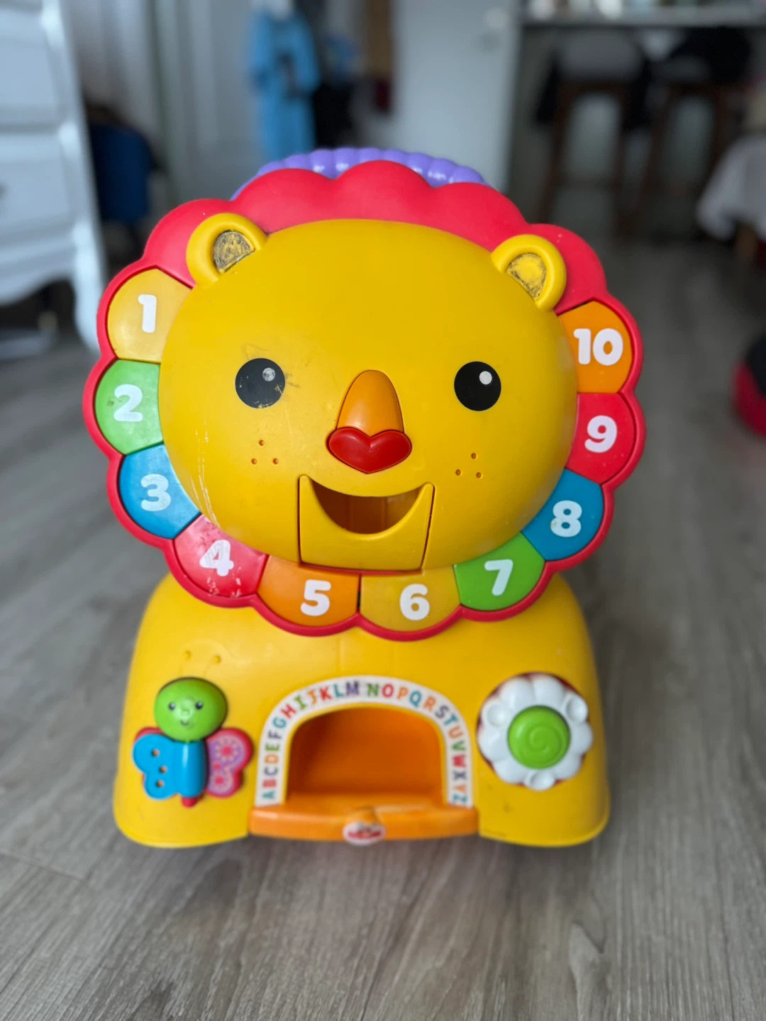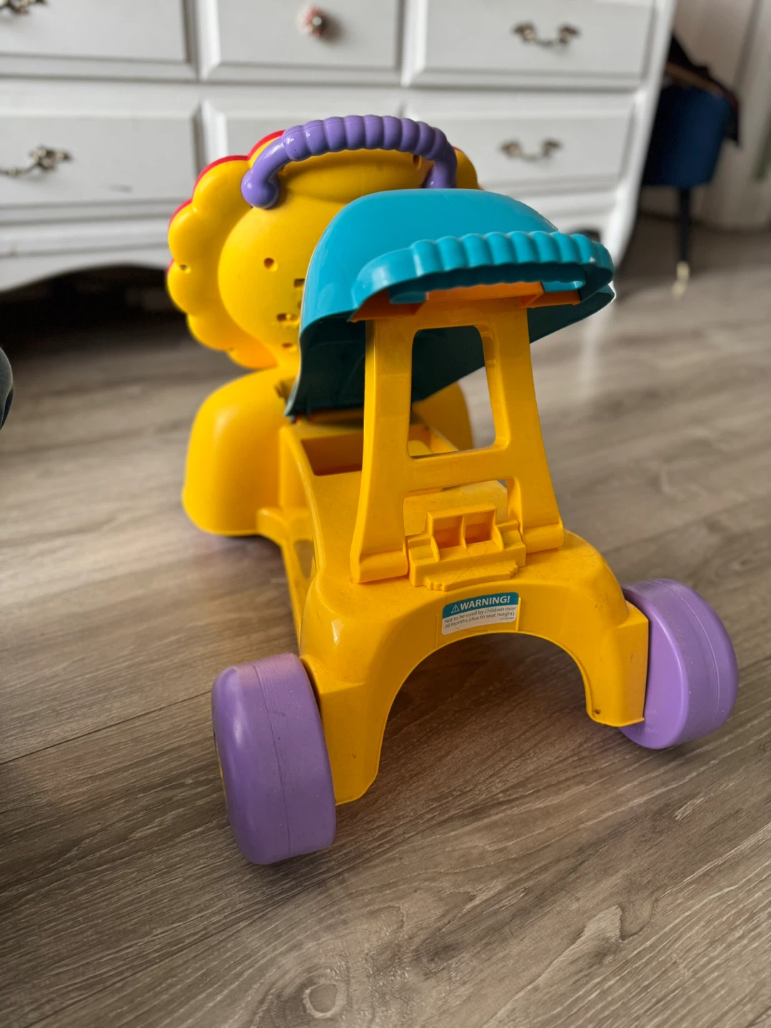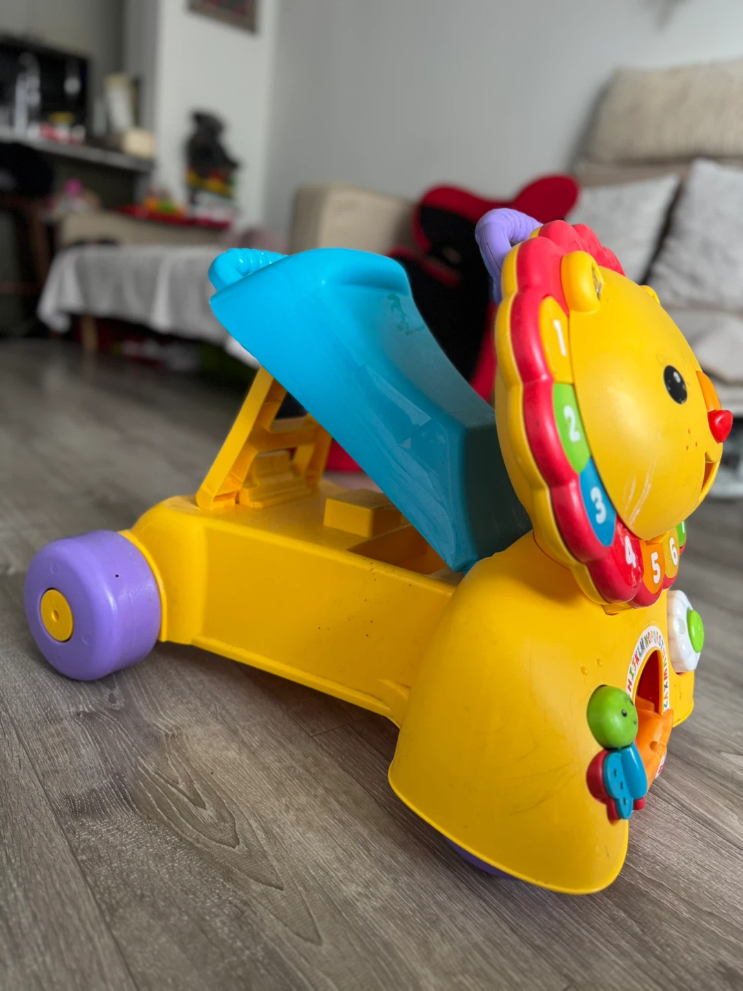 This is a Fisher-Price lion walker and activity toy. It's yellow and blue with colourful numbers and letters. It helps little ones learn to walk and play! It plays music and songs..