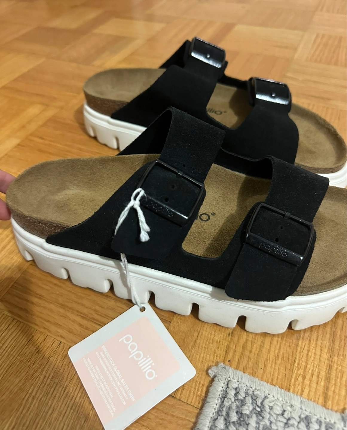 Black sandals. Feature two adjustable straps. Sandals have a white sole. A great way to relax at the end of a long day.