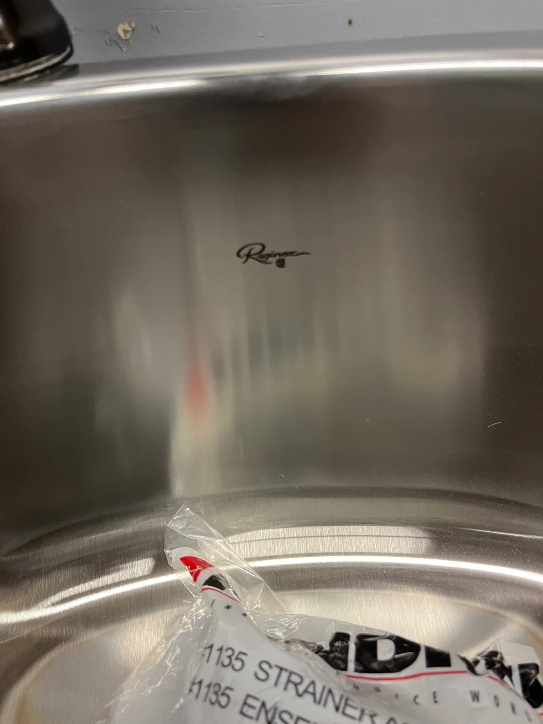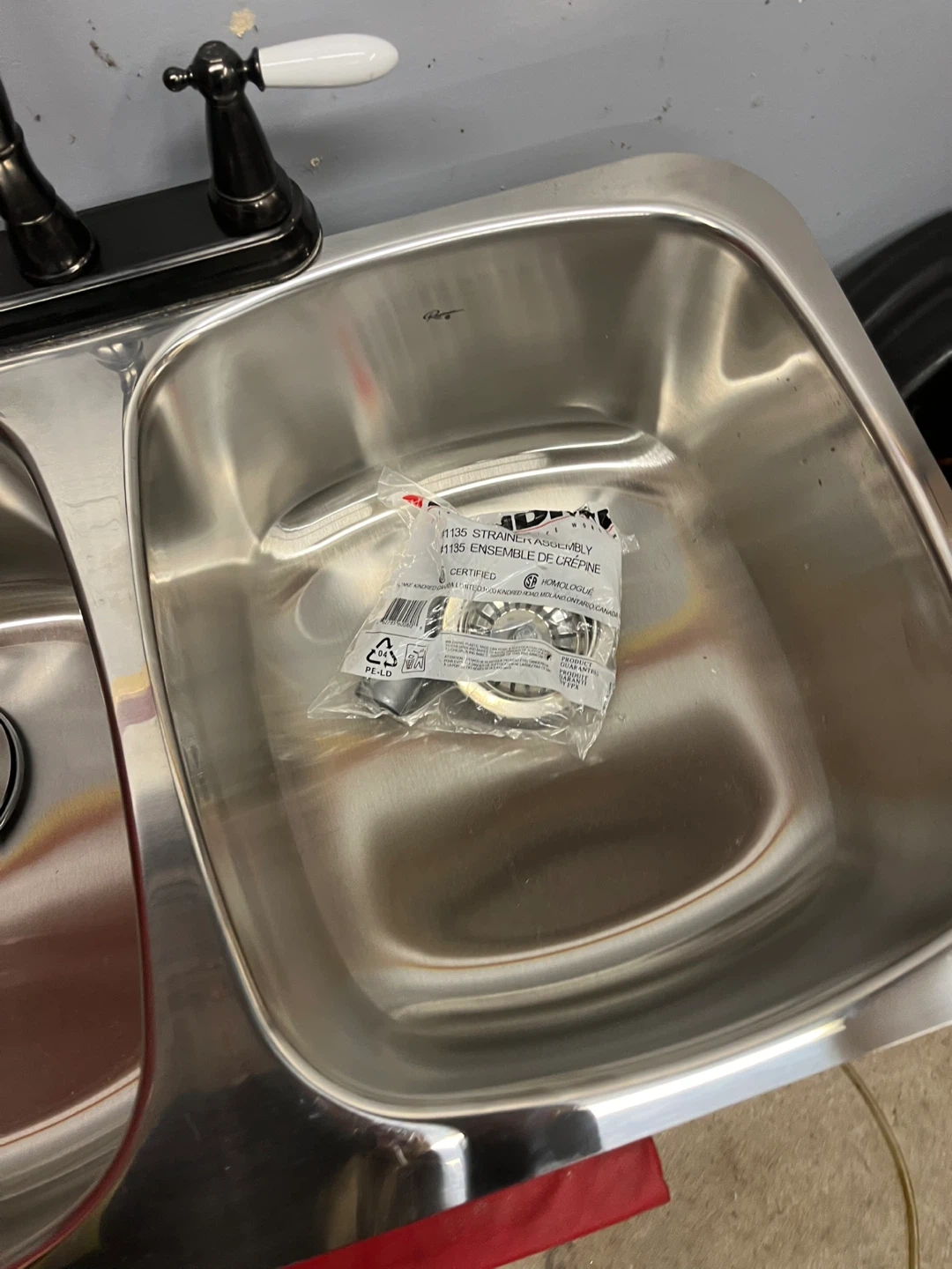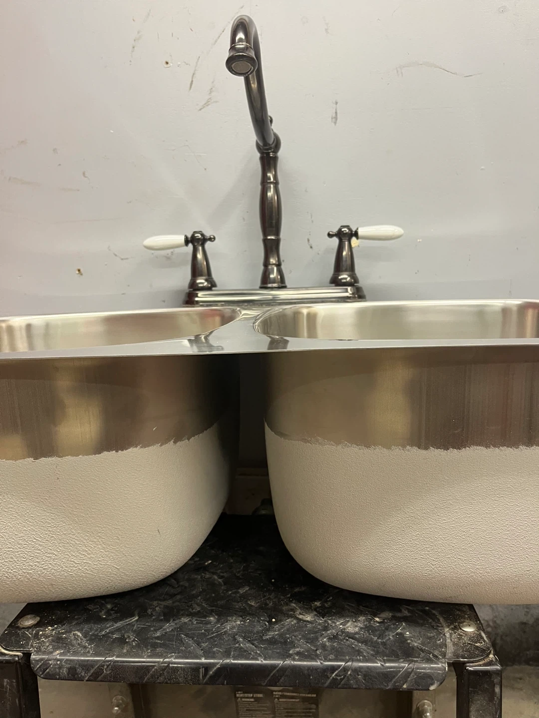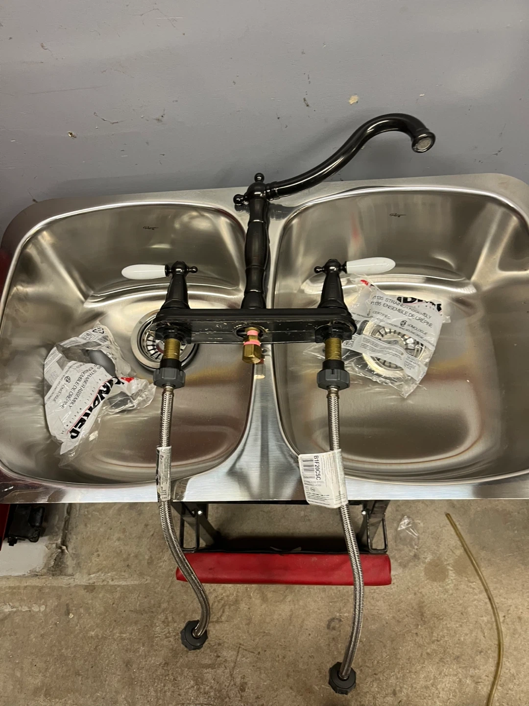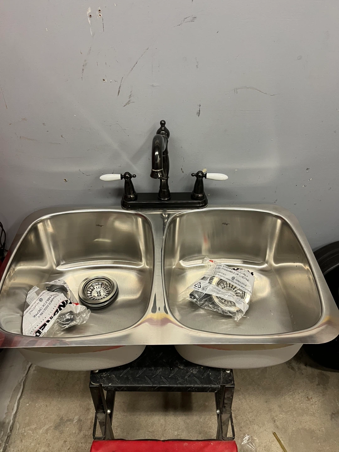 This is a new stainless steel double basin under mount kitchen sink with a black vintage style faucet and two strainers. Includes all necessary mounting hardware and drain assemblies.