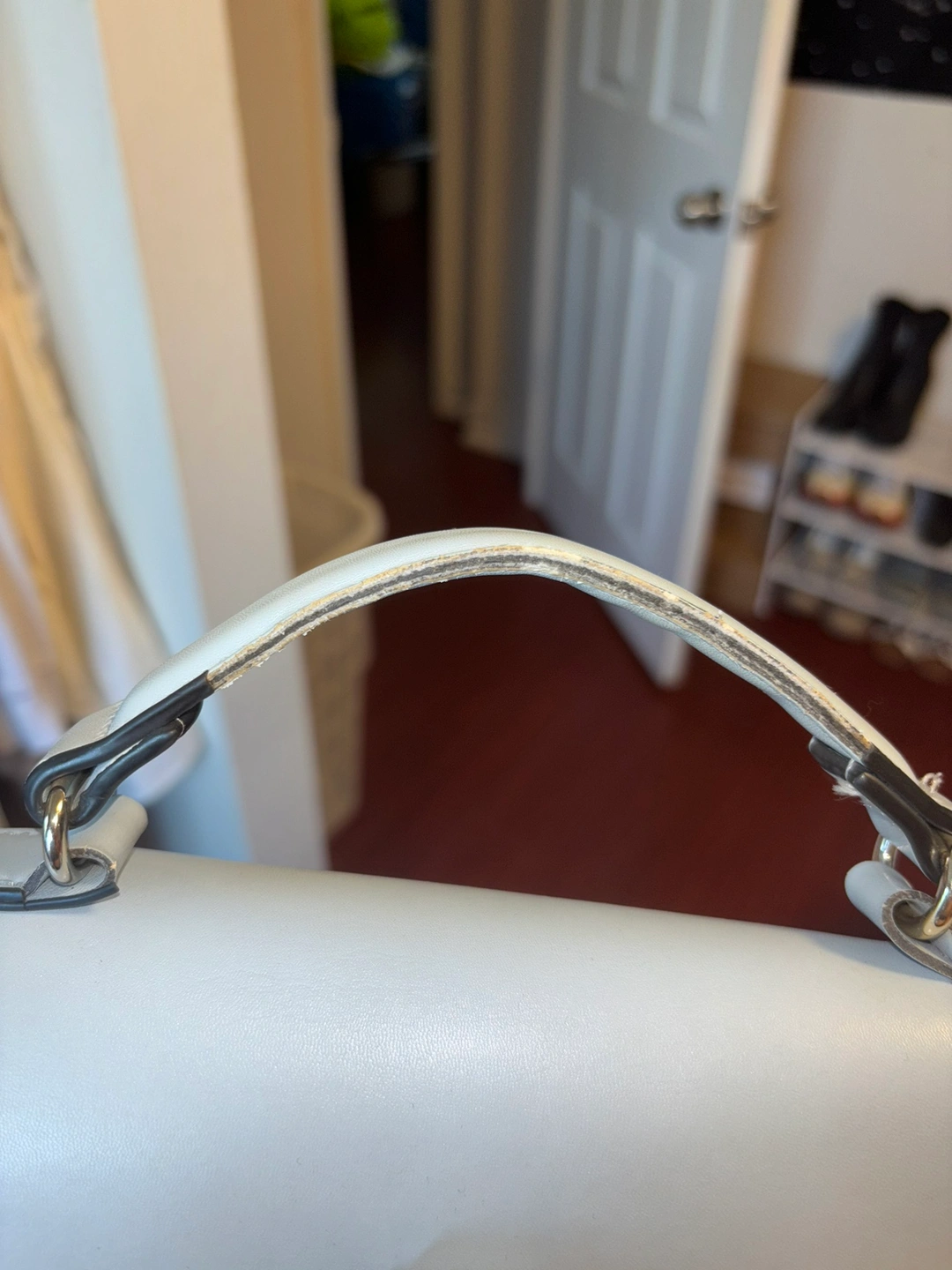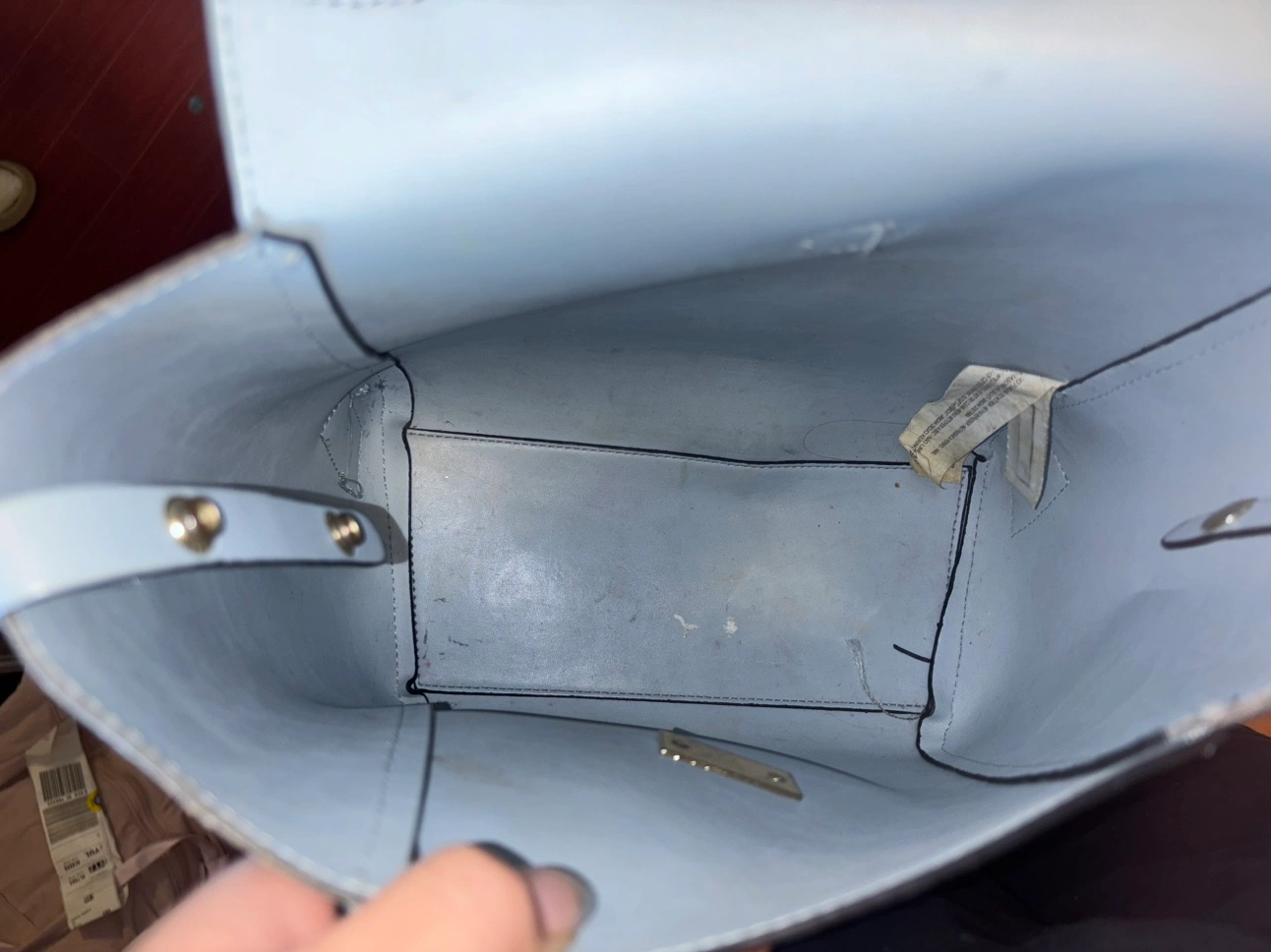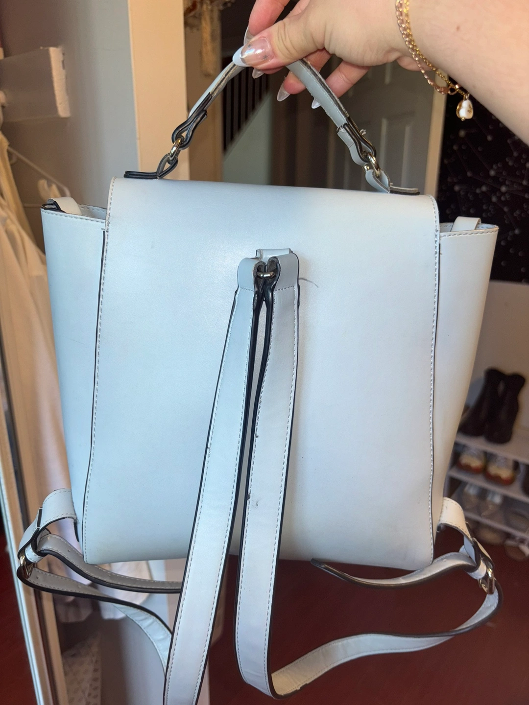 Blue Backpack from faux leather. Very stylish medium size backpack. The handle has signs of wear and tear and there are minor stains.