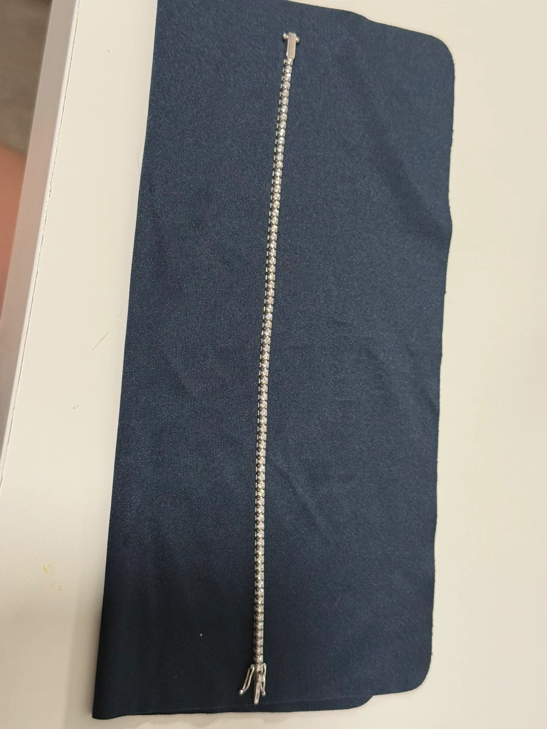 A delicate tennis bracelet with sparkly stones. It has a secure clasp closure. This bracelet's timeless design makes it a great addition to any jewelry collection.