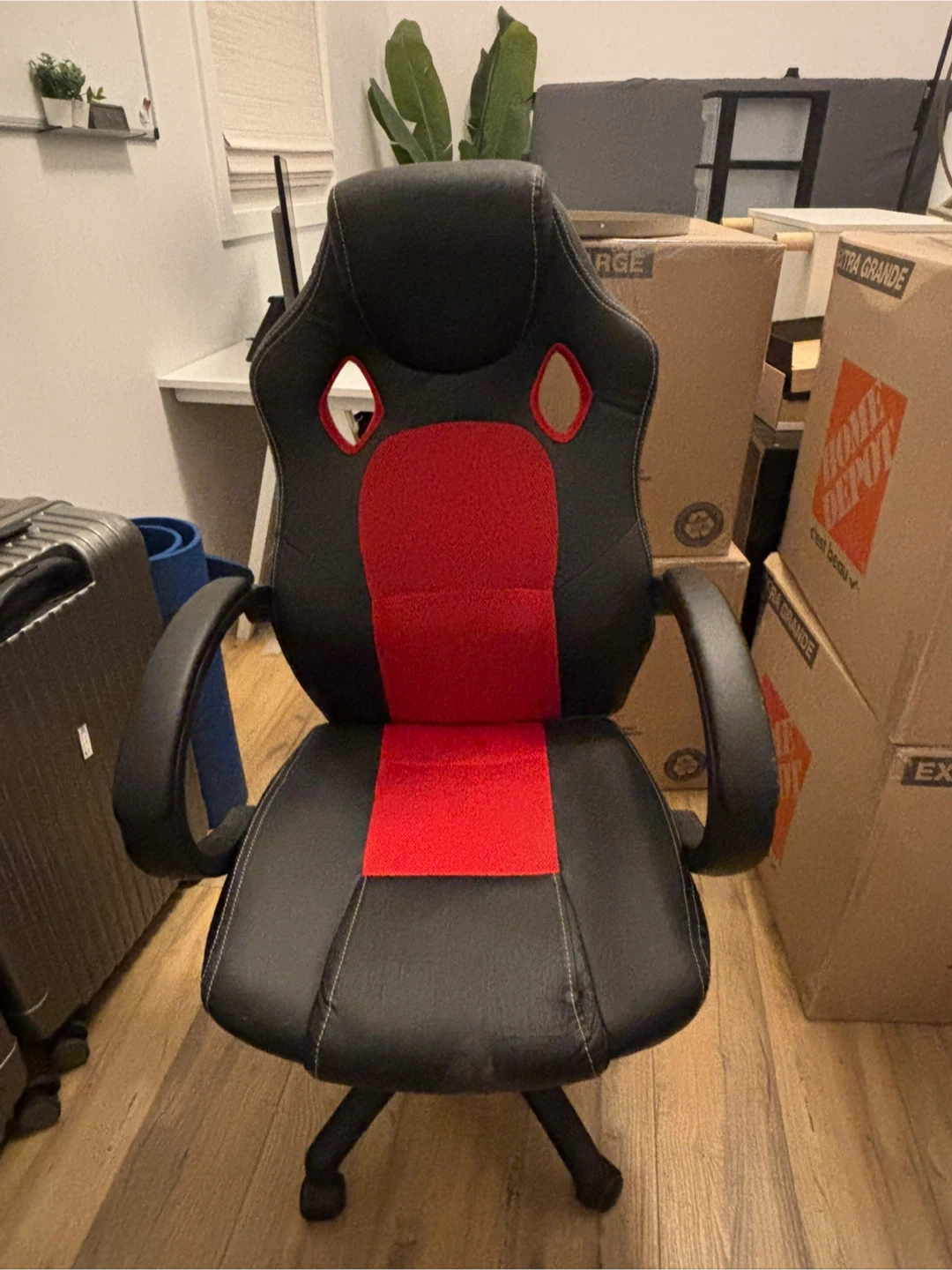 Selling a gaming chair in good condition. It features a black and red design. Perfect for long gaming sessions or working from home!