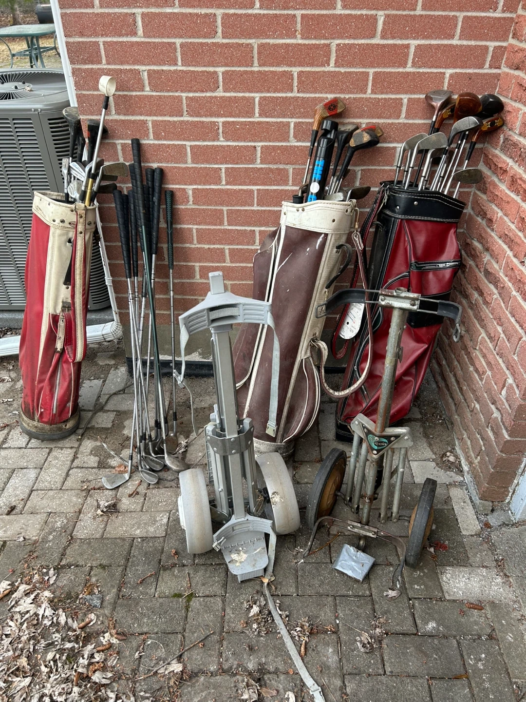 Three golf bags filled with clubs are included. Two push carts are also part of this lot. Sell as lot for $80. Or negotiate for parts.