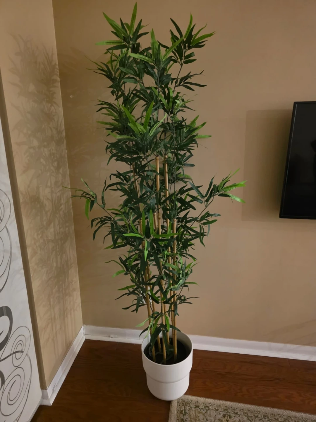 A tall artificial bamboo tree in a modern white pot. It's designed to add a touch of greenery to your home without the upkeep of a real plant.