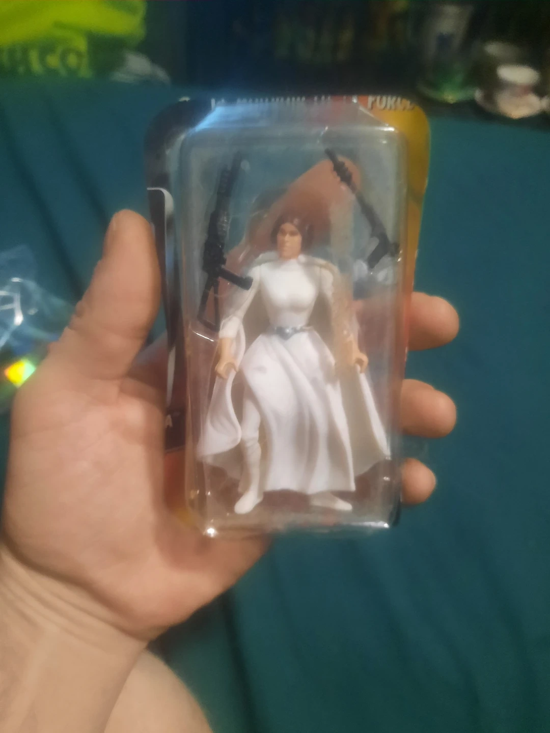 This is a Princess Leia action figure in her white gown. It comes with two blasters. The packaging shows some wear but the figure appears to be in good condition.