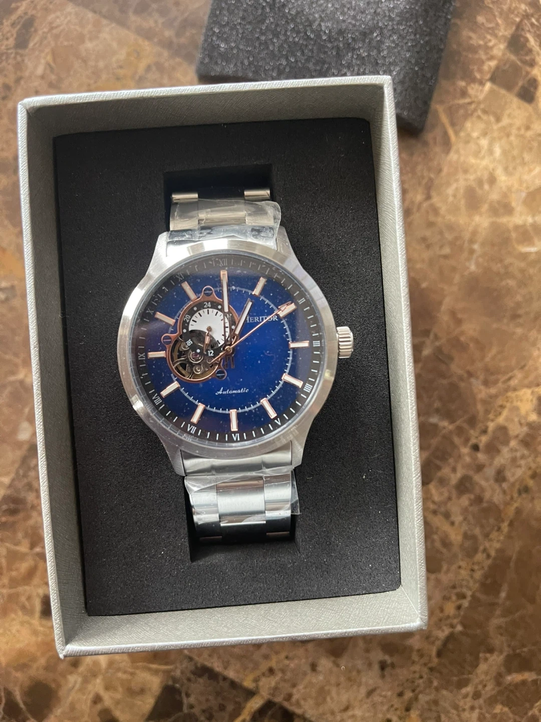 Selling a Heritor Automatic Oscar Semi-Skeleton Bracelet Watch in blue. It comes in the original box. This watch is a stylish accessory that is sure to catch attention! We can negotiate