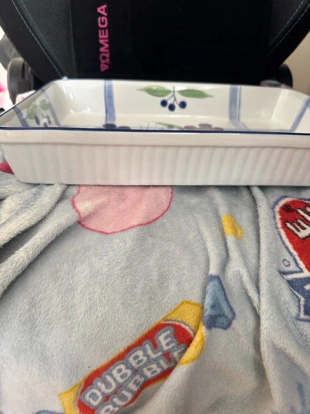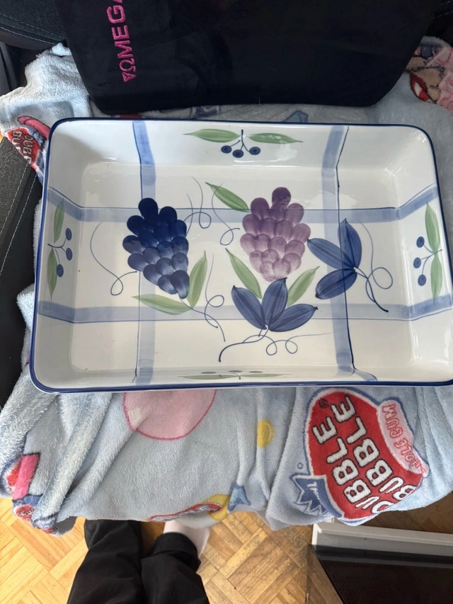 This is a used Hallmark baking dish in good condition, ready for your culinary creations! It has a charming grape design, perfect for adding a touch of whimsy to your kitchen. Although it has been previously loved, it's still ready to bring joy to your cooking adventures. I've priced it fairly based on similar items I've seen online. It's waiting for a new home, could it be yours? Also, don't worry, if the ad is up, it's still available! Cash accepted.