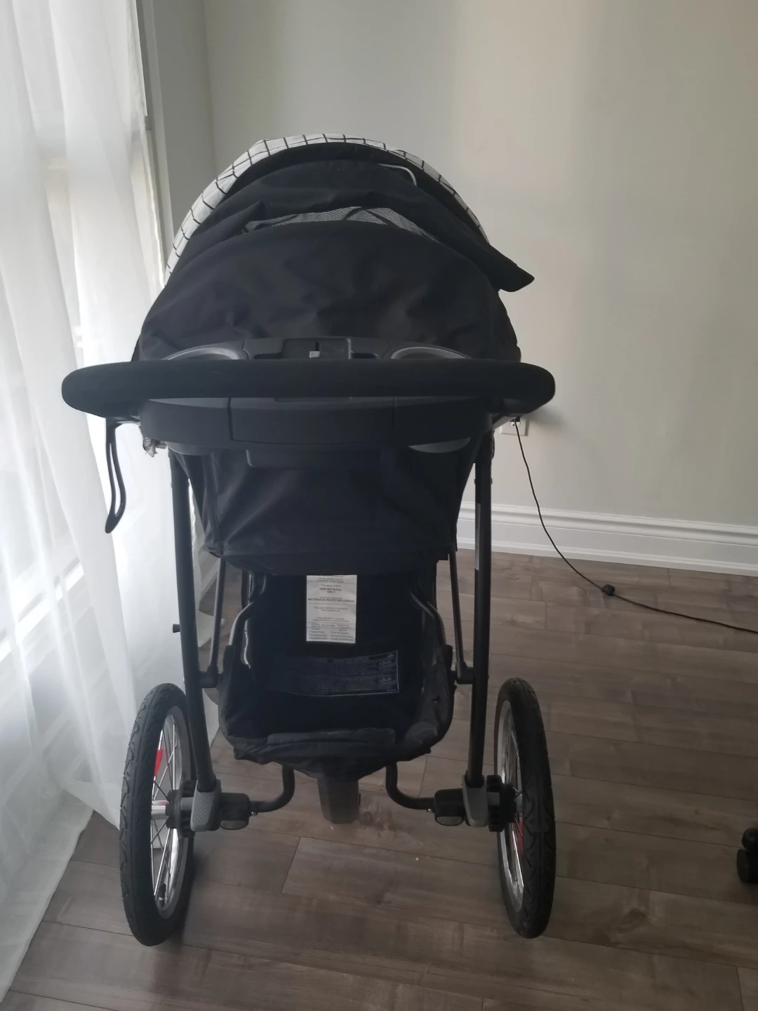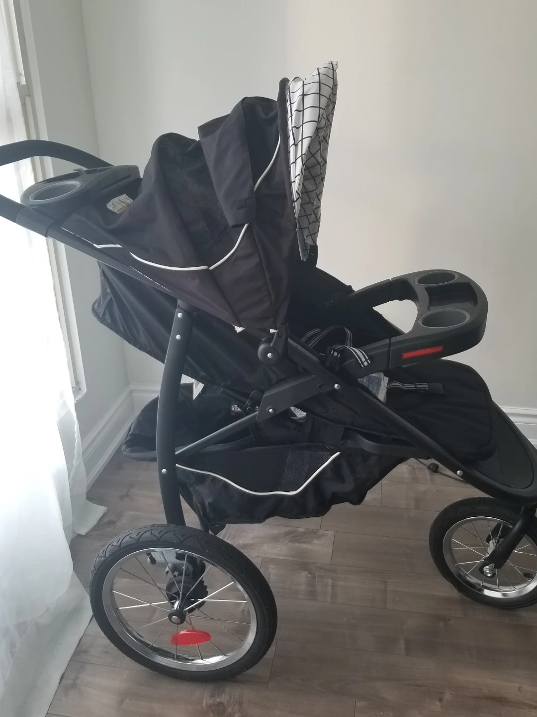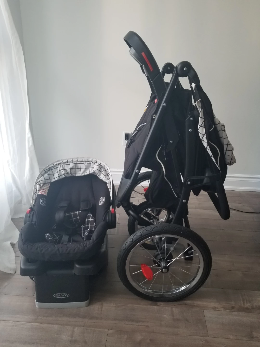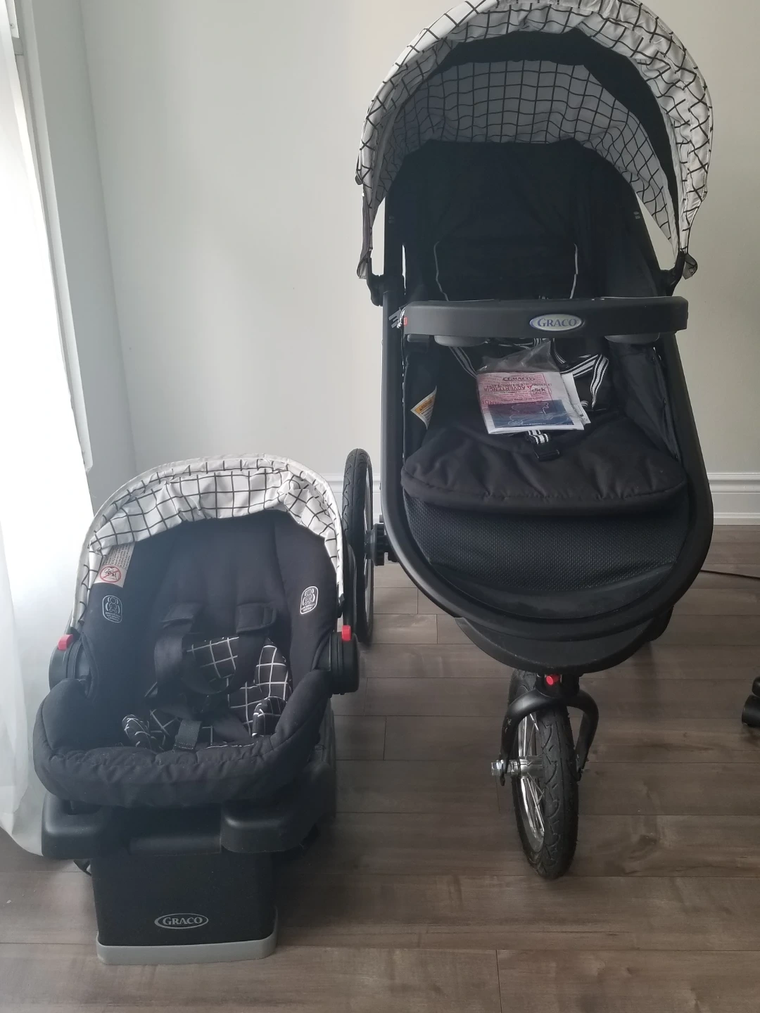 Graco jogging stroller and infant car seat. Black and white gingham pattern. Stroller features cup holders and large wheels. Car seat is compatible with the stroller. Includes instruction manuals.