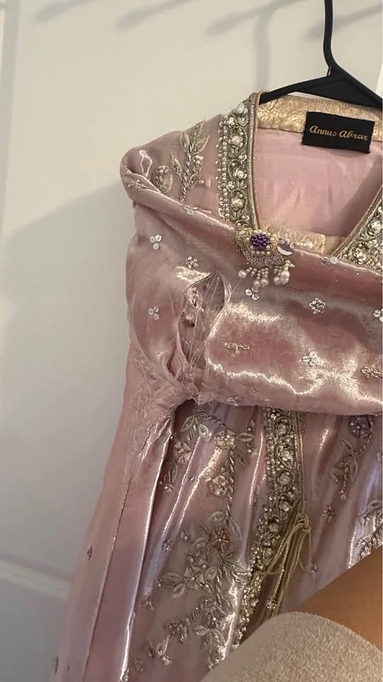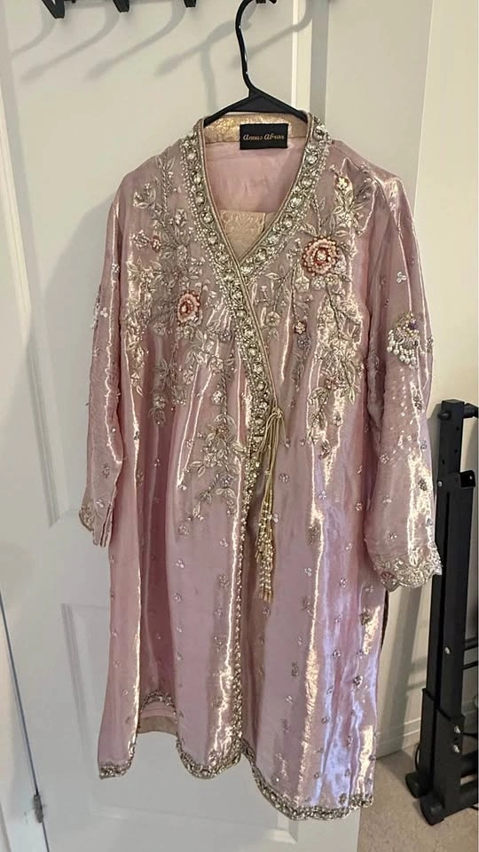 One of the arms is ripped, so if you can repurpose this dress as a sleeveless it would be beautiful! Paid over $700 for it. Selling for $100 obo. Size XL. Lots of beautiful kaam on it. 3 pcs. Shirt, pant, and dupatta. Pakistani dress. Worn twice.