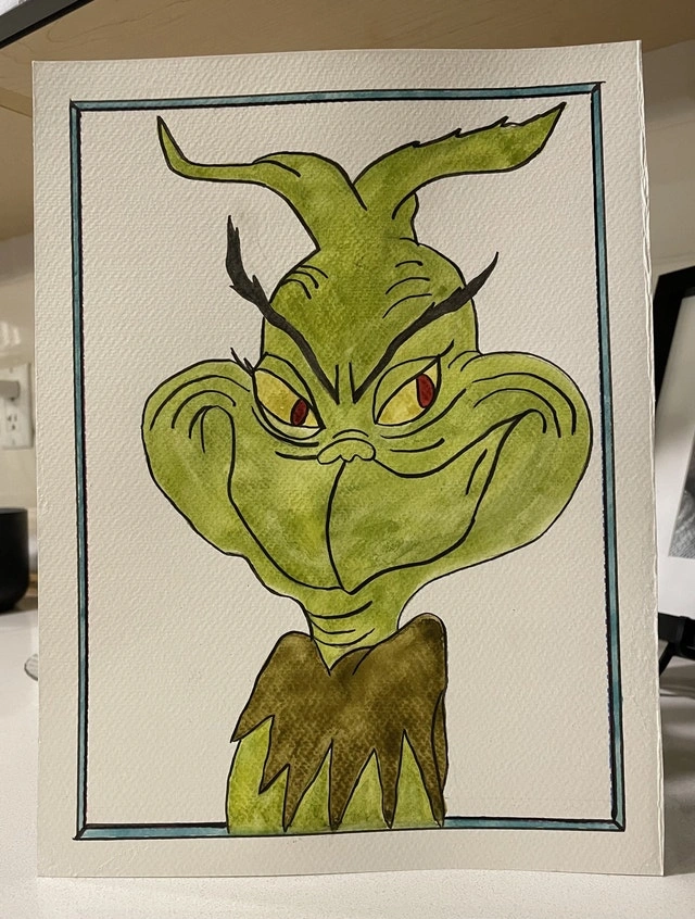 8X10 Watercolor The Grinch Portrait painted by me. Can be framed. Makes a great gift too. Buy 3 (8X10) and get 1 free. Pick up in Edgemont.