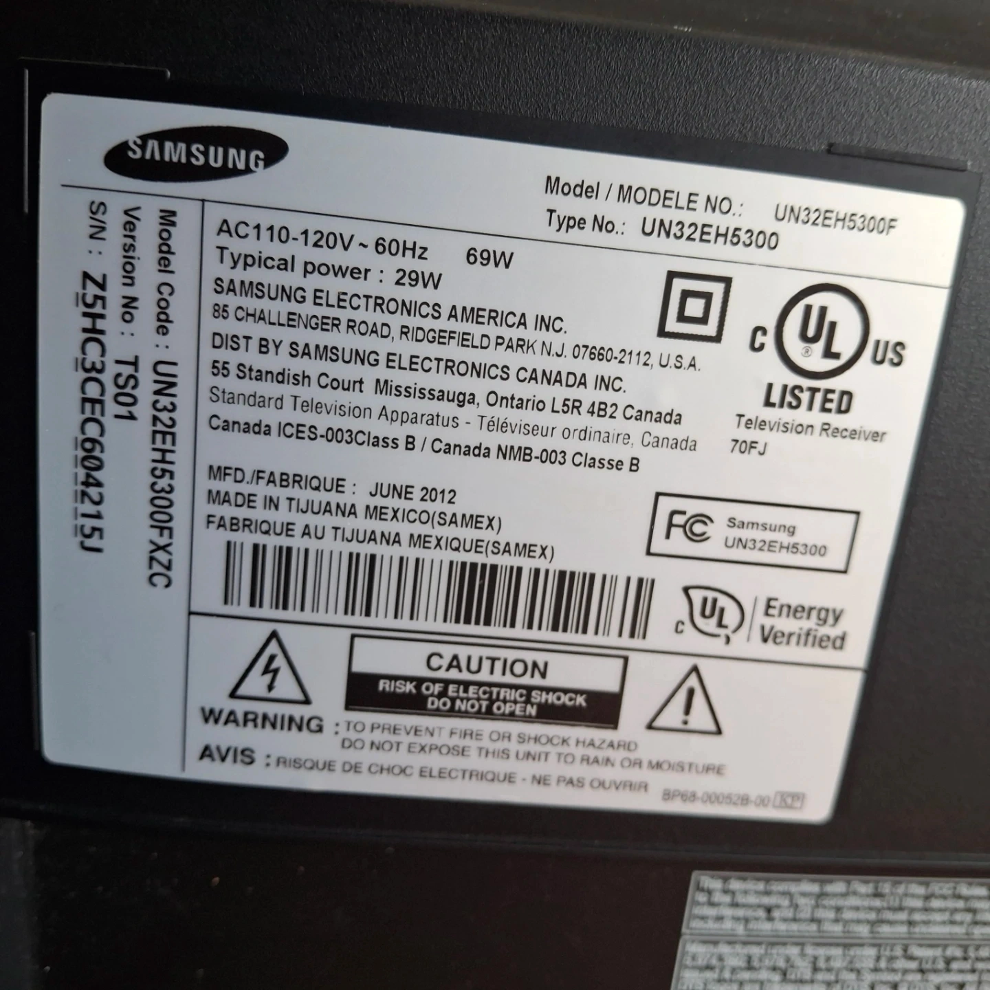 Samsung 32-inch Smart TV. Model UN32EH5300. Typical power use is 69W. Manufactured in June 2012.
