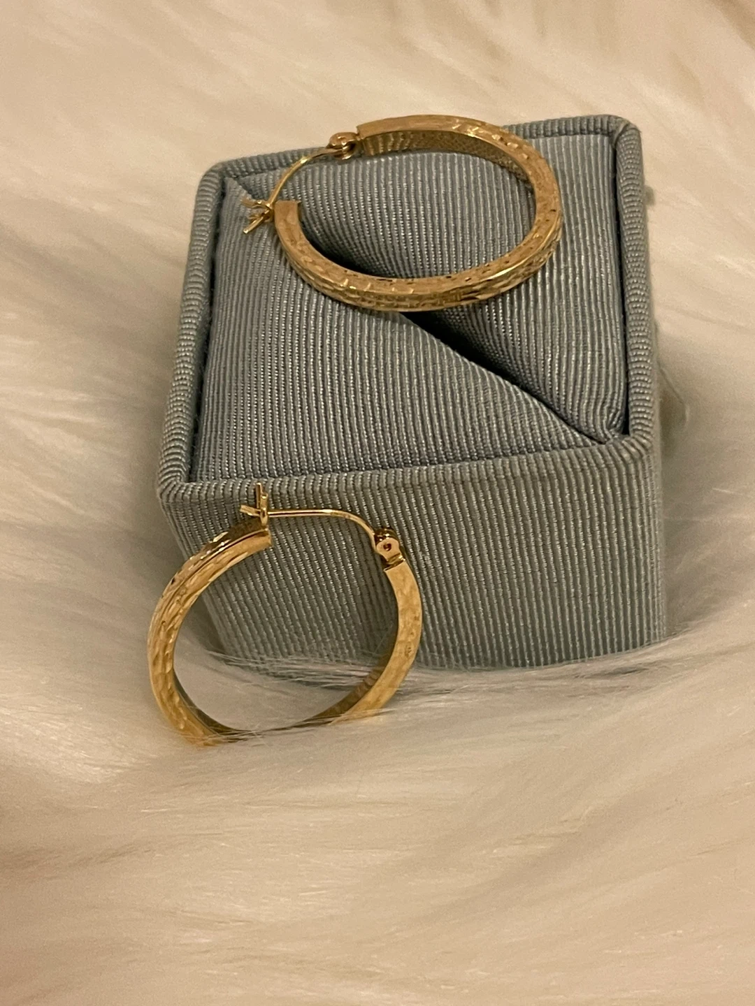 Pre-owned 14k Yellow Gold Diamond-Cut Hoop Earrings. This item is in excellent condition , it has just tiny dent on one but not noticeable . The distinctive textured appearance is achieved through diamond-cut techniques, allowing the gold to capture and reflect light from multiple angles, thereby enhancing its visual appeal. Selling on behalf of my Mom.