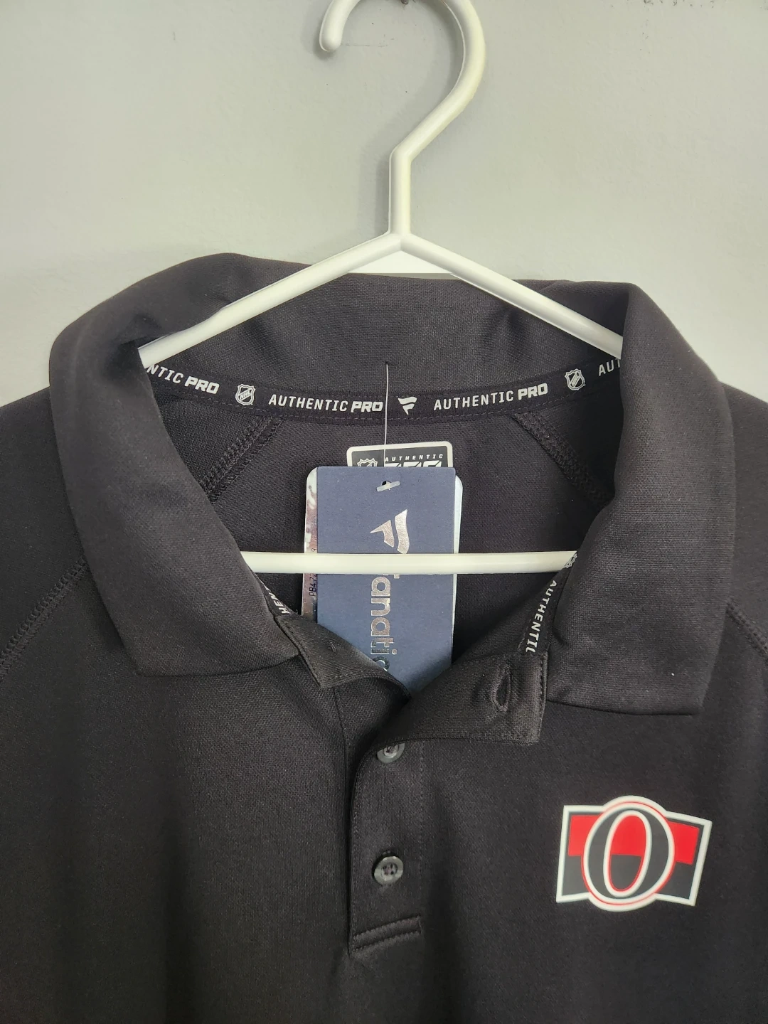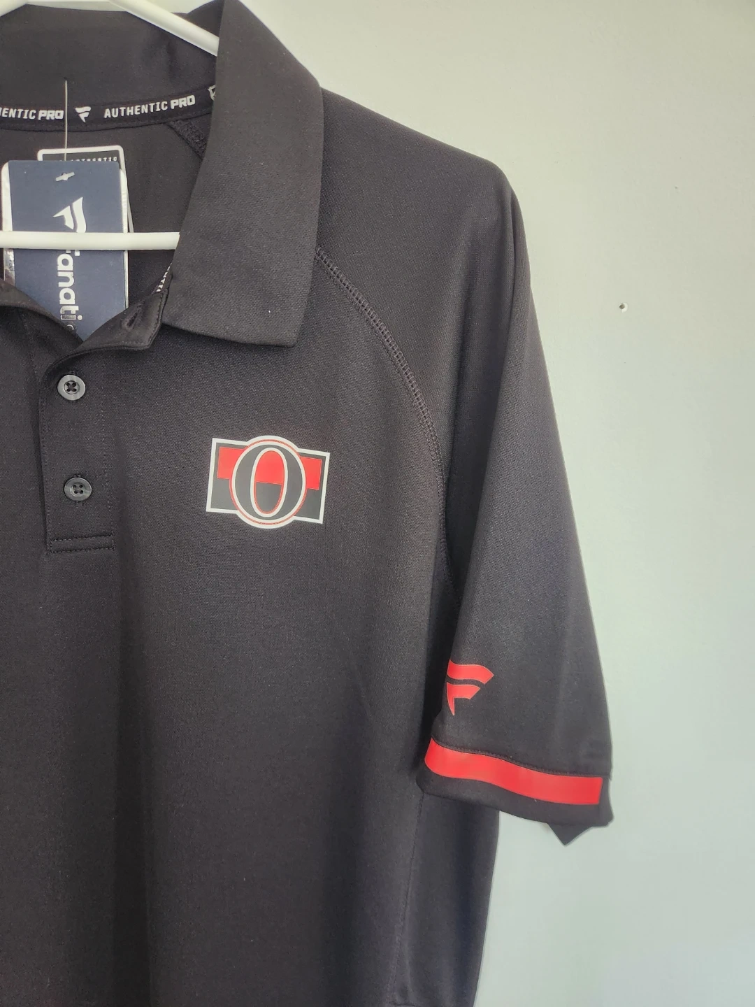 Show your support with this black Ottawa Senators polo shirt. It features the team logo on the chest and the NHL Authentic Pro branding. Made with comfortable, breathable fabric. Size is large.