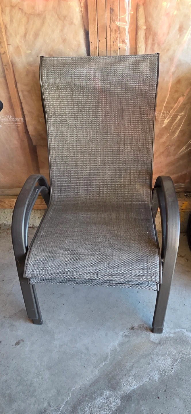 Selling two used outdoor patio chairs. They feature a brown wicker style seat and back with a sturdy metal frame. Perfect for relaxing on your deck or patio!
