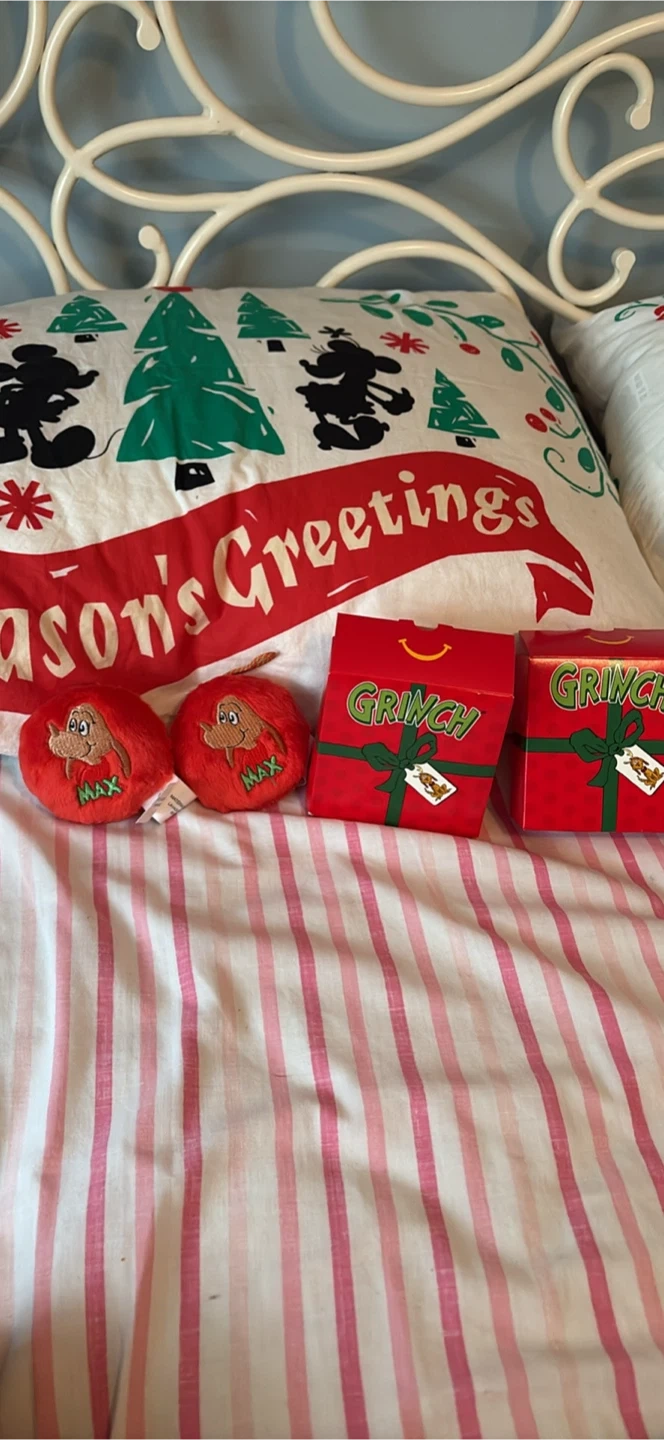 Two plush Max ornaments and two Grinch gift boxes. These festive items are perfect for holiday decorating or as fun stocking stuffers. They're great for any fan of the classic Christmas tale! $10 dollars each