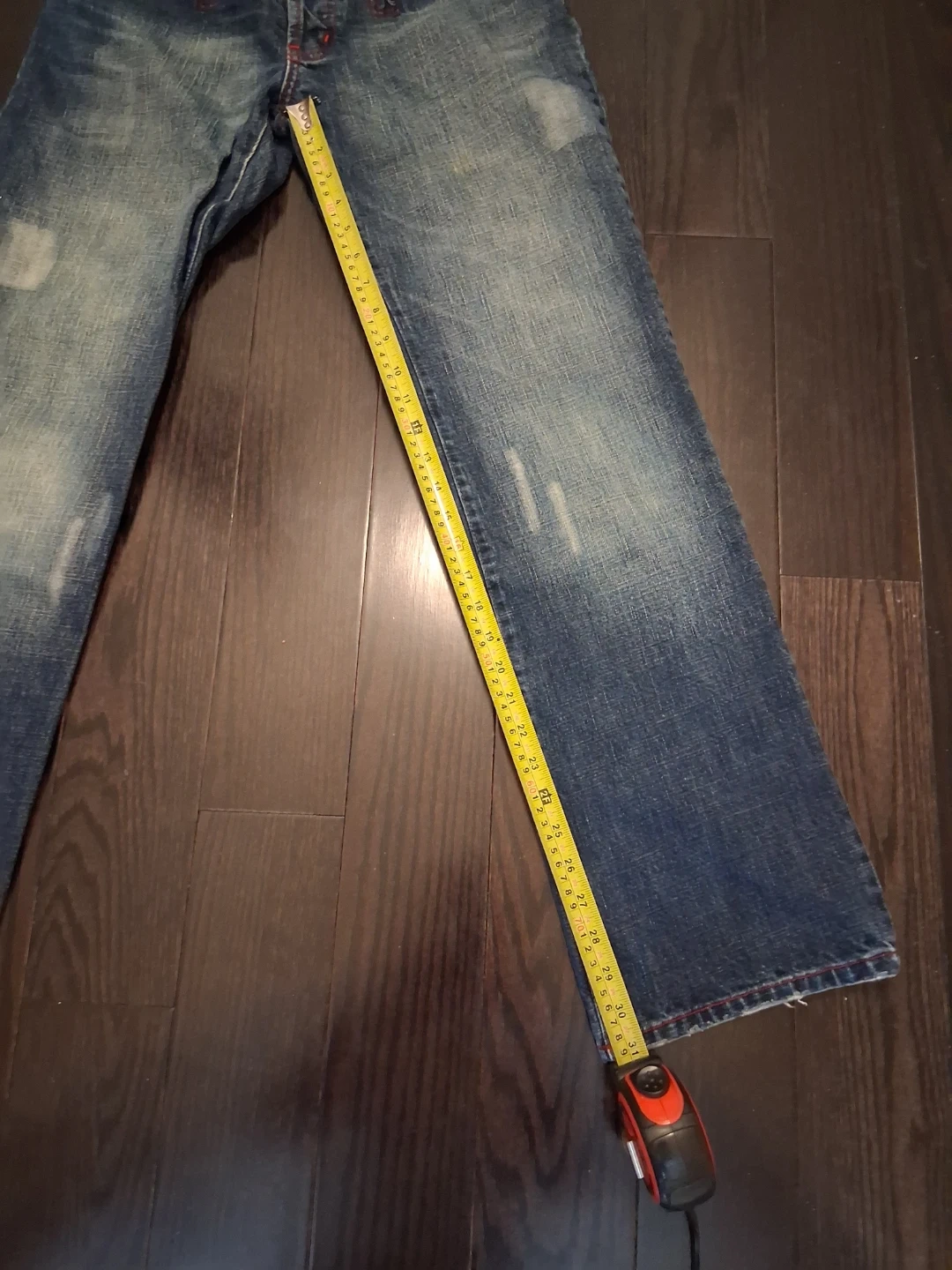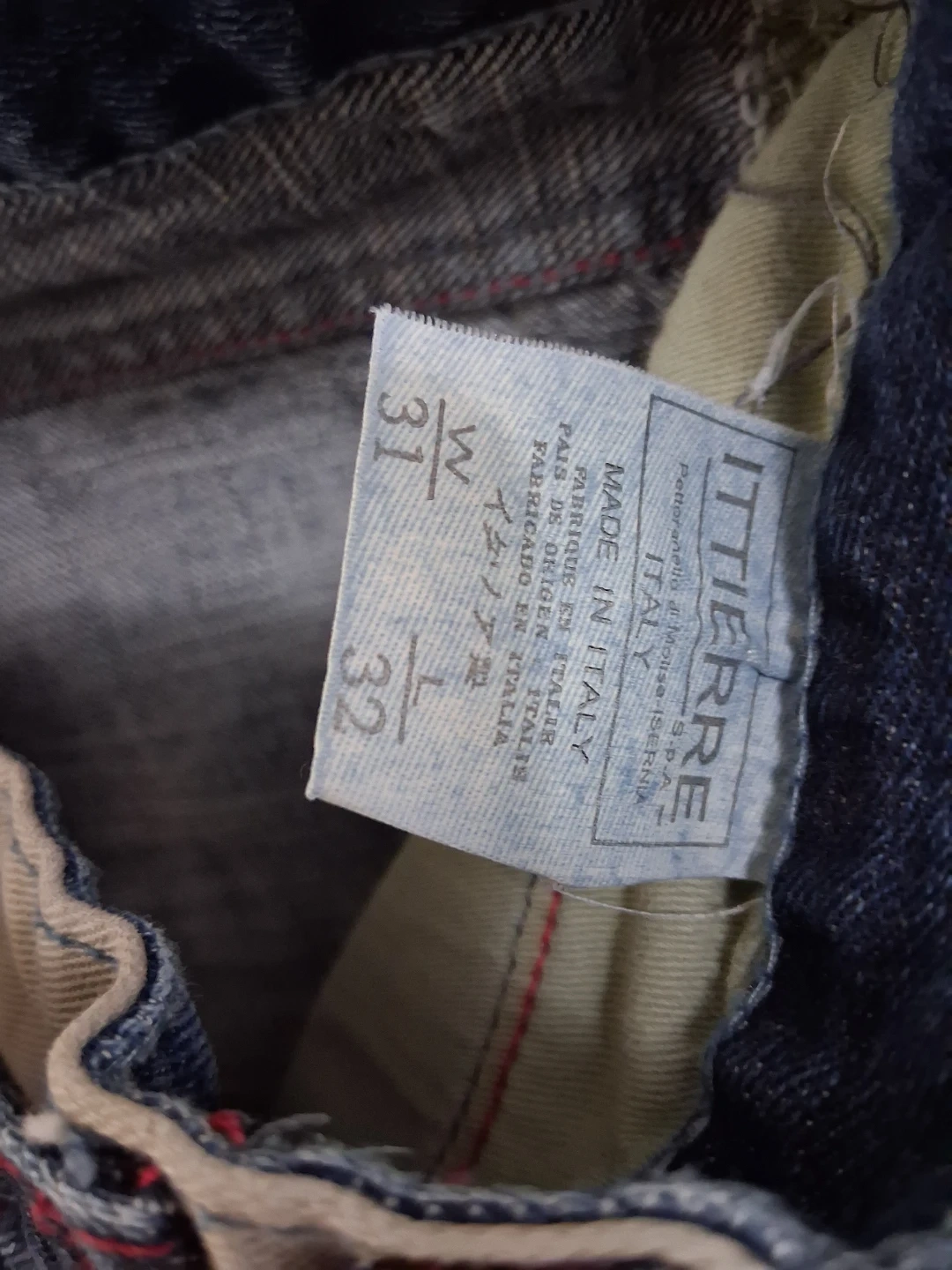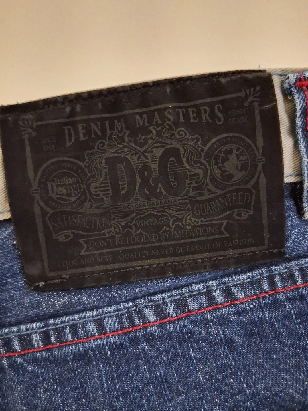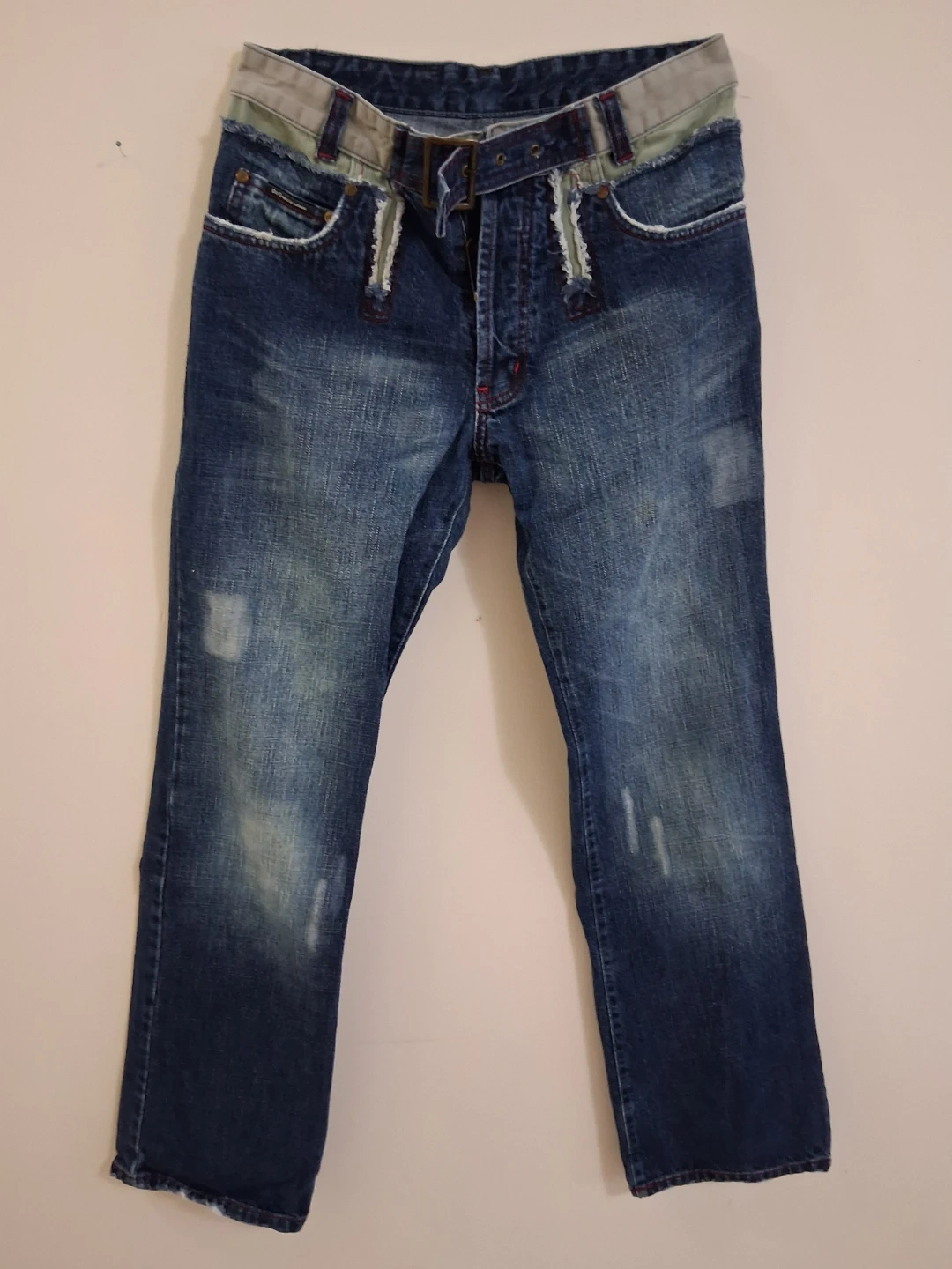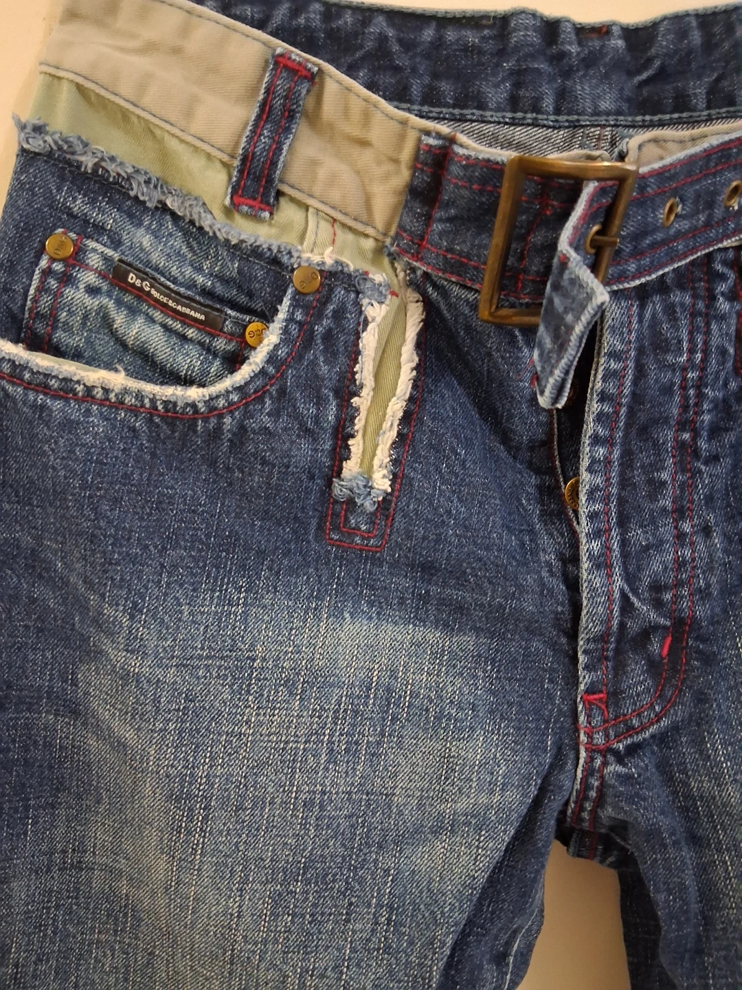 Selling a pair of D&G Dolce&Gabbana jeans in size 31waist and 31 inseam. They're in good condition and have a unique design with a belt detail. The jeans are made in Italy and have a stylish, vintage look. Perfect for adding a bit of edge to your wardrobe! Made in Italy