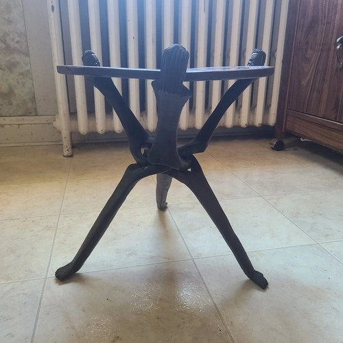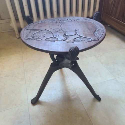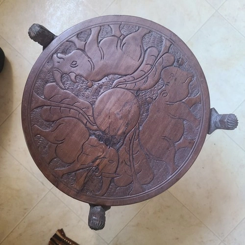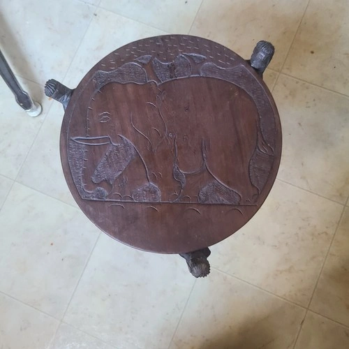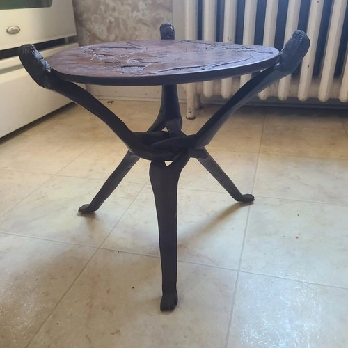This is a beautiful dark wood tripod table brought from Malawi. The round top is reversible, with an elephant on one side, and an elephant, hippo, and rhino on the other. The legs are also very unique. It's light and easily portable, measuring a little over 1 ft. high, with the tabletop 13" in diameter.