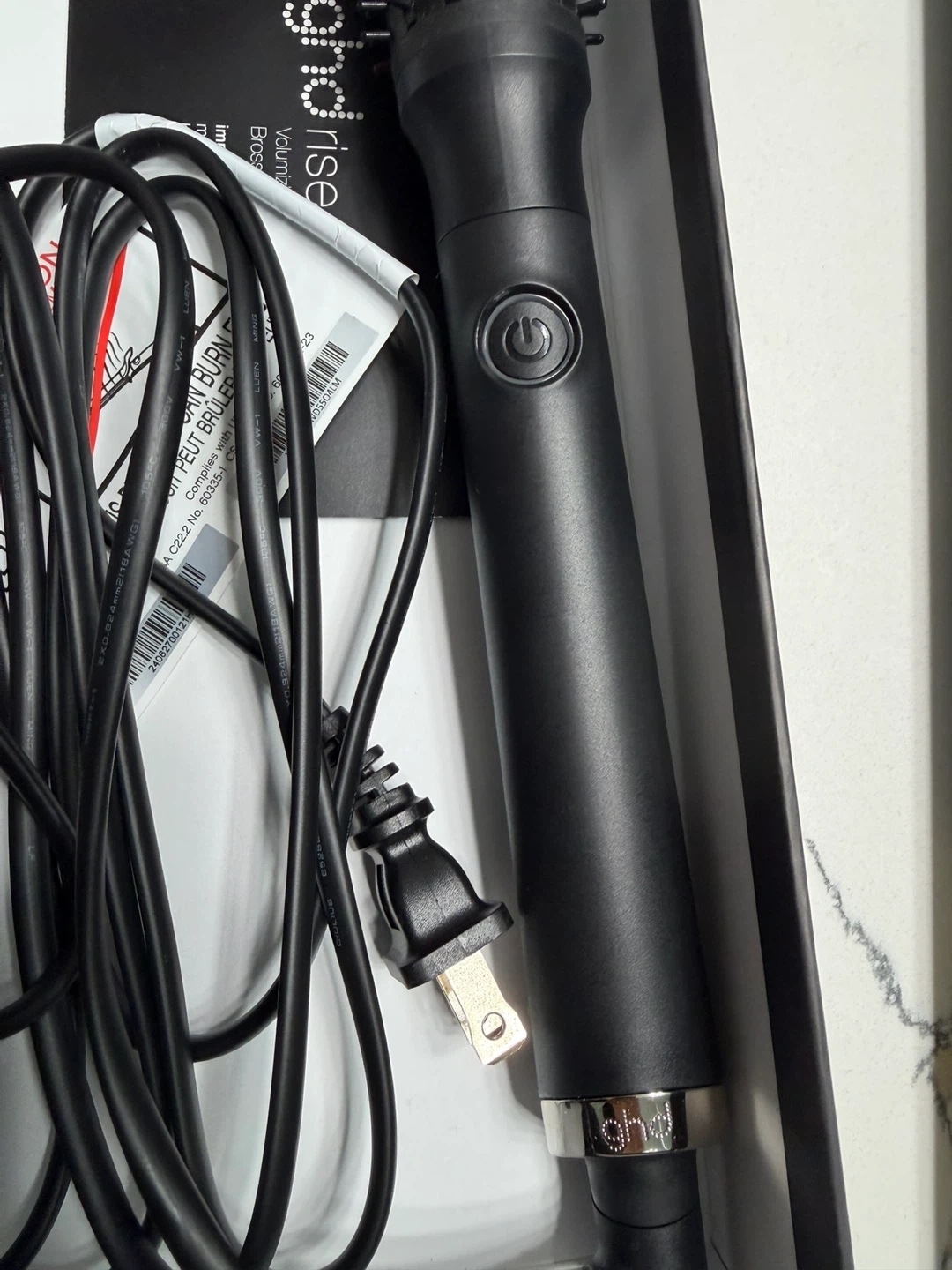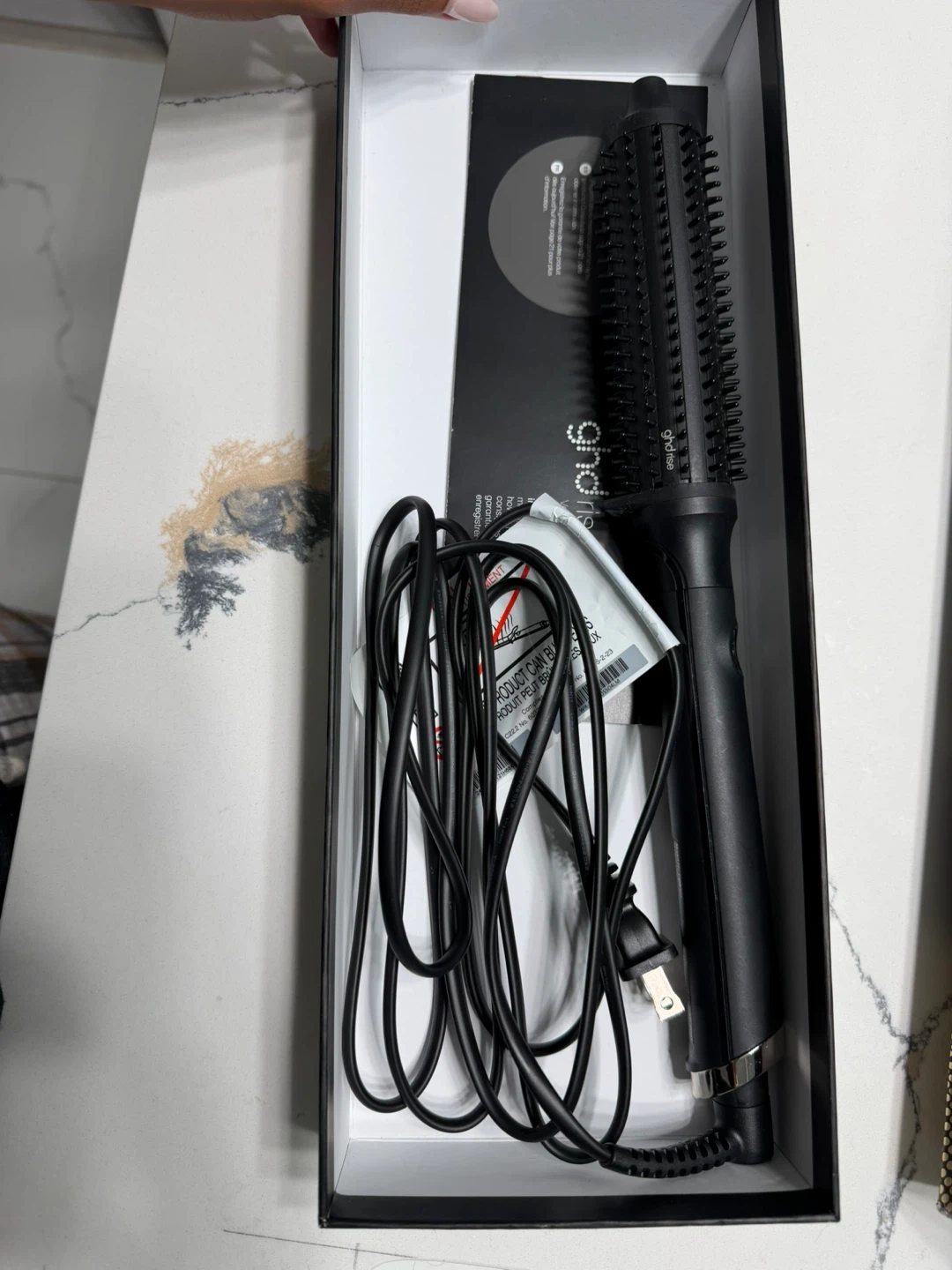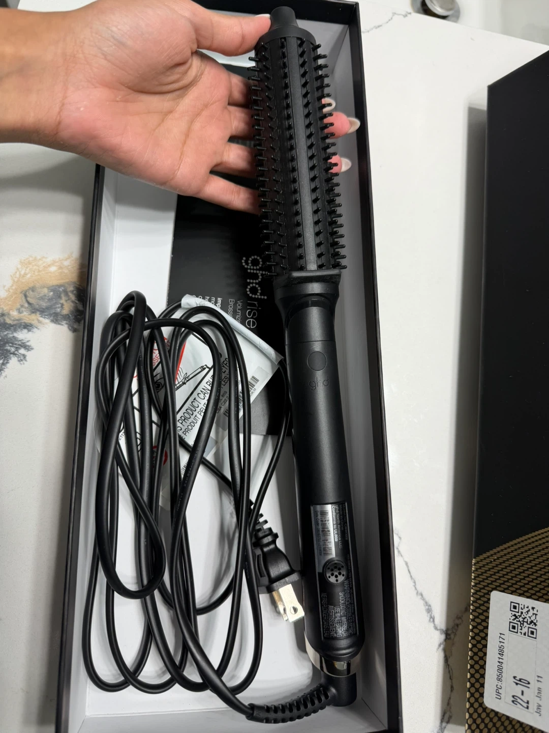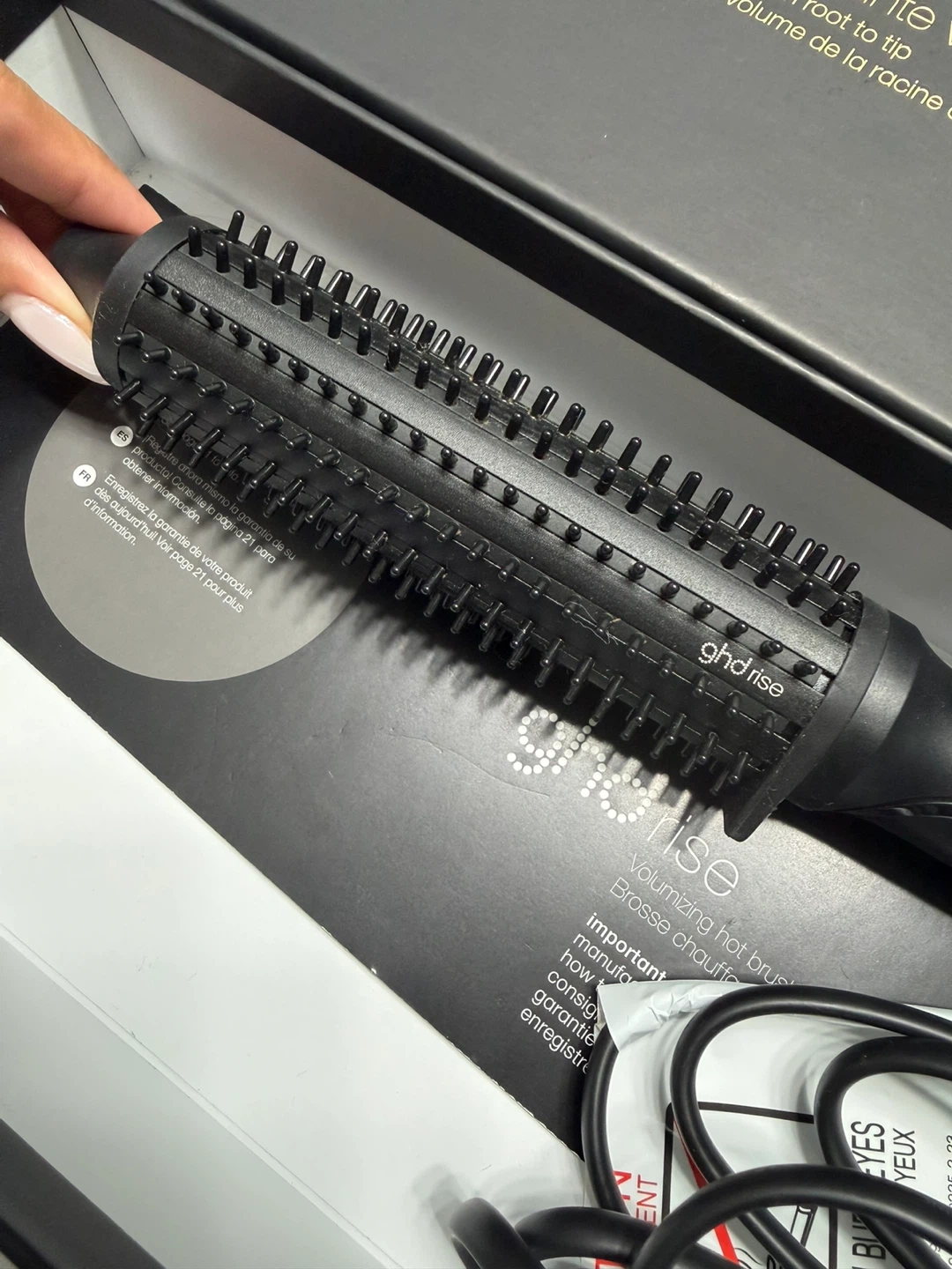 It's the GHD Rise volumizing hot brush that creates volume from root to tip. This tool is designed for quick and easy styling. The brush is black and includes the original box and manual.