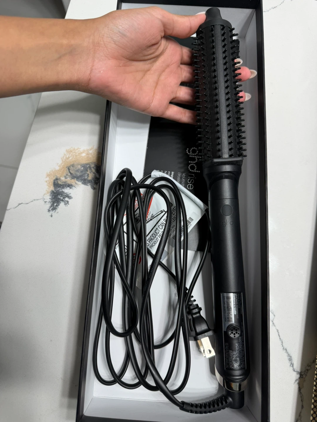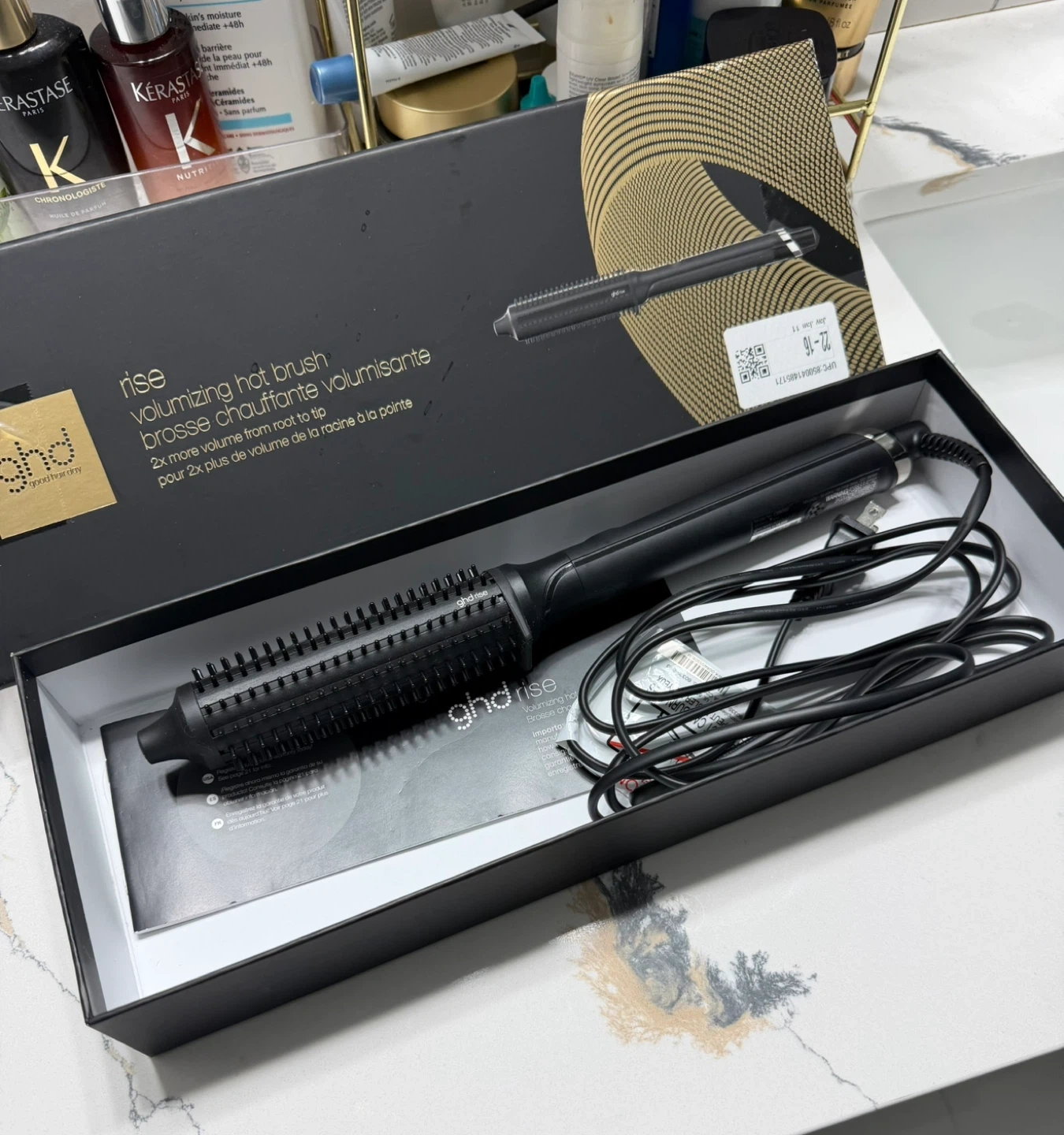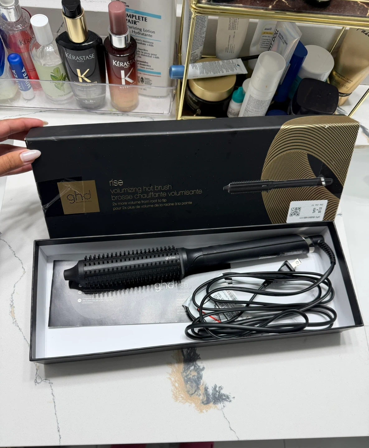 It's the GHD Rise volumizing hot brush that creates volume from root to tip. This tool is designed for quick and easy styling. The brush is black and includes the original box and manual.