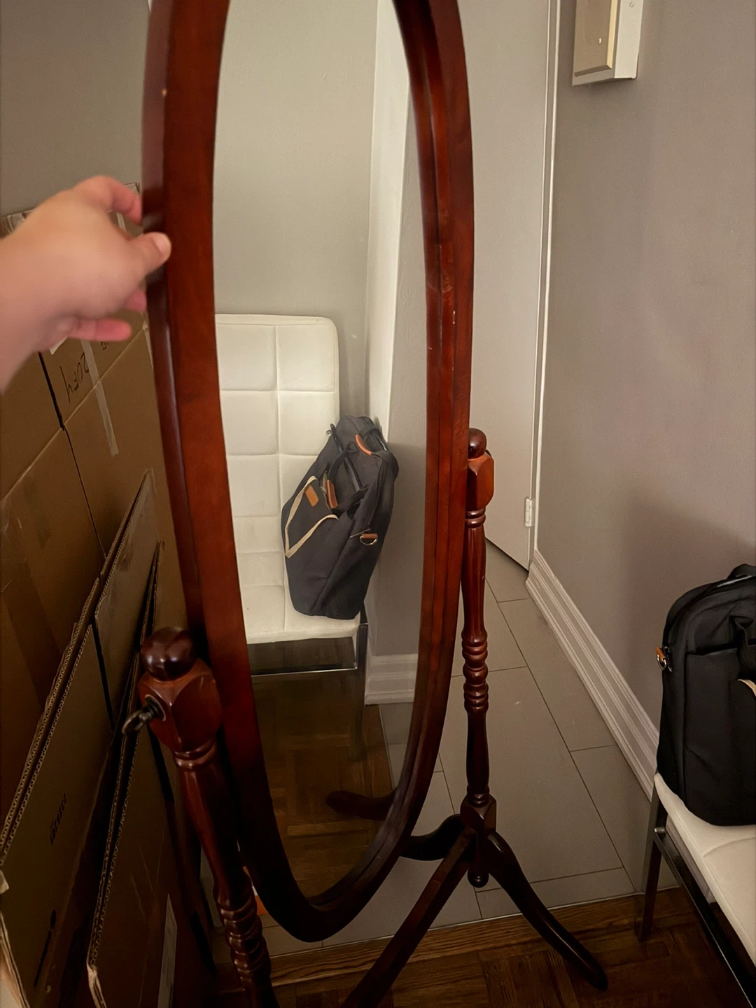 A beautiful oval cheval mirror with a rich, dark wooden frame. It stands on a sturdy wooden base, perfect for a bedroom or dressing room. Its elegant design makes it a great addition to any home!