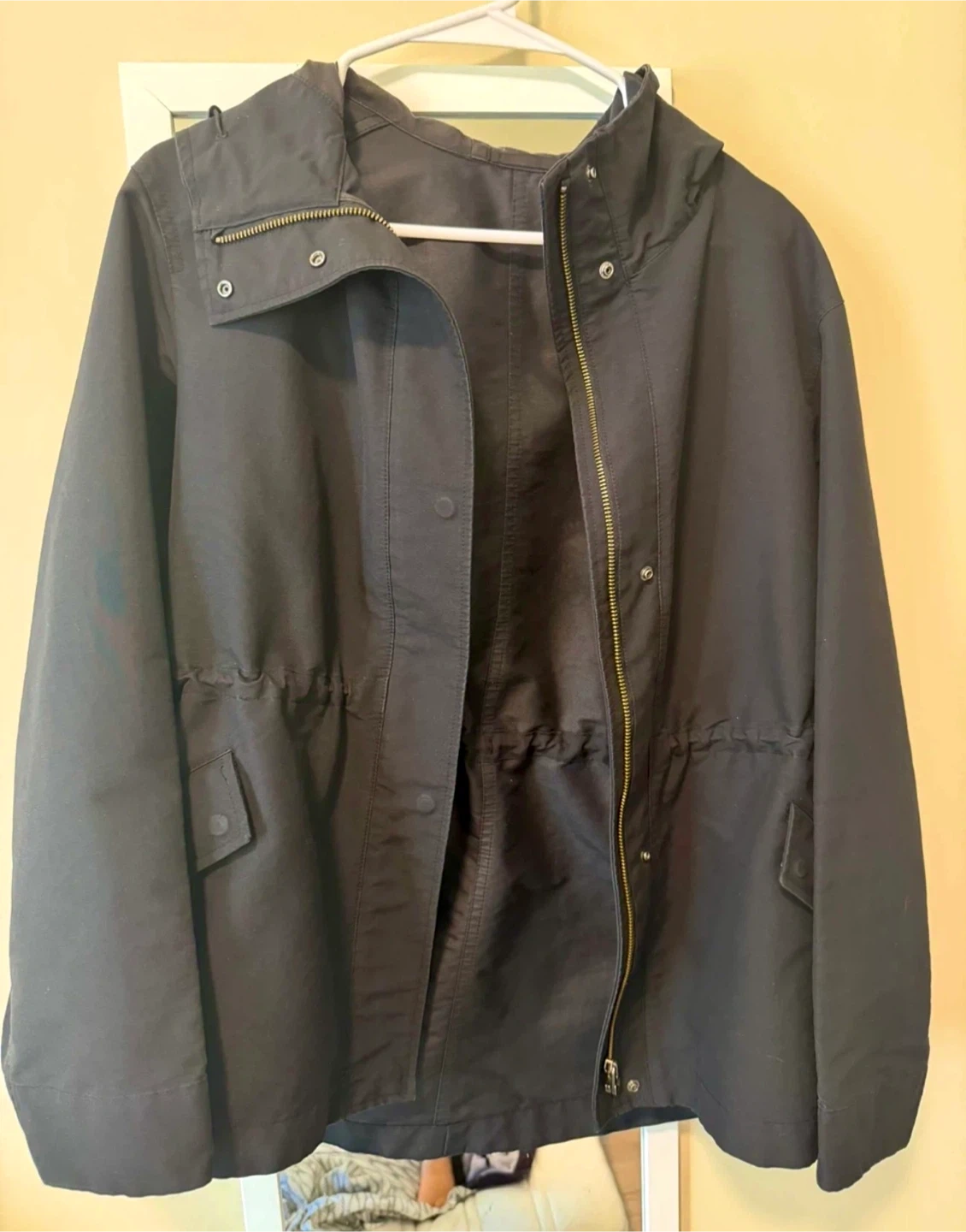 This is a black hooded parka jacket from UNIQLO. It's a size S/P and M size also can wear it.