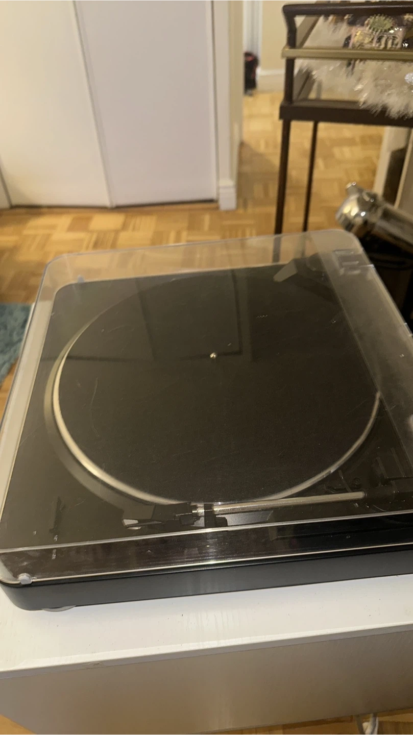 Selling an Audio-Technica AT-LP60-USB stereo turntable. It comes with a clear plastic cover to protect it from dust. Perfect for listening to your favorite vinyl records!