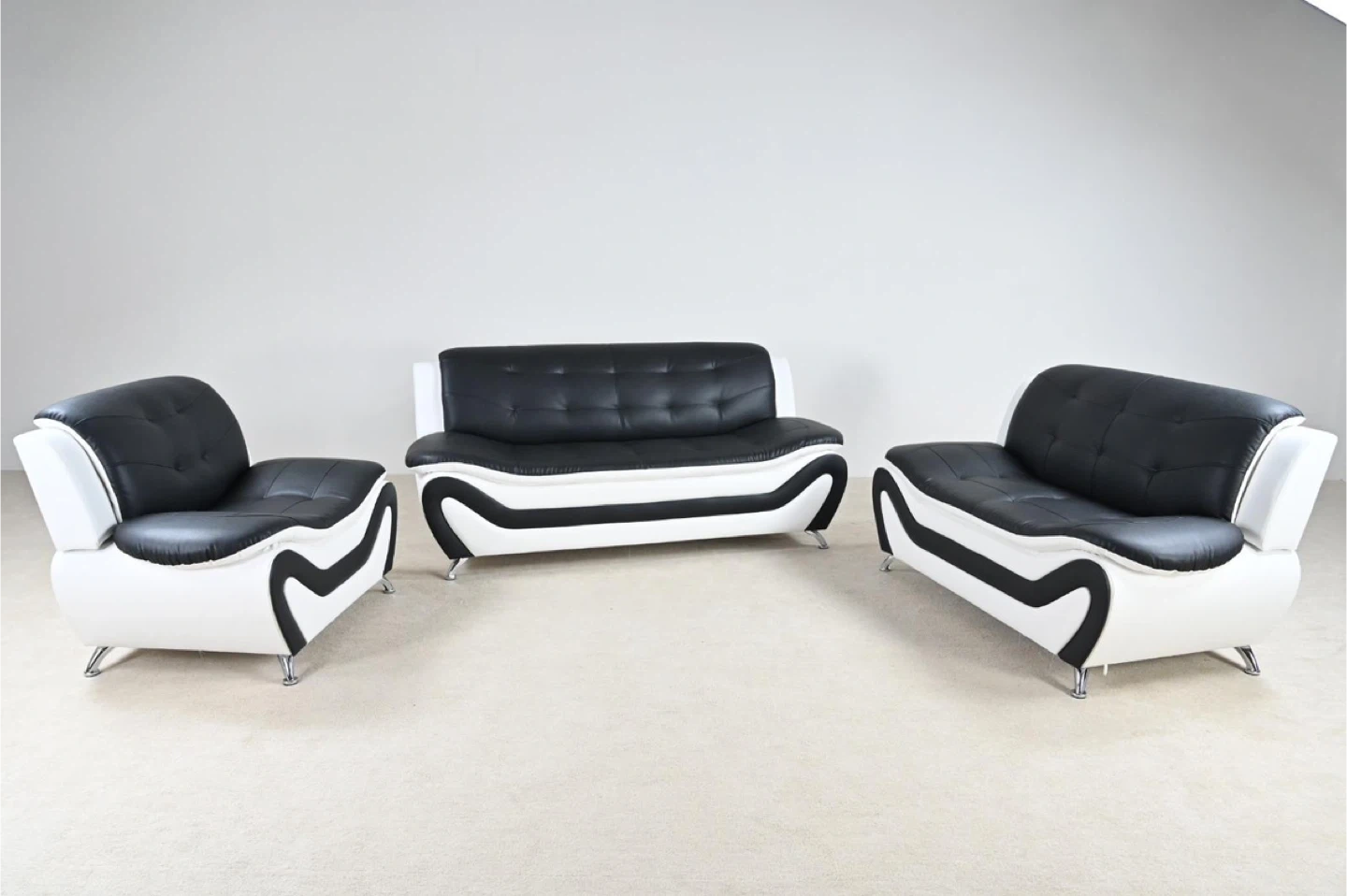 This stylish premium air leather sofa set is upholstered in a combination of black and white materials. This set would be a great addition to a contemporary living space. Modern Sofa Set
