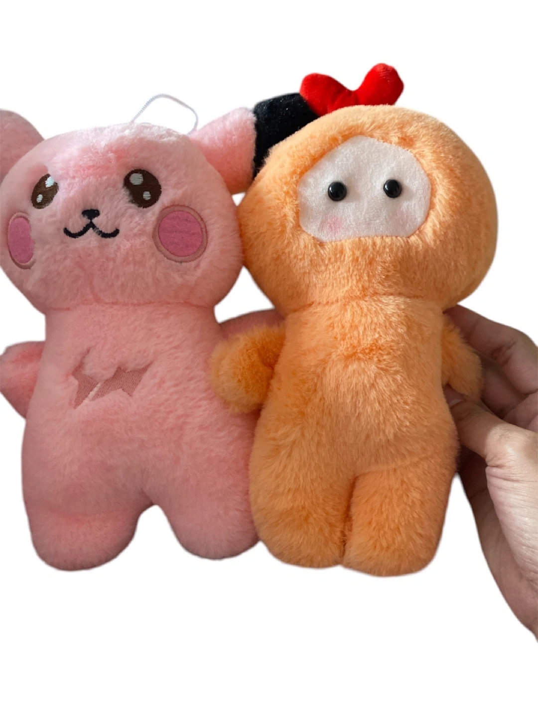 A collection of six fuzzy plush toys. Includes a pink Pikachu-like character, an orange ninja-like character, a pink Daruma doll with Japanese writing, a pink monster, a green avocado bear, and a yellow character with a fruit-like hat. These stuffed toys are soft and colourful.