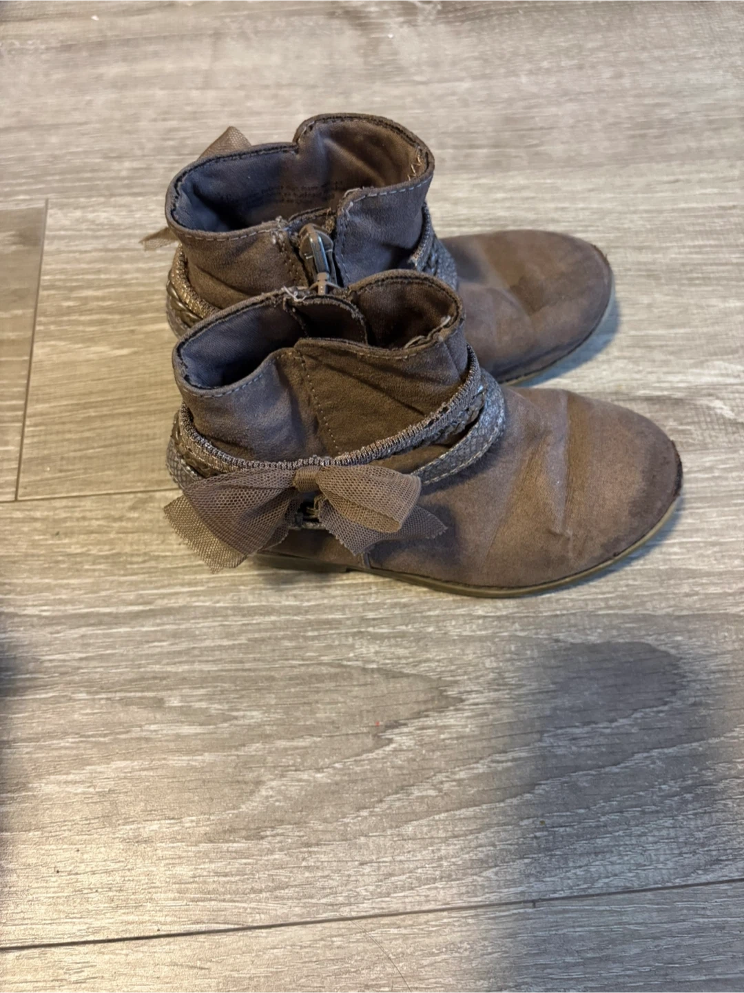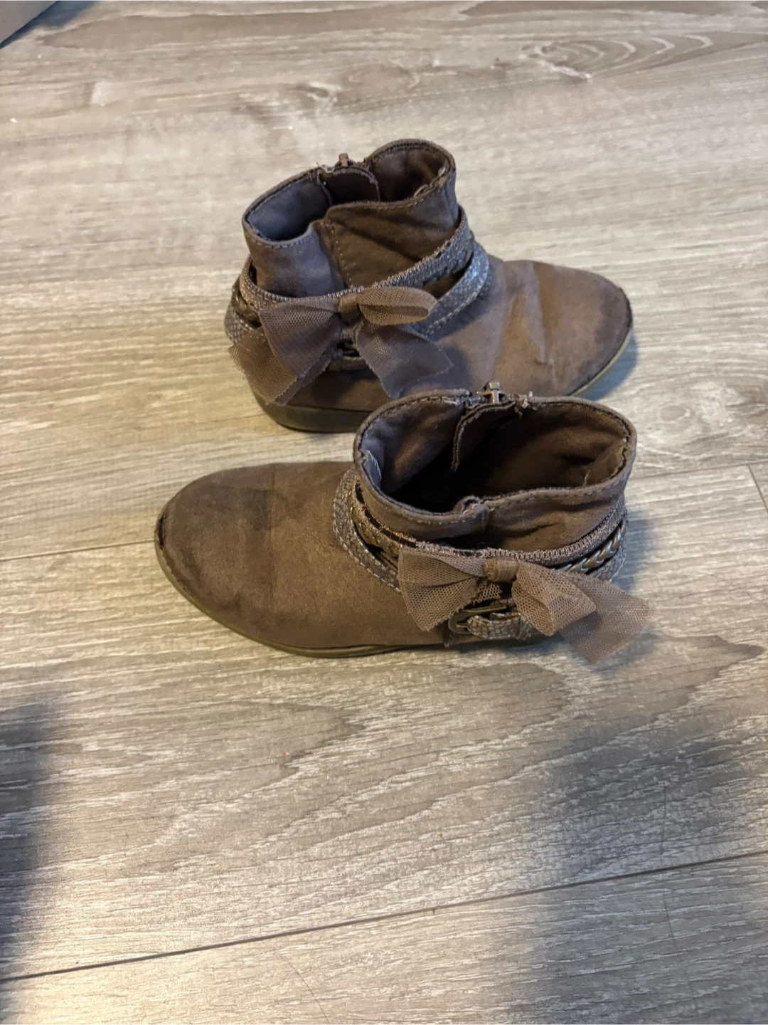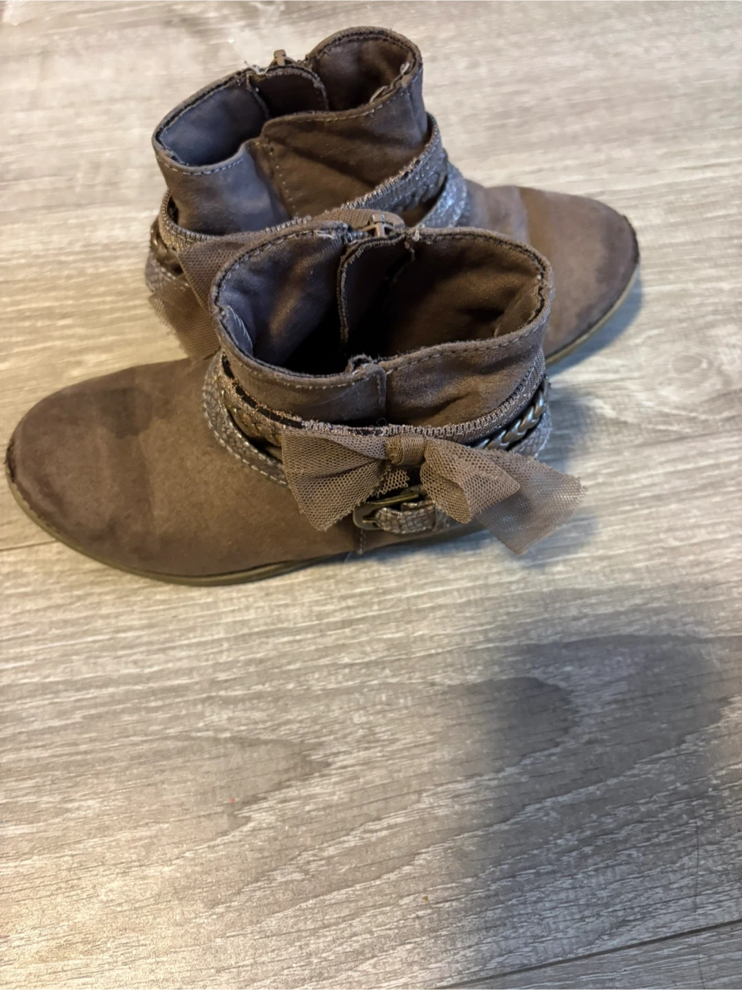 These cute brown ankle boots are made with a faux suede material. They feature a side zipper and a decorative bow with chain detailing. Perfect for a stylish casual look!