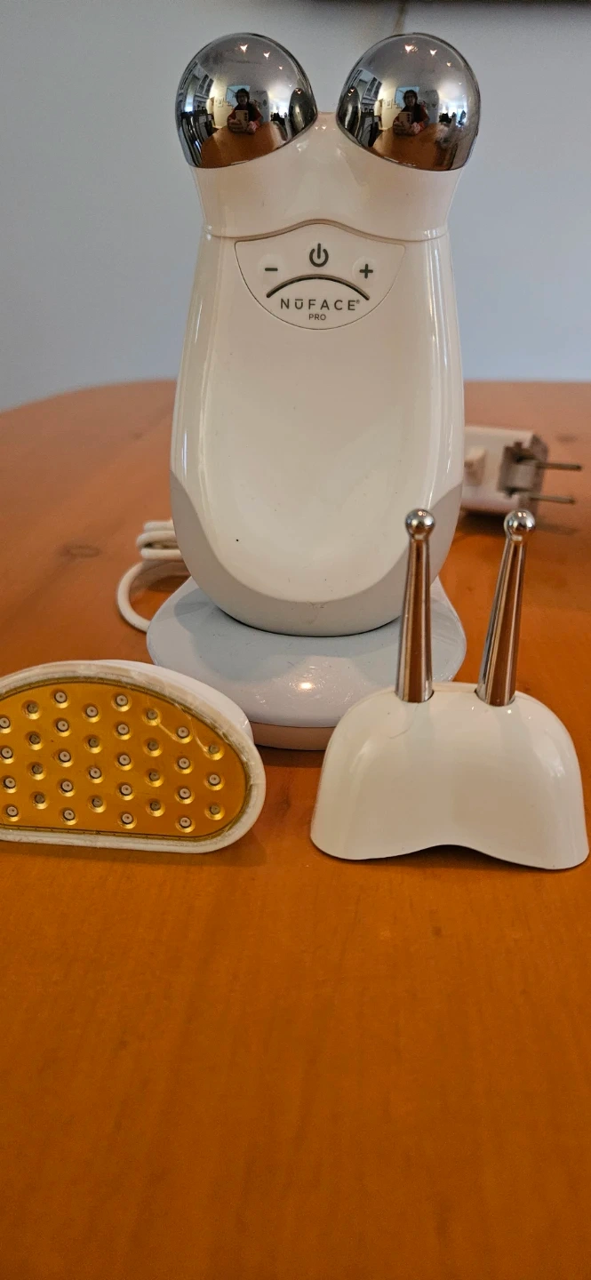 The NuFACE Pro device is engineered for microcurrent facial contouring. This system includes the primary device, a charging base, and a red light therapy attachment. Its purpose is to assist in toning and firming the skin.