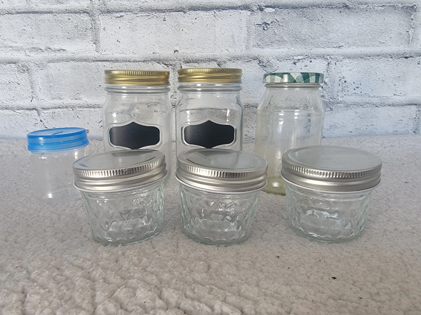 Collection of assorted glass jars, perfect for canning, storage, or crafts. Includes jars with gold, silver, and checkered lids. Some jars feature chalkboard labels for easy identification.