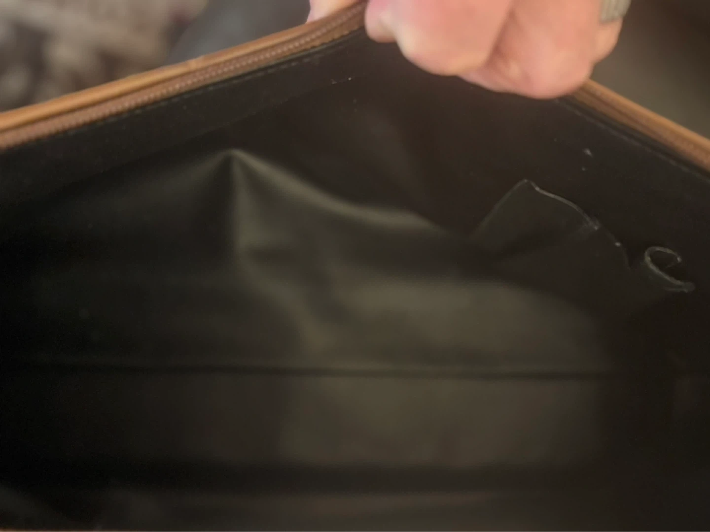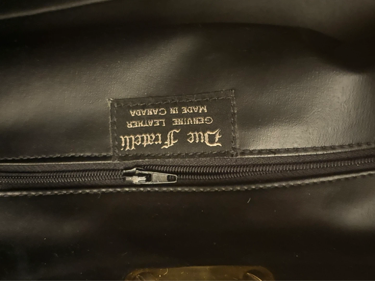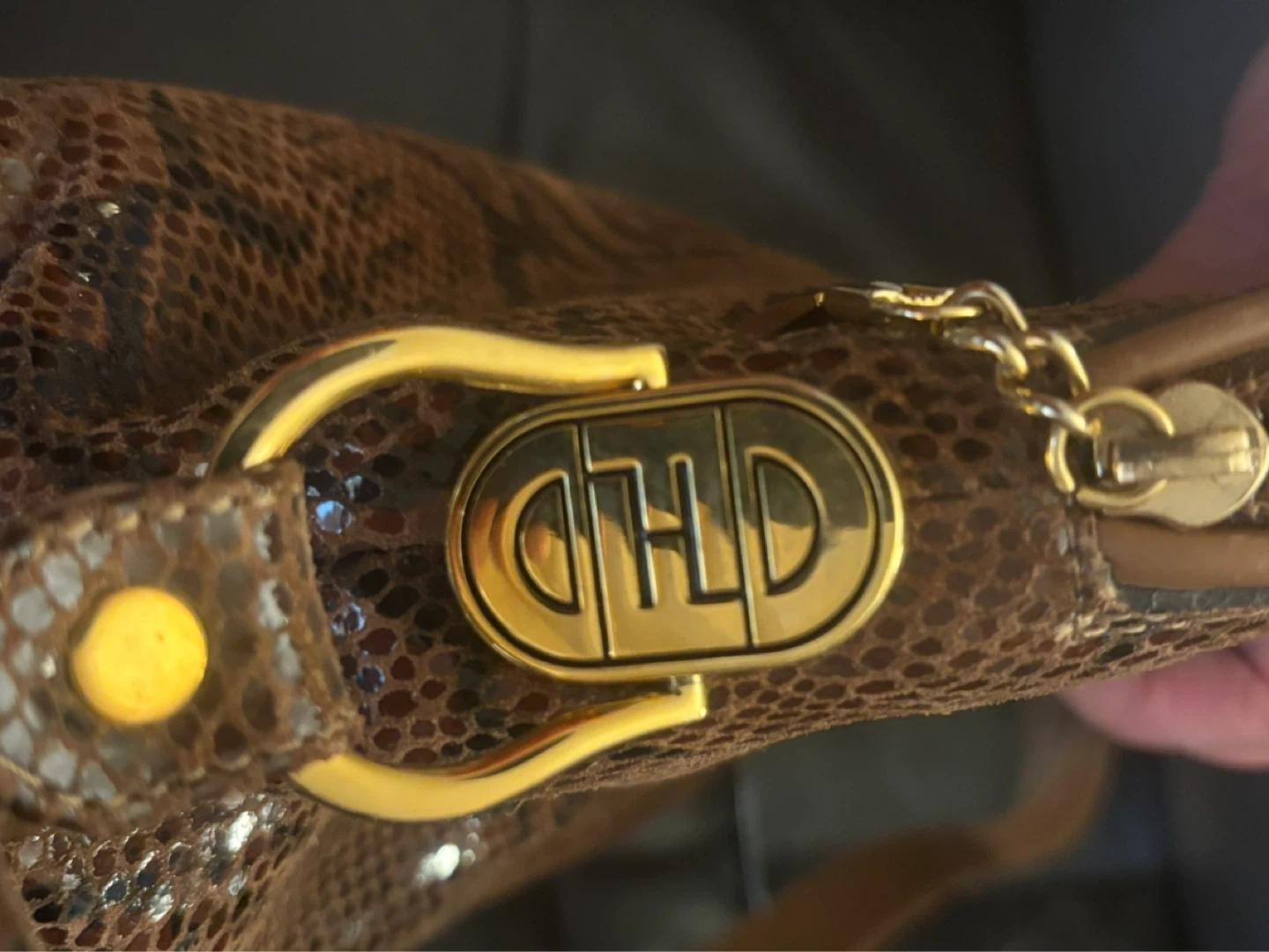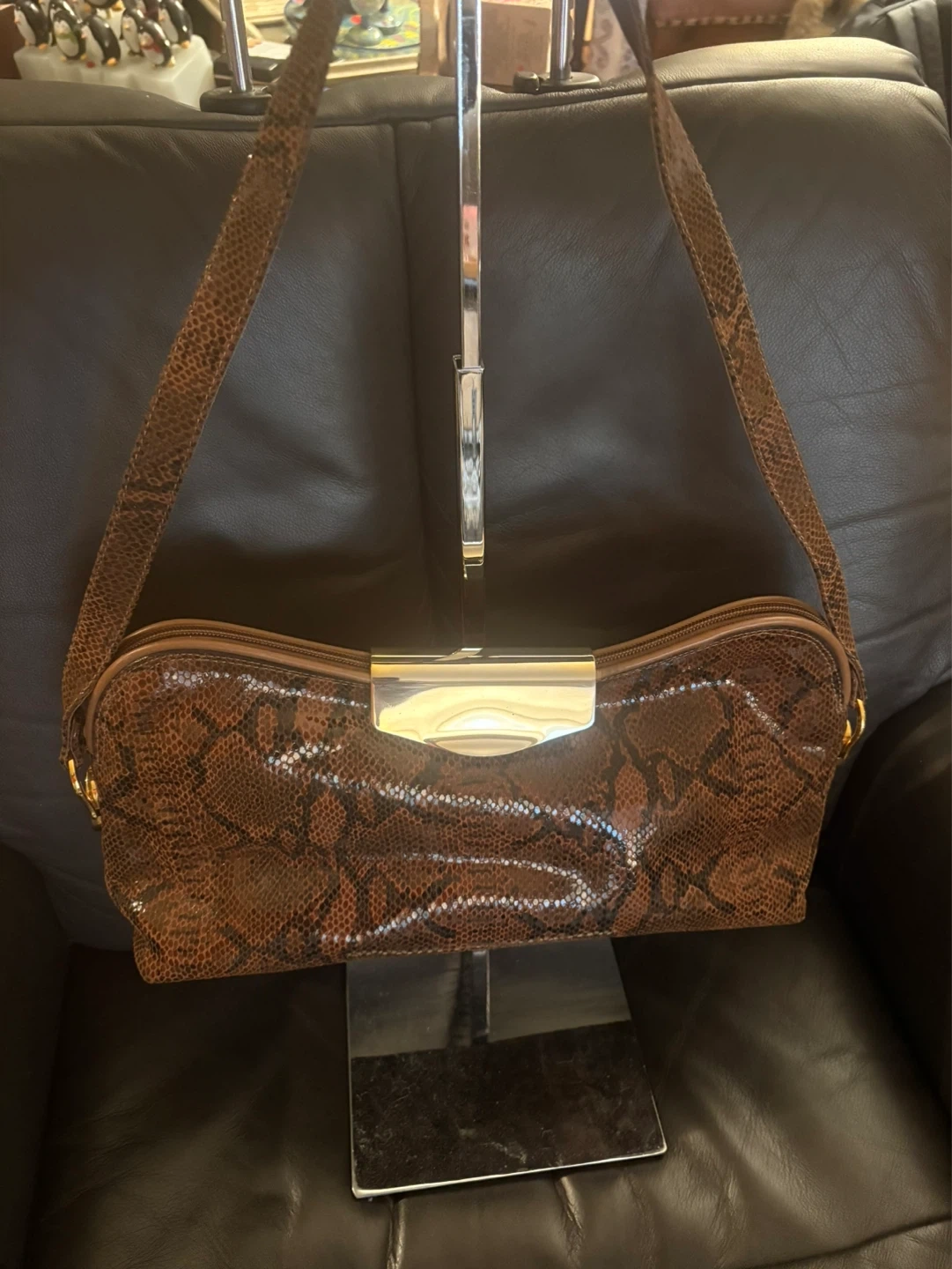 Stylish shoulder bag featuring a brown snake print exterior with a gold-tone clasp. It's made from genuine leather and was made in Canada. Inside, it has a zippered pocket and one slip pocket.