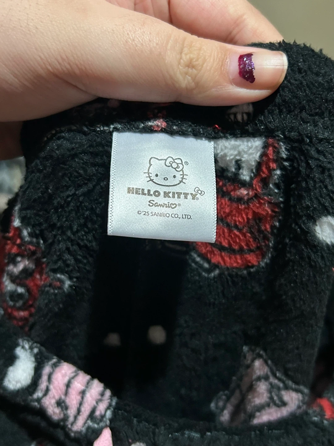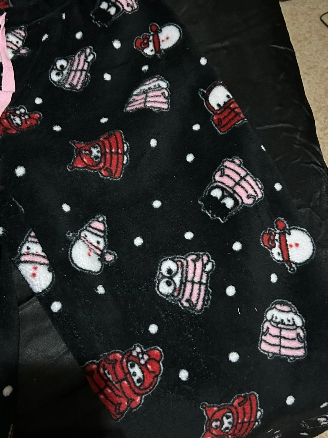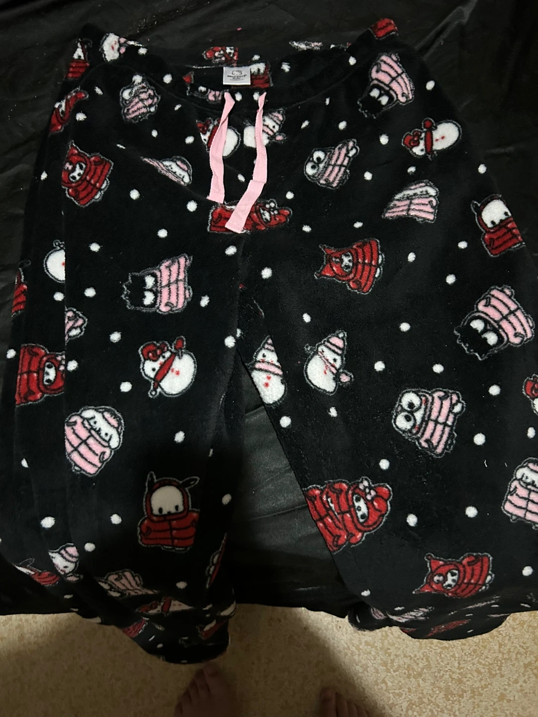 Comfy black fleece pajama pants with a cute Hello Kitty and friends pattern. Made with 100% polyester. Size L. Perfect for cozy nights! Brand new pick up near century park