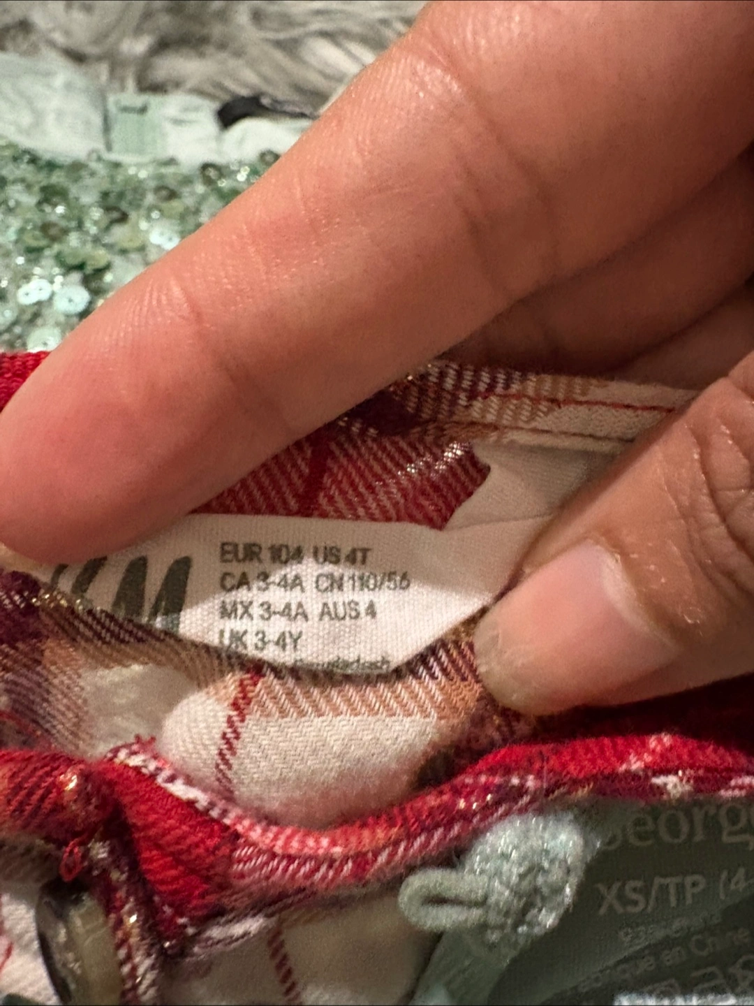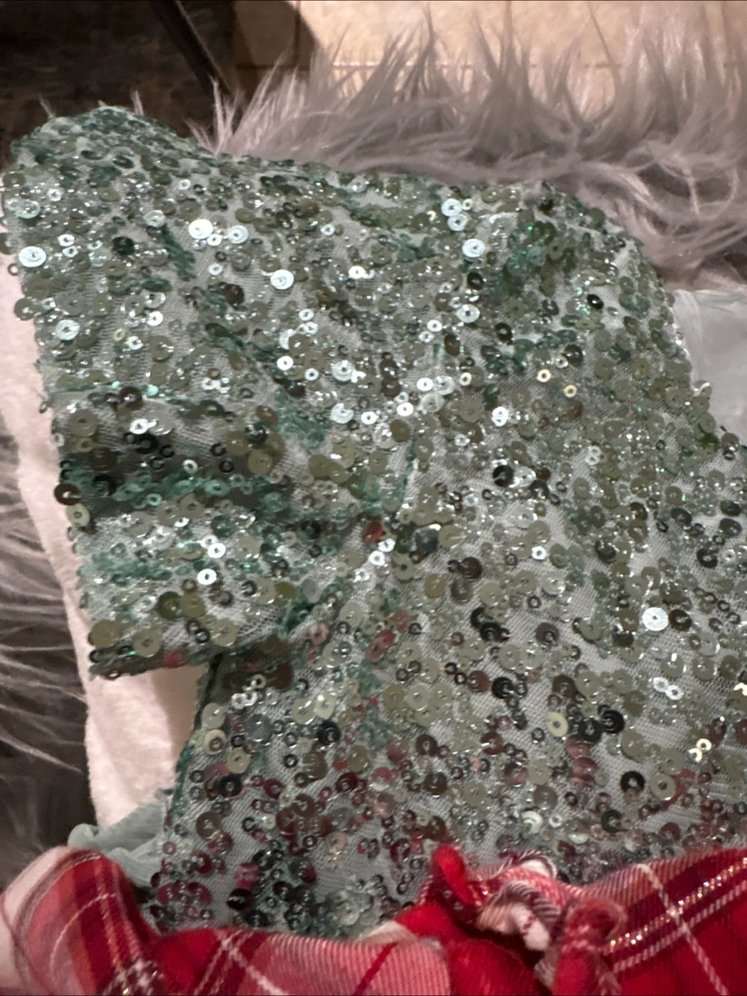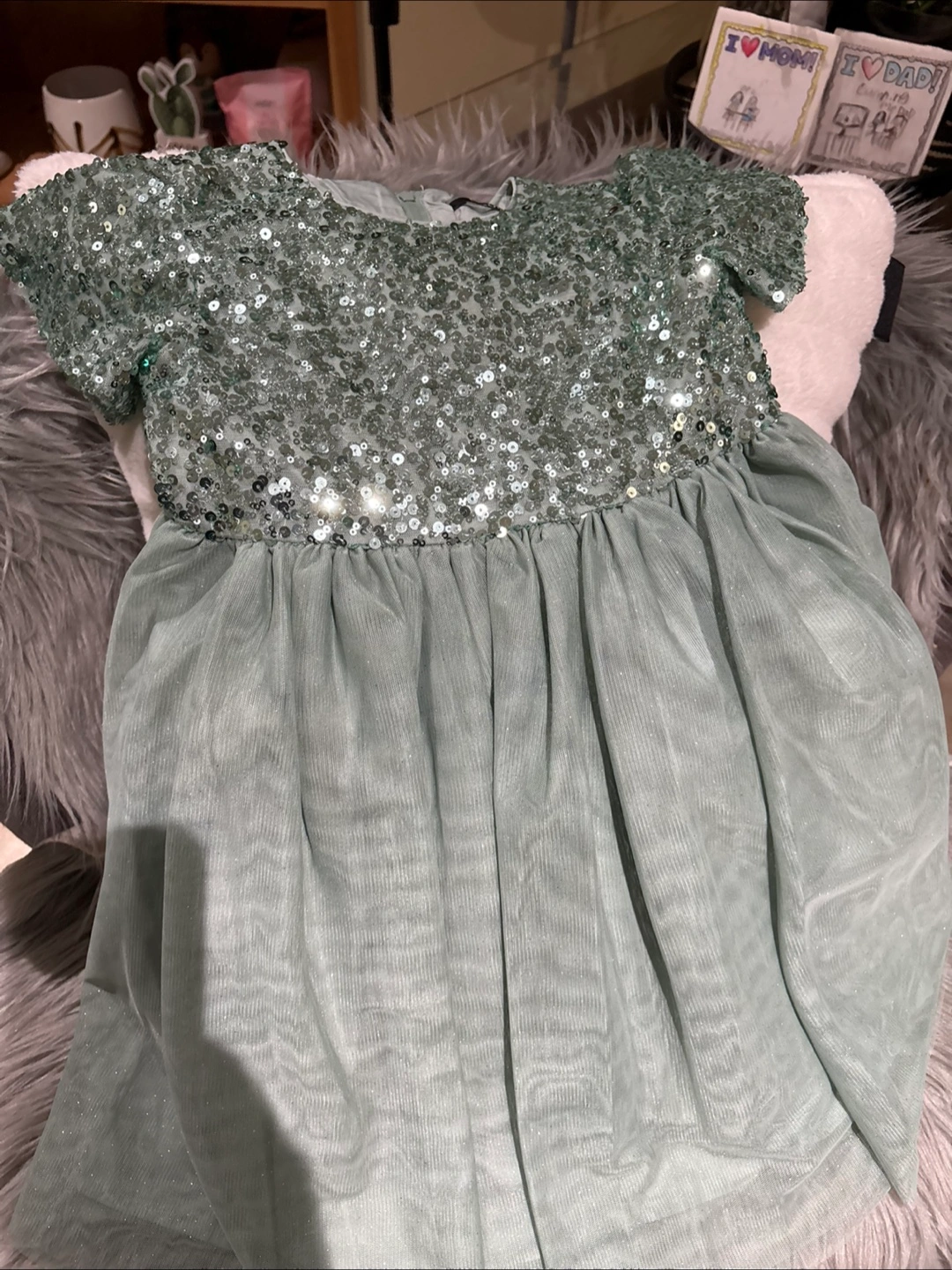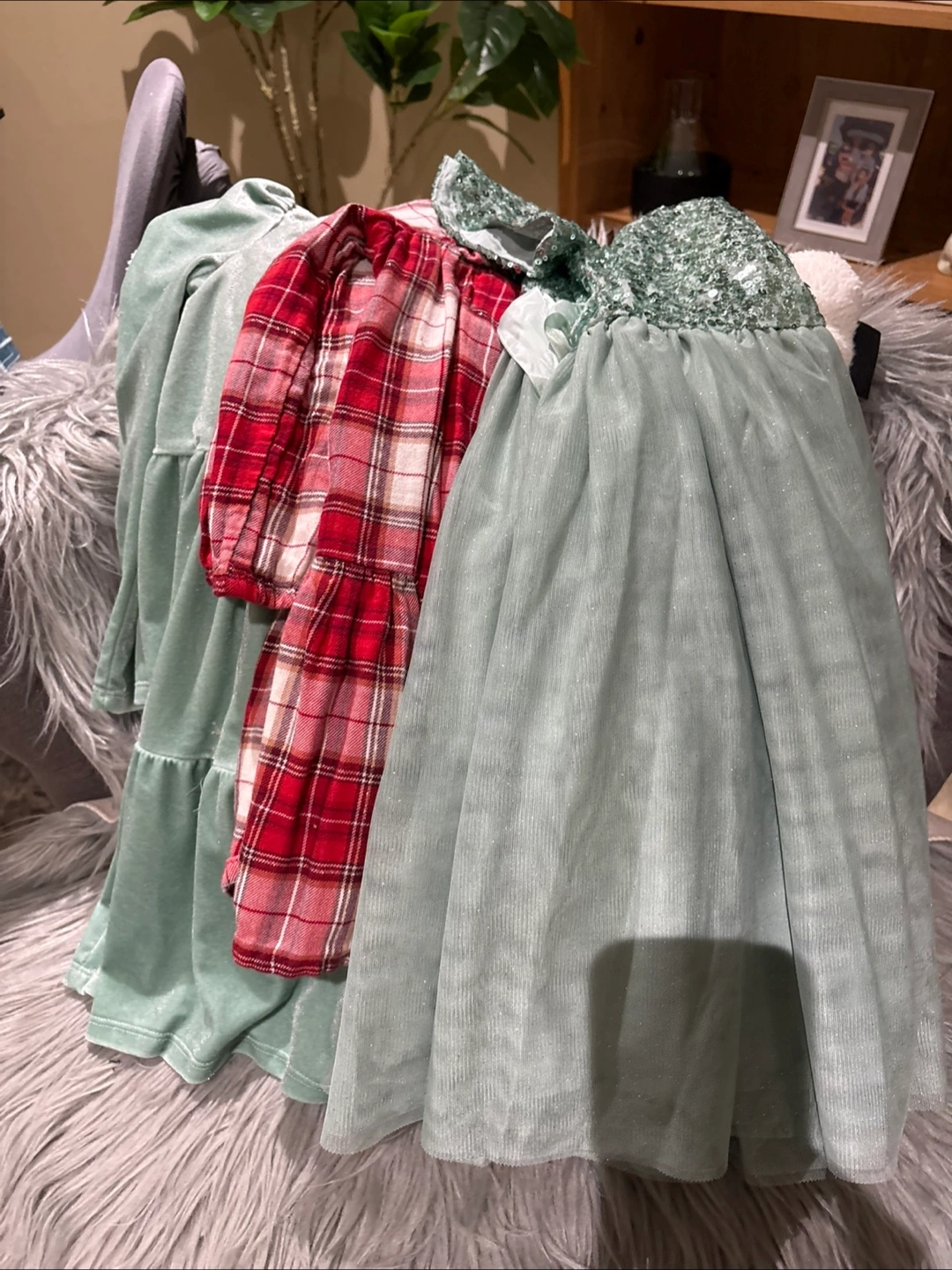 A few dresses available. One dress appears to be red with a plaid pattern. Another dress is a light green, with sequins on the top and a layered skirt. One is green in colour and appears to be a velvet material, with a tiered style. With a little imagination, your little one can have hours of dress up fun.