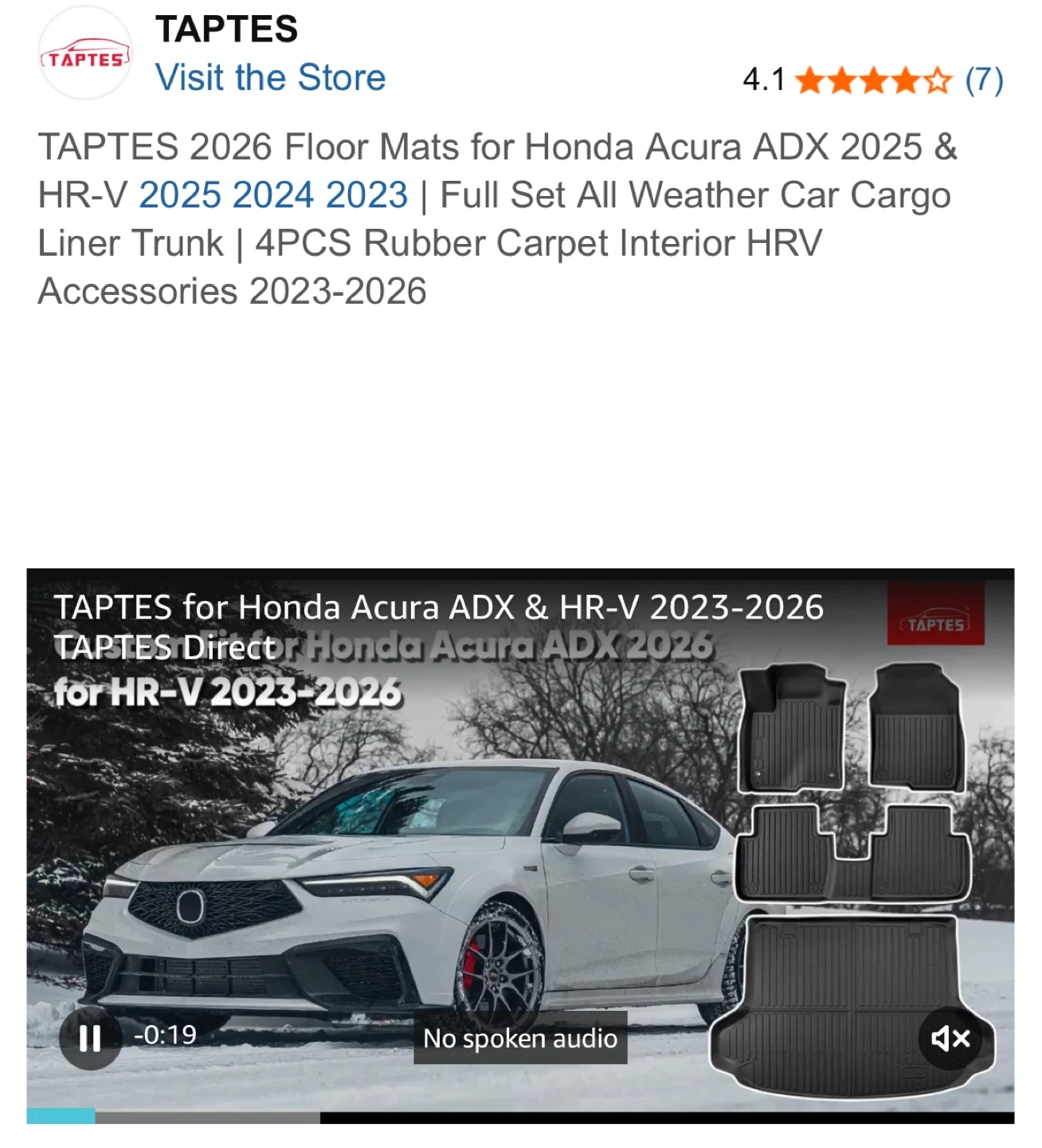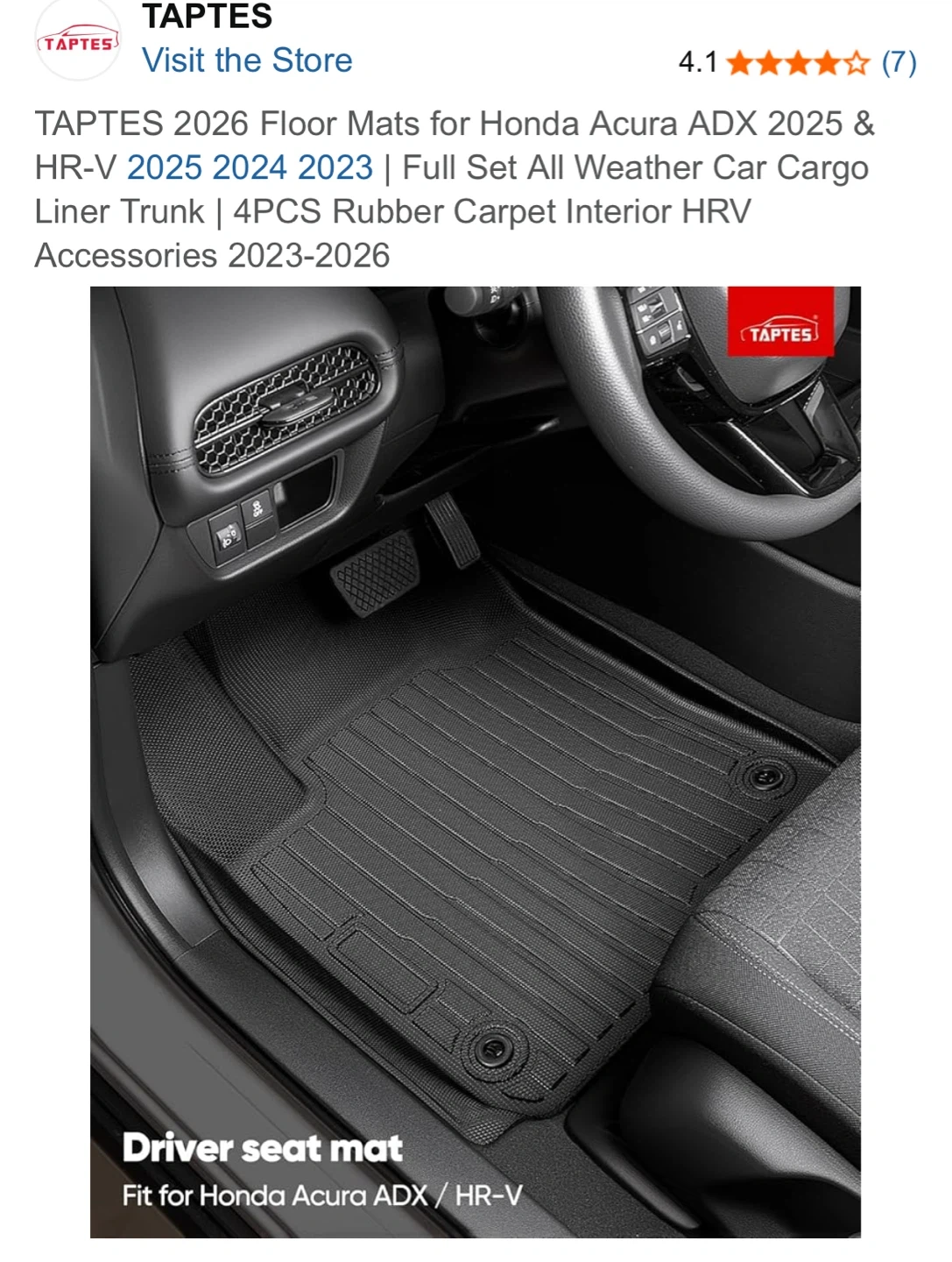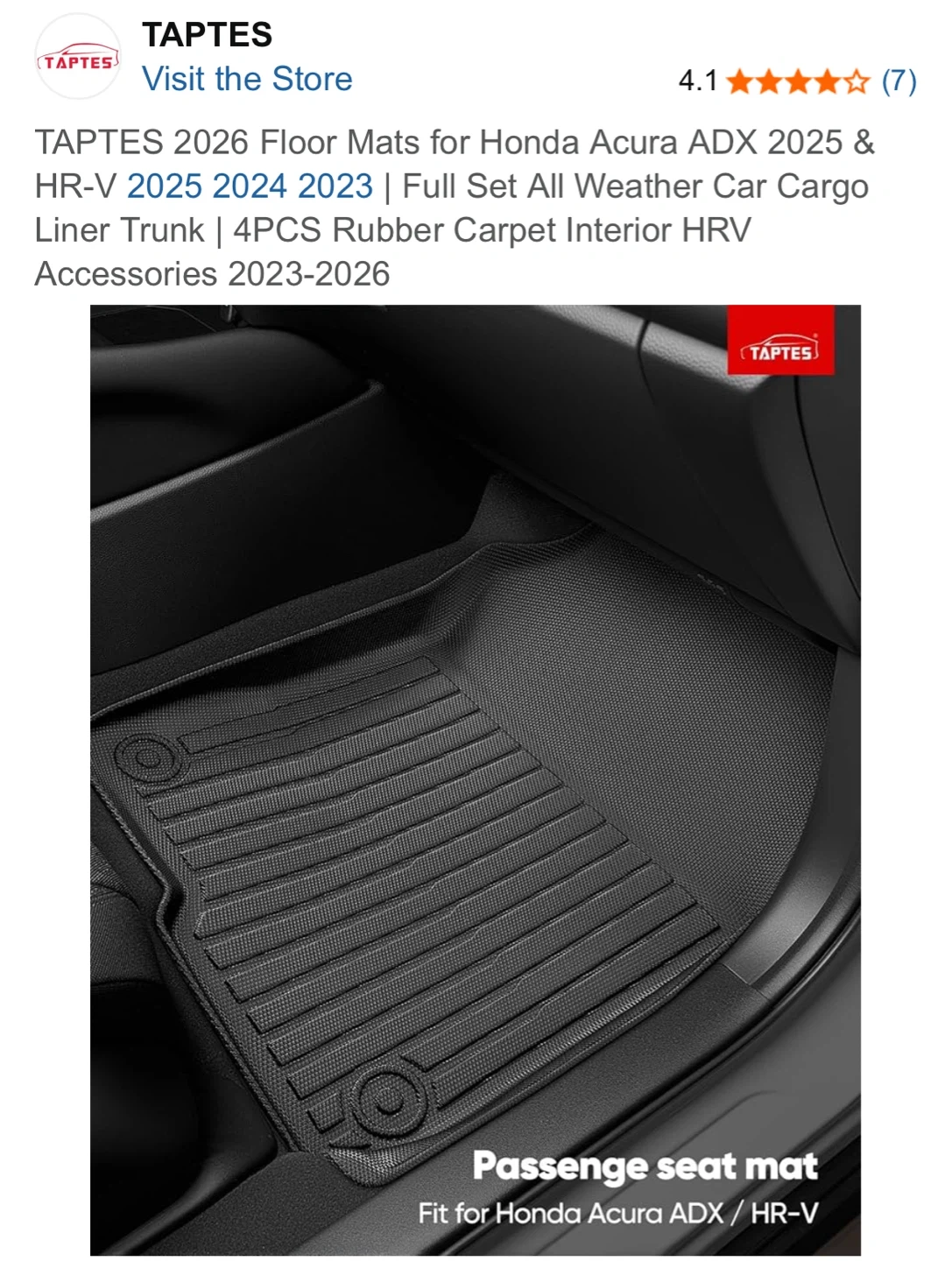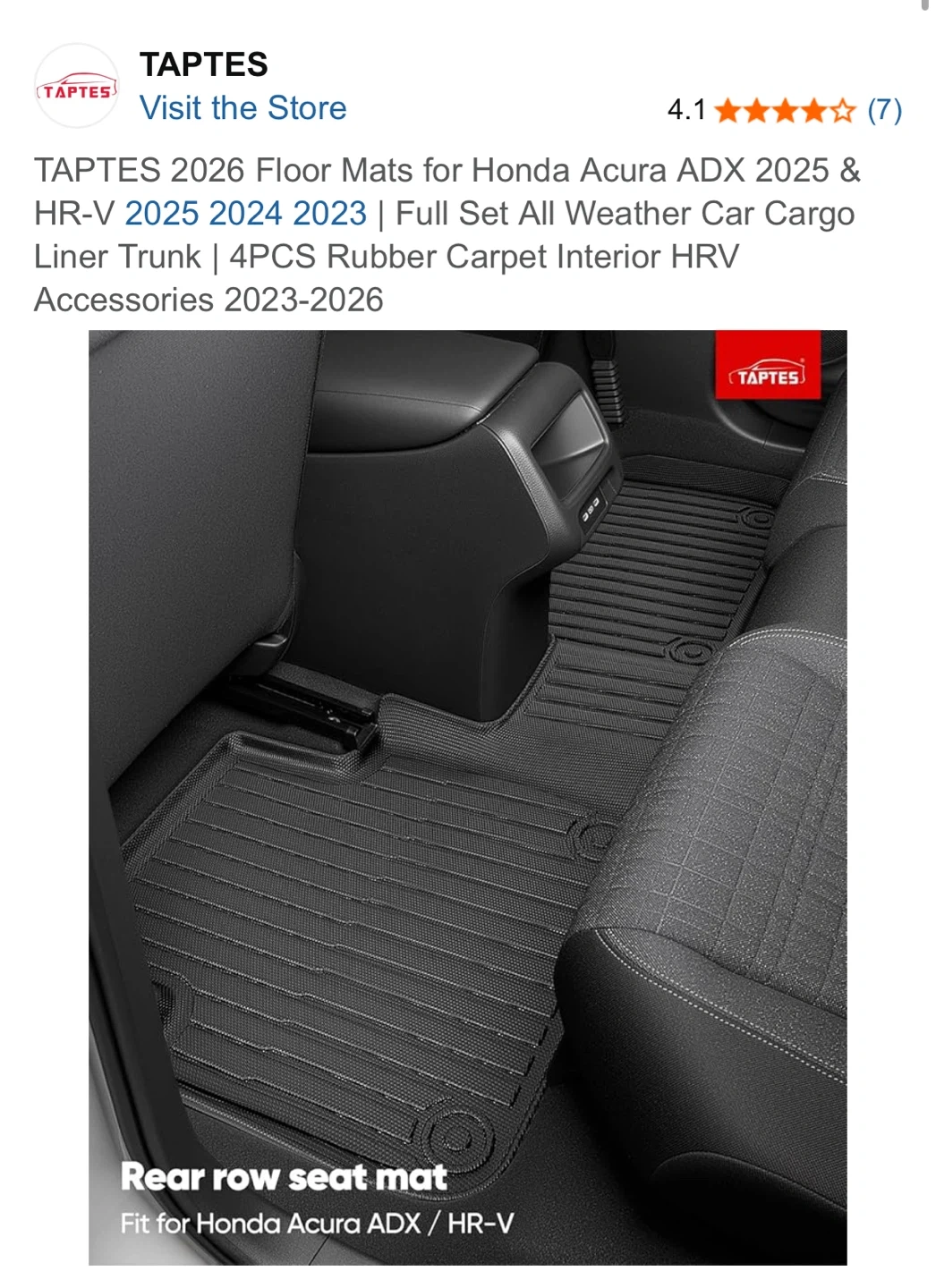 This is a 4-piece set of Taptes all-weather floor mats and a trunk liner. They're made from rubber carpet for interior protection. Designed for Honda Acura ADX (2025-2026) and Honda HR-V (2023-2026) models.