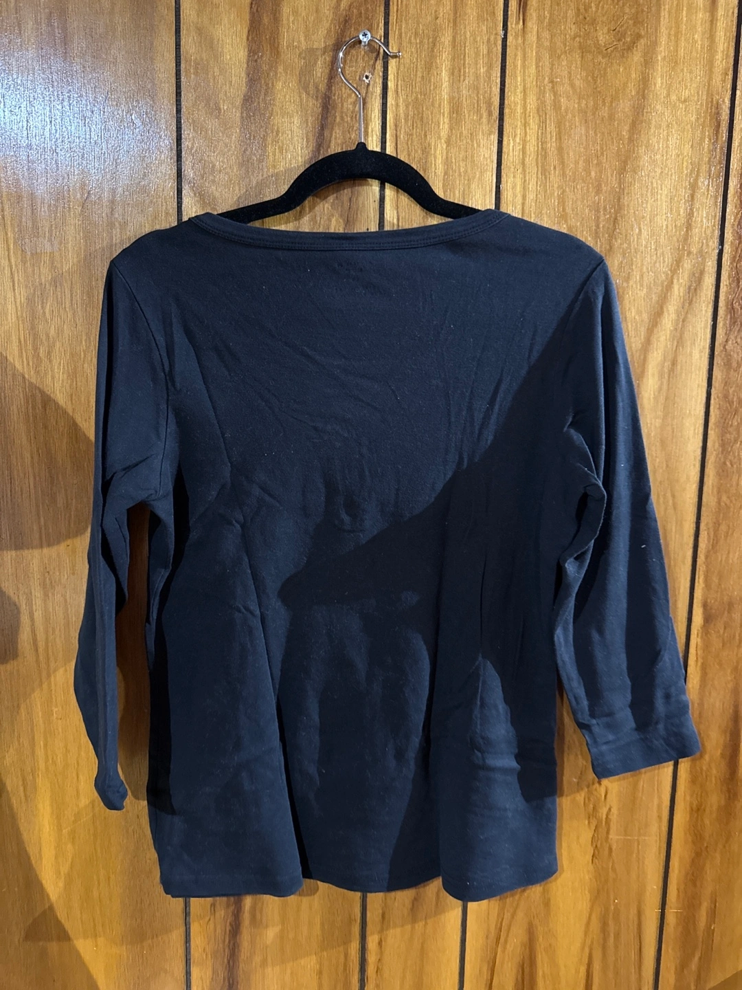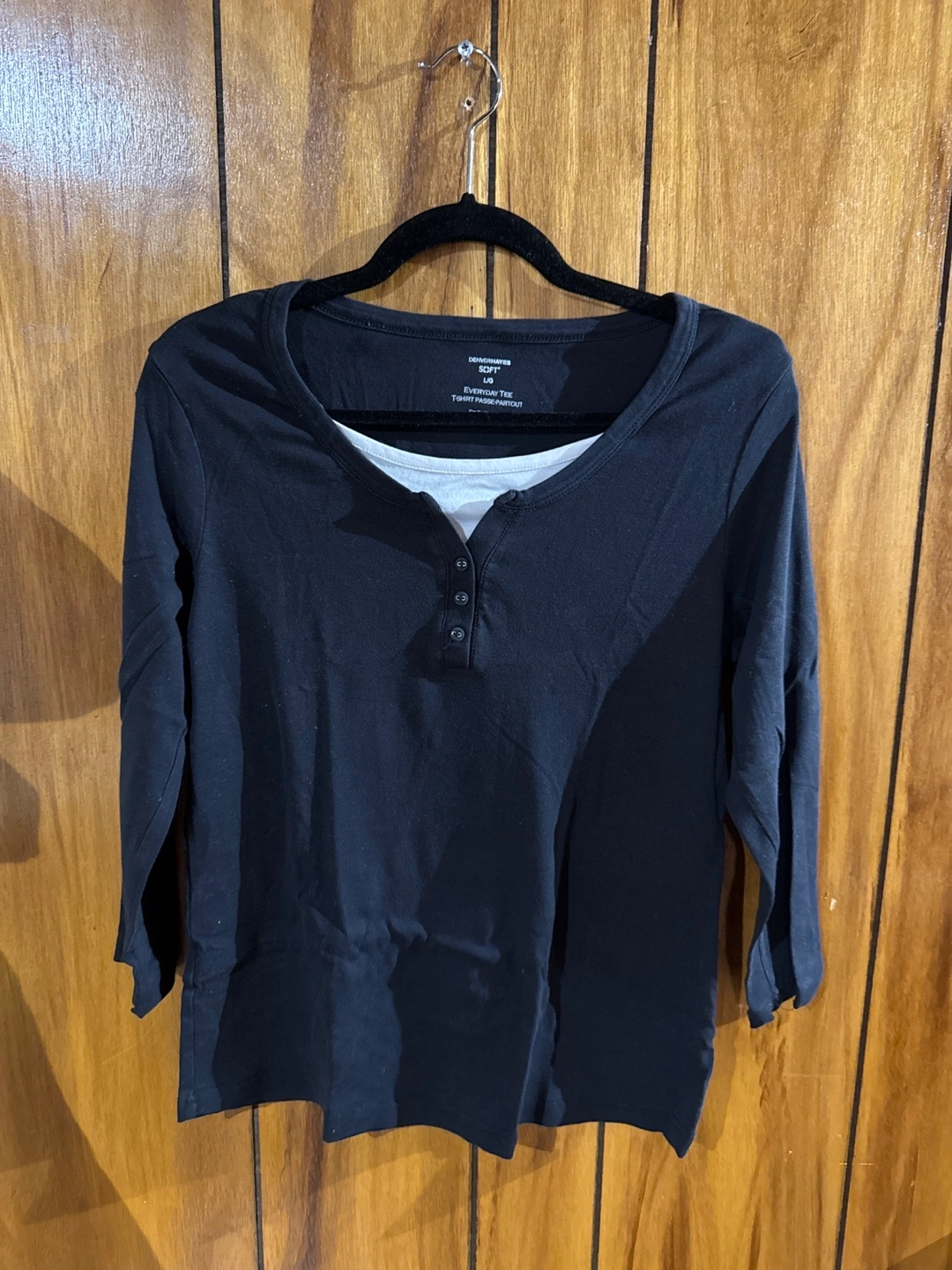 Black layered top. Three-quarter sleeves. Henley-style neckline. Size Large. Comfortable cotton blend.