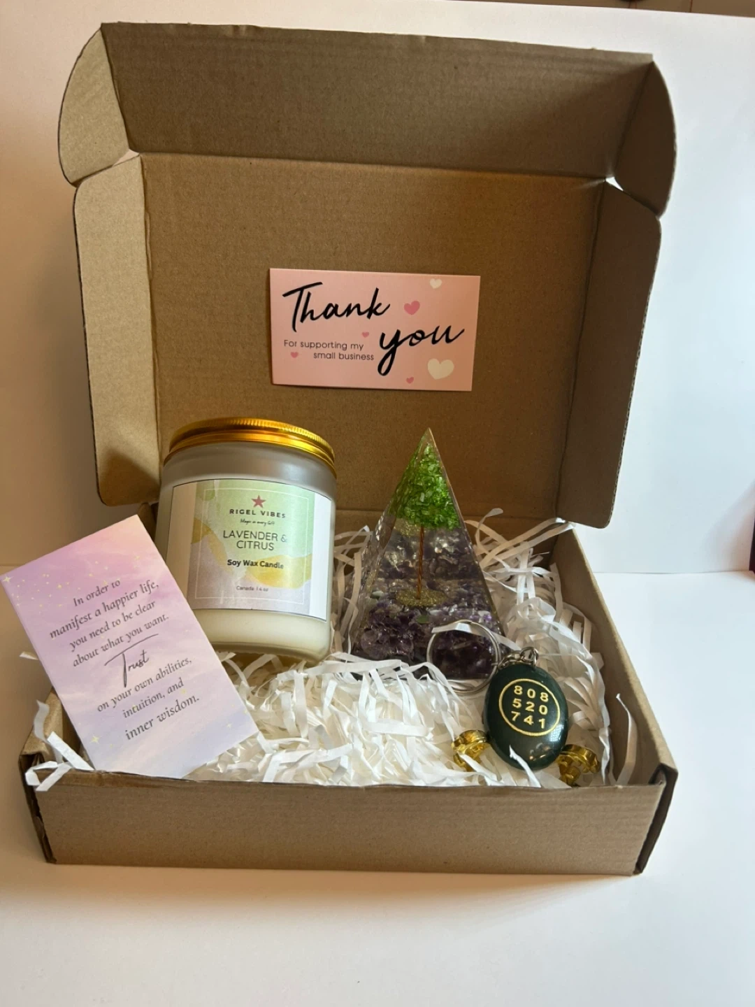 Selling a Rigel Vibes Lavender & Citrus Soy Wax Candle set! This set includes a soy wax candle, a crystal pyramid, and a keychain. Perfect for creating a relaxing and positive atmosphere in your home. The candle is lavender and citrus scented.