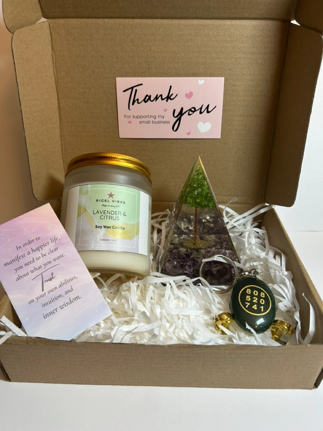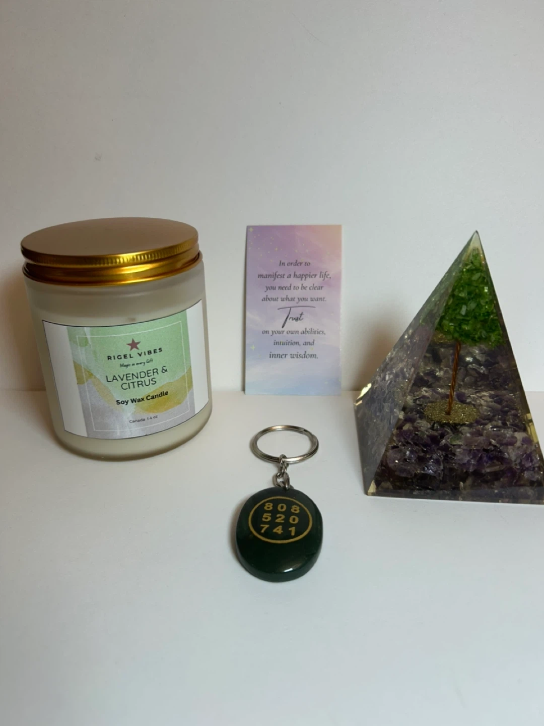 Selling a Rigel Vibes Lavender & Citrus Soy Wax Candle set! This set includes a soy wax candle, a crystal pyramid, and a keychain. Perfect for creating a relaxing and positive atmosphere in your home. The candle is lavender and citrus scented.