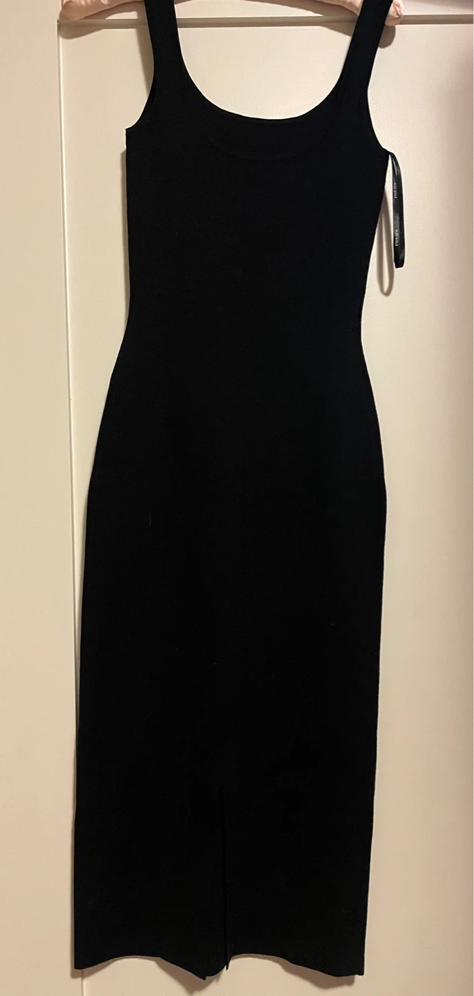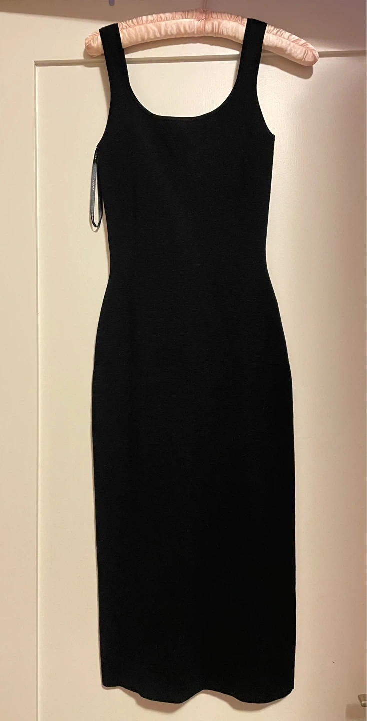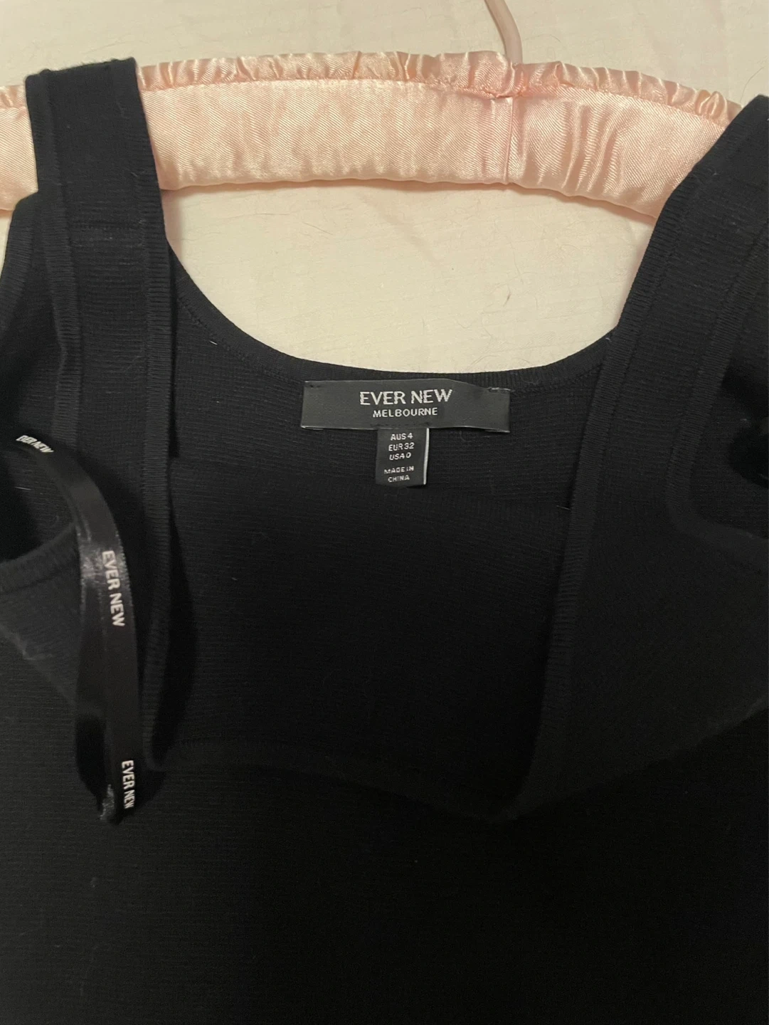 A sleek black midi dress from Ever New. It's a ribbed knit material with a square neckline. Dress length hits below the knee.
