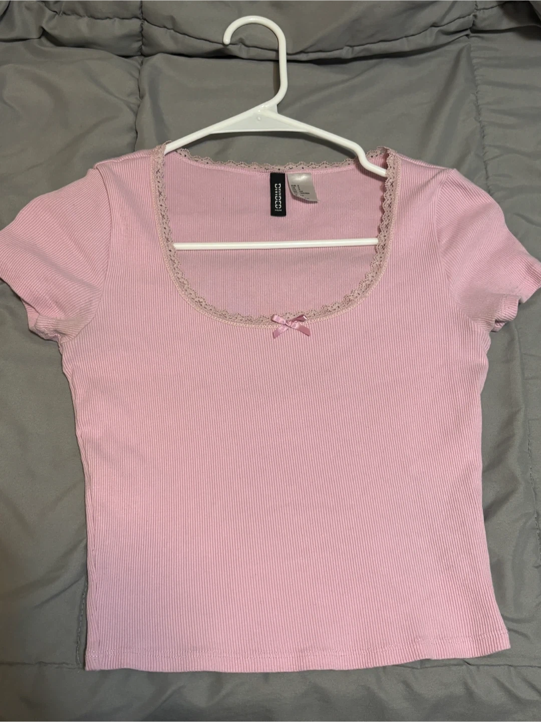 Cute pink ribbed top from H&M Divided! It has a sweet lace trim and a little bow detail. Perfect for adding a touch of sweetness to your outfit