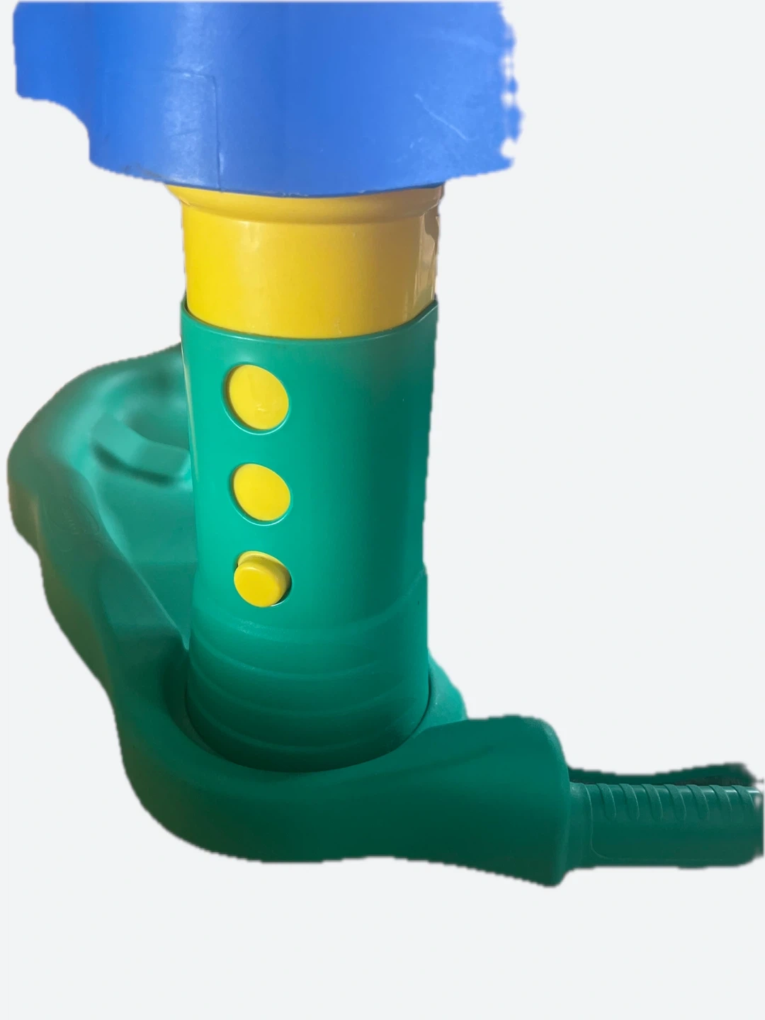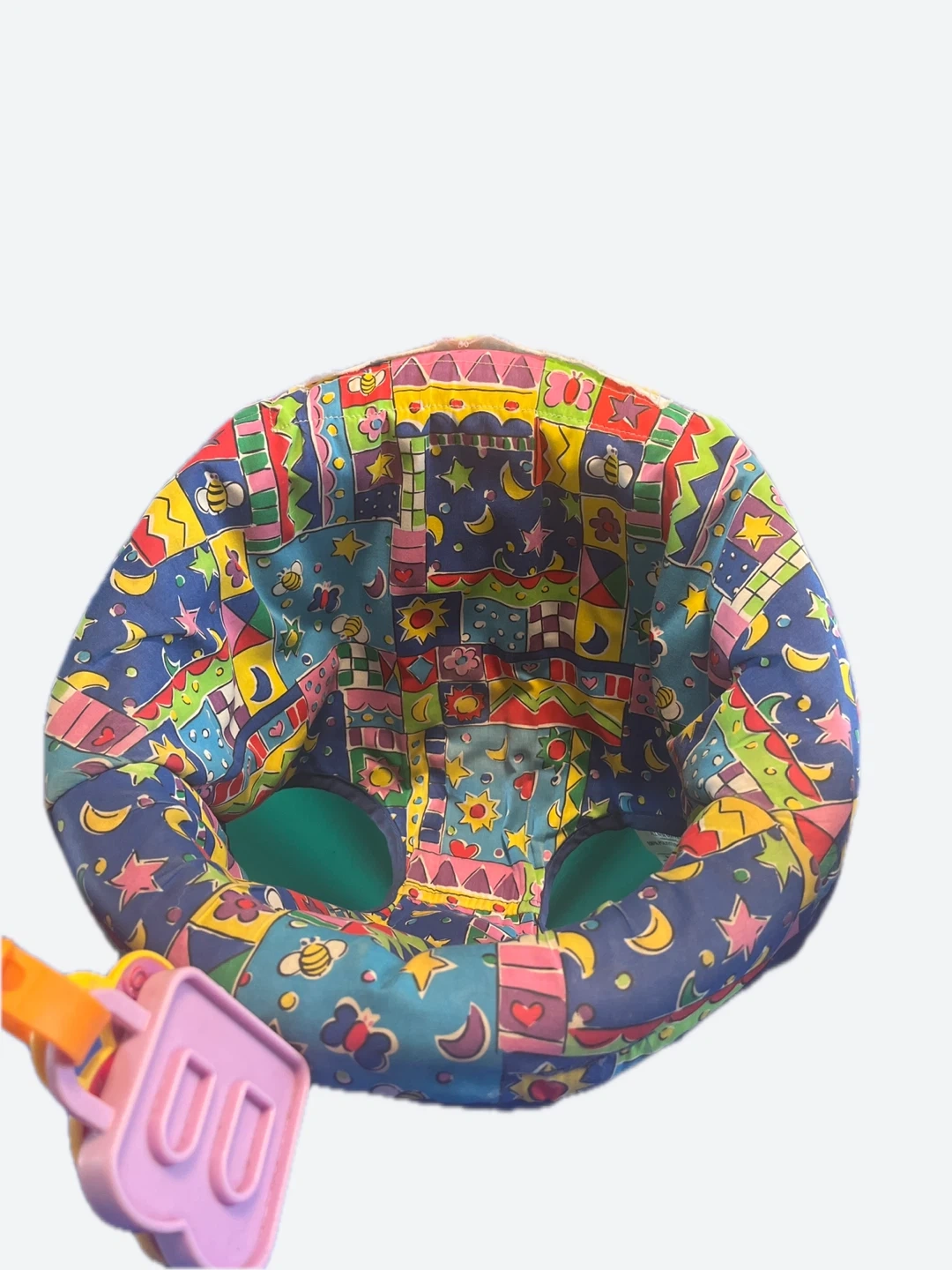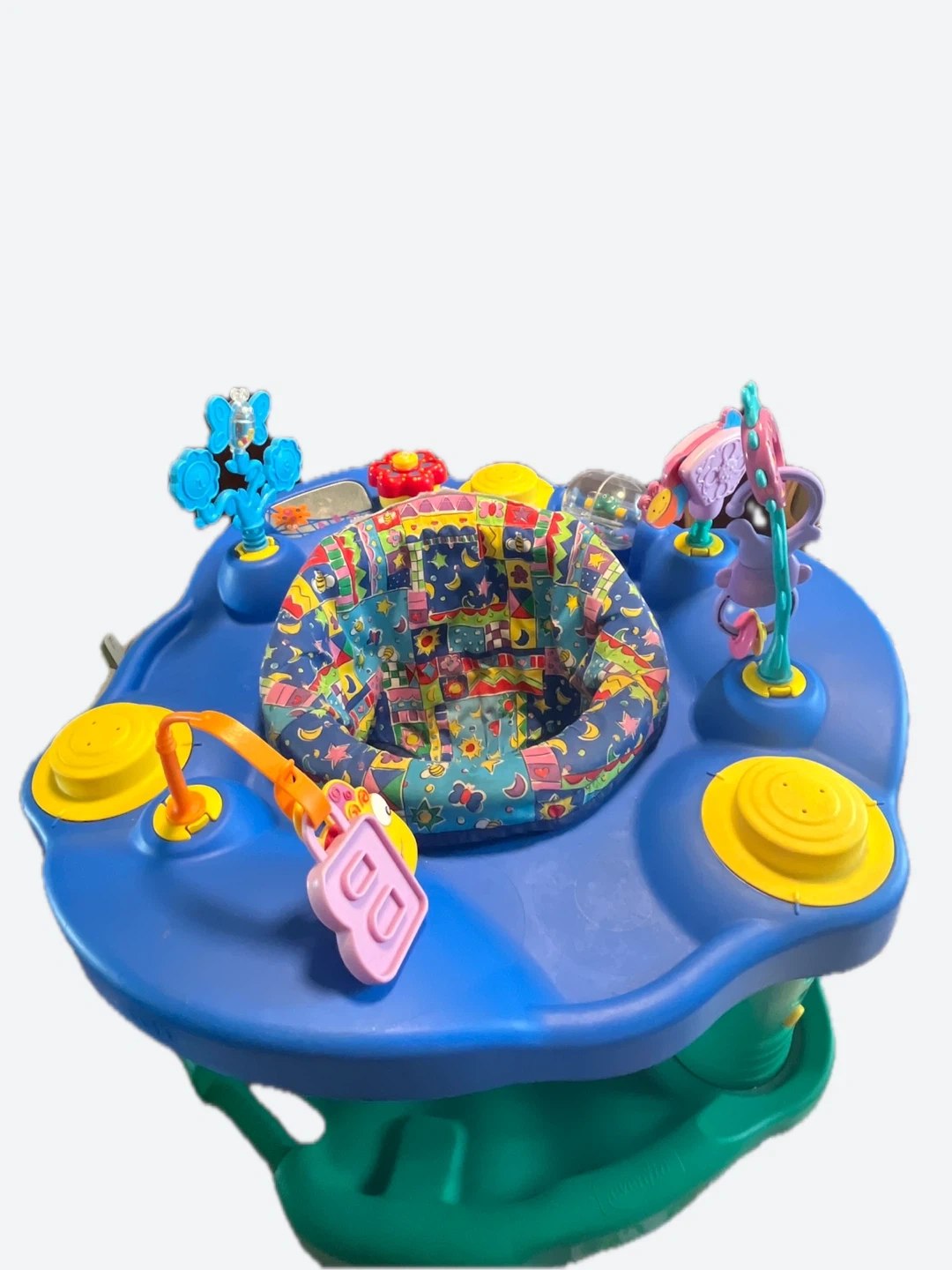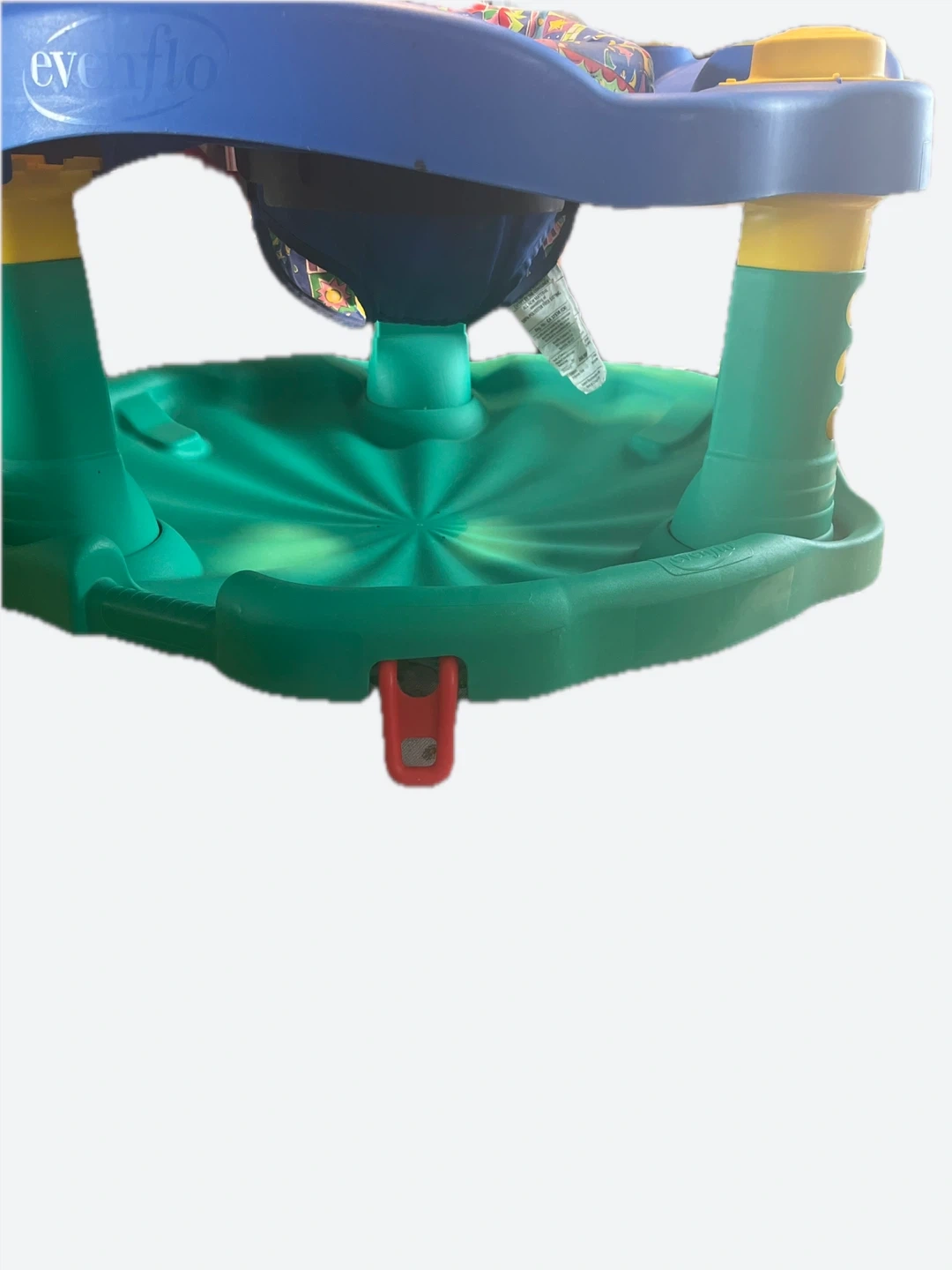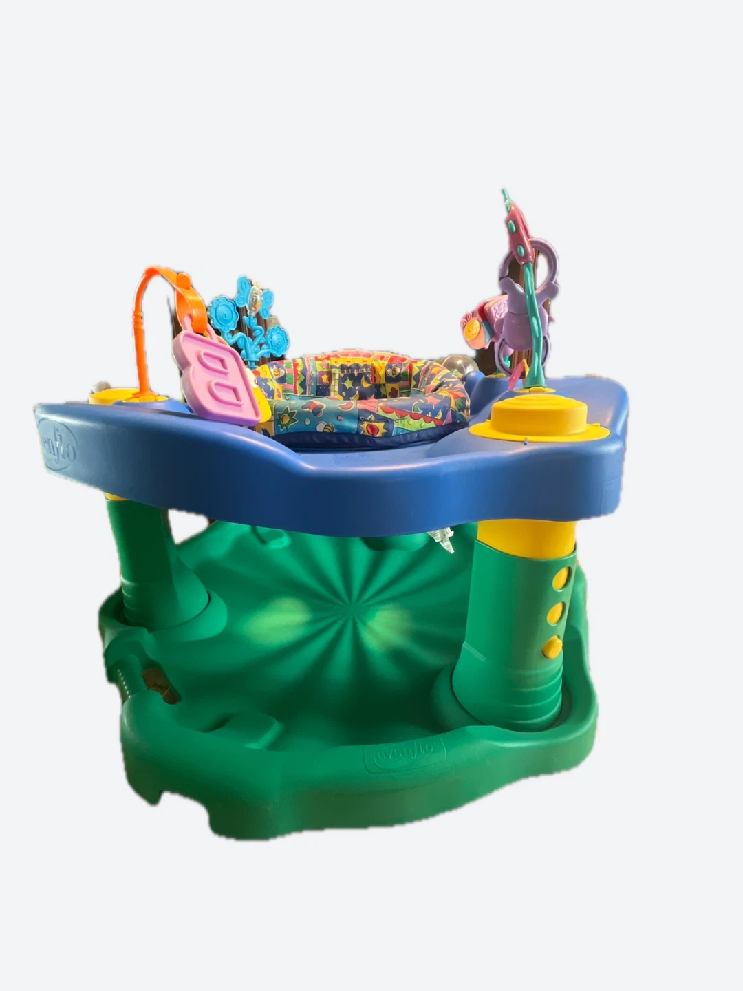 This blue and green Evenflo baby activity jumper has a colourful seat with toys attached. The seat spins, allowing baby to reach all the toys. It's a great way for little ones to play and explore! It’s base can rock or the flip-down legs can stabilize the toy.