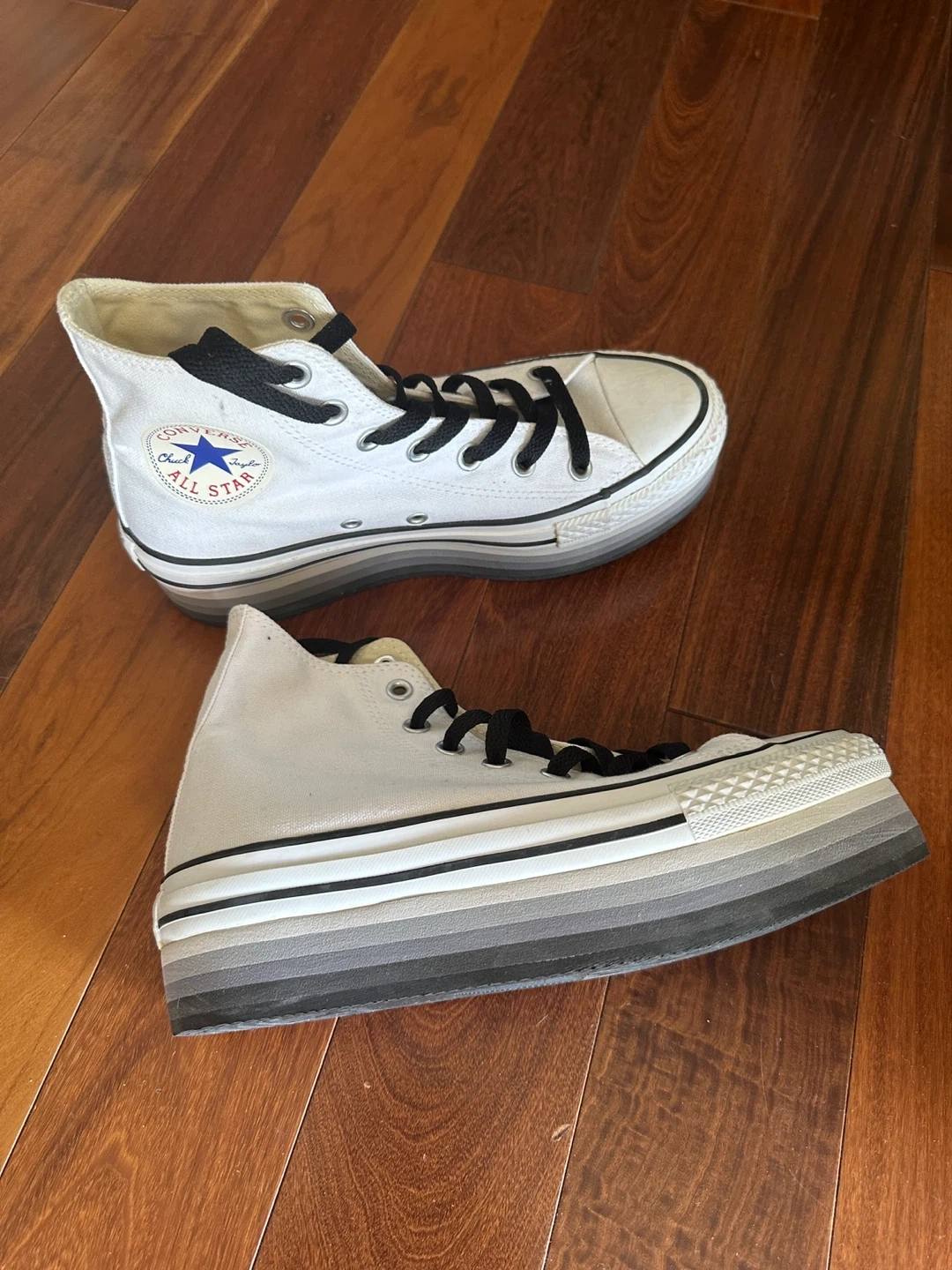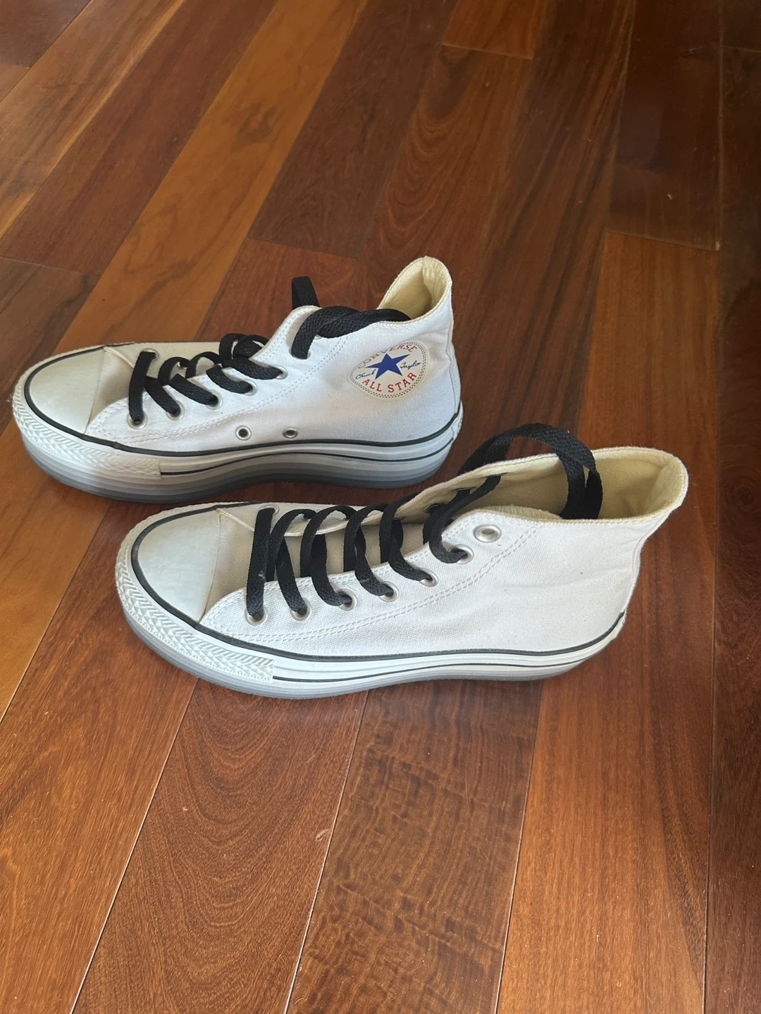 Selling a pair of Converse All Star Lift high top sneakers. They are a women's size 7. The colour is white with black laces. These have a platform sole for a bit of extra height!